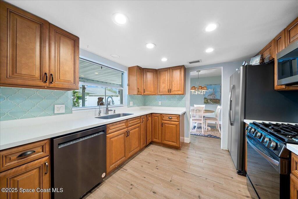 Beautiful beachside remodel in one of the most desirable 'newer' areas of Satellite Beach. The 1983 construction means PVC sewer lines, no cast iron. Wood-looking title flowing through all living areas of the home. Updated Kitchen features stainless appliances. Primary Bedroom features double walk-in closets and gorgeous shower with frameless glass door. Guest Bathroom features subway titled shower and double sink vanity. Exterior painted in 2020, vinyl soffit/facia and gutters in 2020. Easily maintain the excellent curb appeal with (2020) irrigation and deep well pump. Roof is three years old. 2025 new impact windows. 2022 natural gas tankless hot water heater. 2022 natural gas cook top/stove. 2024 pavers which allows for three car parking. New salt water pool (2022), with two water falls and island. Excellent insurance rates with Cat5 windows, truss straps and Concrete block construction. Whole house re-insulated in 2017. Awesome corner lot, don't hesitate!