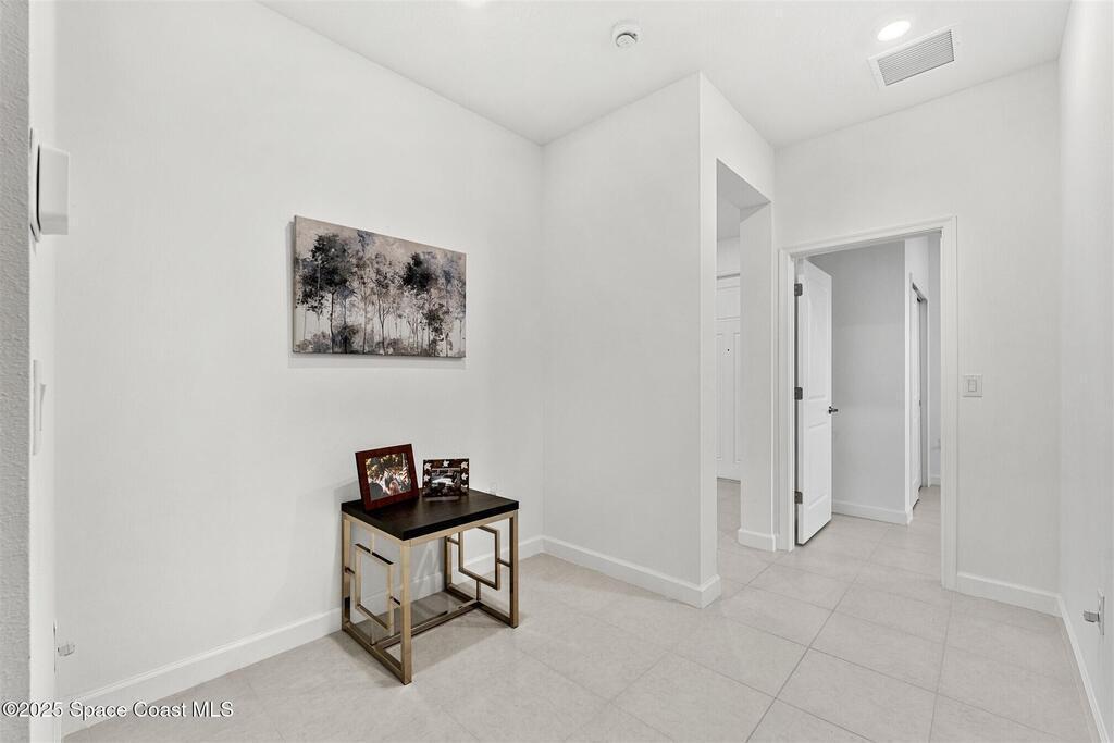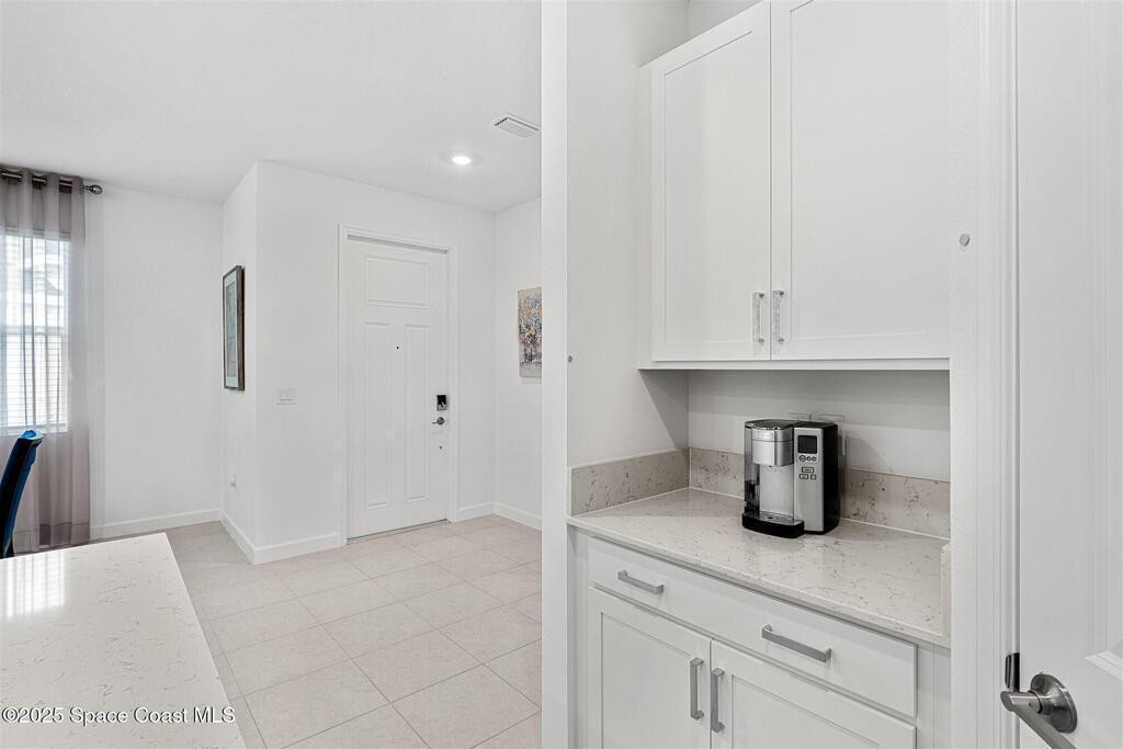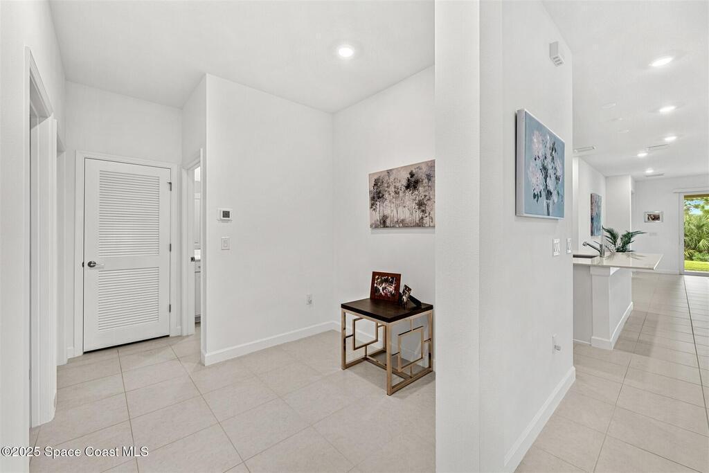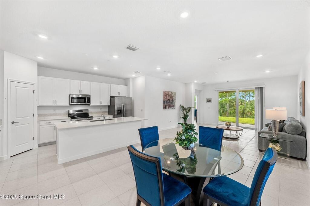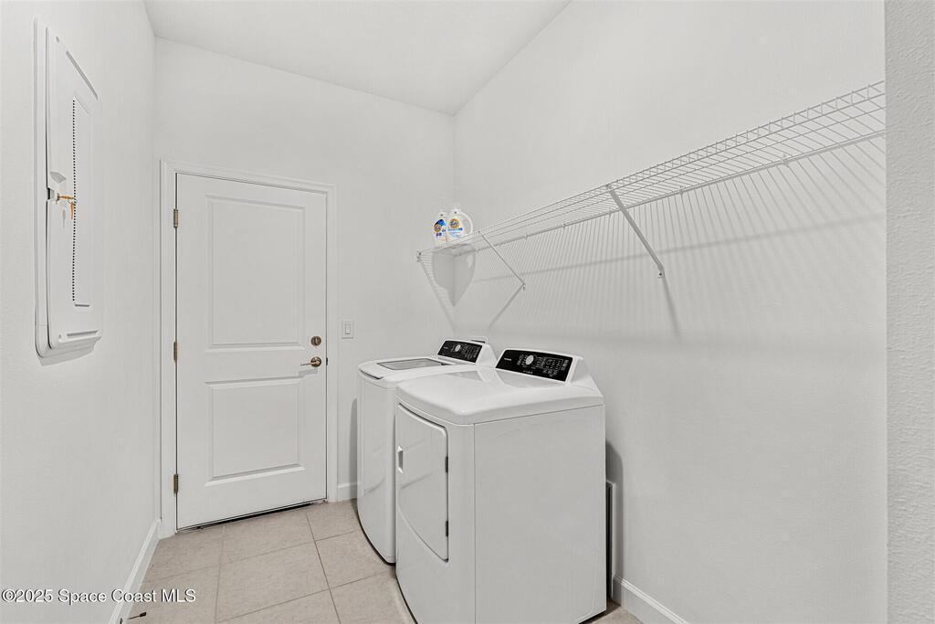 Must See, less than one year old, 1794 sq ft, 3 bedroom plus flex area, 2 bath, 2 car garage home in The Timbers at Everland, the sought after 55+ resort style community in Northwest Palm Bay! This 2024 built meticulous home backs up to a lush private conservation area and includes IMPACT WINDOWS and SLIDER, which make hurricane season stress free! Must have features including white kitchen cabinets with marble look quartz counters, tile throughout, and window blinds throughout are included in this beautiful home! All furnishings available for an additional $5,000. Unwind at the brand new private clubhouse, featuring a large heated pool and spa, fitness room, aerobics studio, card room, dog park, putting green, fishing dock, tennis and pickle ball courts, bocce, and even a movie theater! And the HOA covers your home's lawn care! Short car ride to Atlantic beaches! Close to shopping and dining. One hour drive to MCO, cruise port!