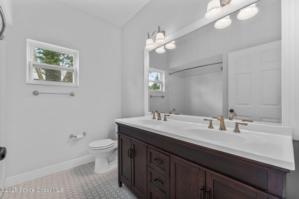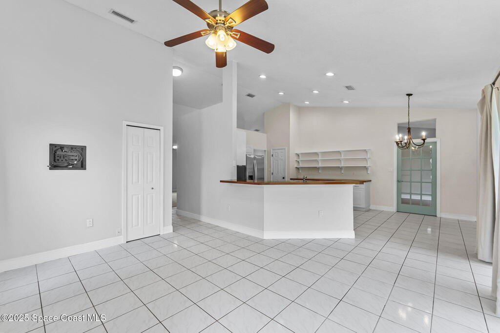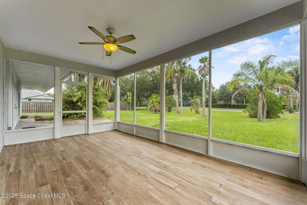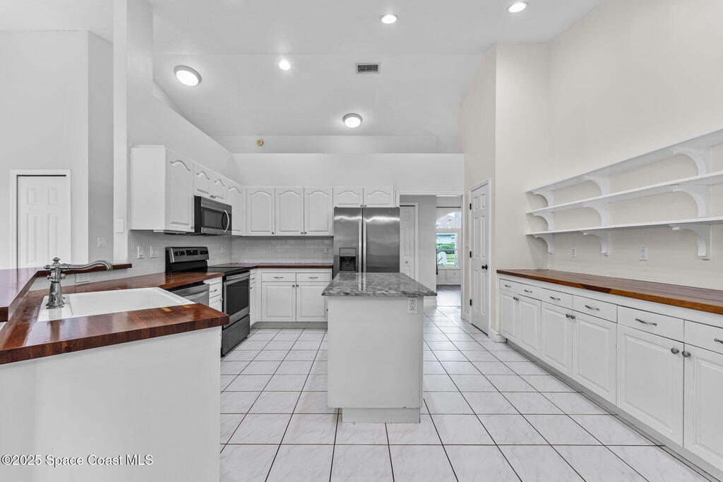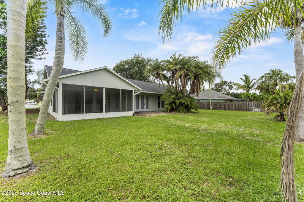Welcome to this beautiful Merritt Island home featuring cherry butcher block countertops, stainless steel appliances, and a granite-topped island. Double doors open to the spacious master suite with a luxurious bath offering a stand-alone tub and dual cherry vanities. Enjoy formal living, dining, and family rooms plus an enclosed sunroom--perfect as a workout space or playroom. Freshly painted inside and out with impact windows, this home sits on a .34-acre lot with a large backyard, patio for outdoor dining, and plenty of room to add a pool. Come see this move-in ready gem today! Roof 2021, water heater 2023, Vinyl plank in master and living room. New Carpet in bedrooms 2 & 3. Tile located in kitchen, hallways, family and bathrooms.
