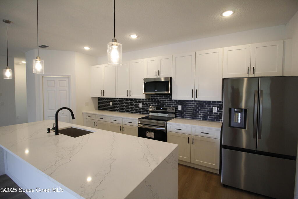 OFFERING 50% OFF FIRST MONTHS RENT! Beautiful brand new home located in South West Palm Bay close to Bayside Lakes! The features of this home include four bedrooms, three bathrooms, inside laundry room, living room and dining room. The island kitchen has quartz countertops, stainless steel appliances, white shaker cabinets, pendant lights and pantry. The owners suite includes double sinks, walk-in shower and a spacious walk-in closet. Home also includes a covered patio overlook the backyard. No Carpet! Make your appointment today!