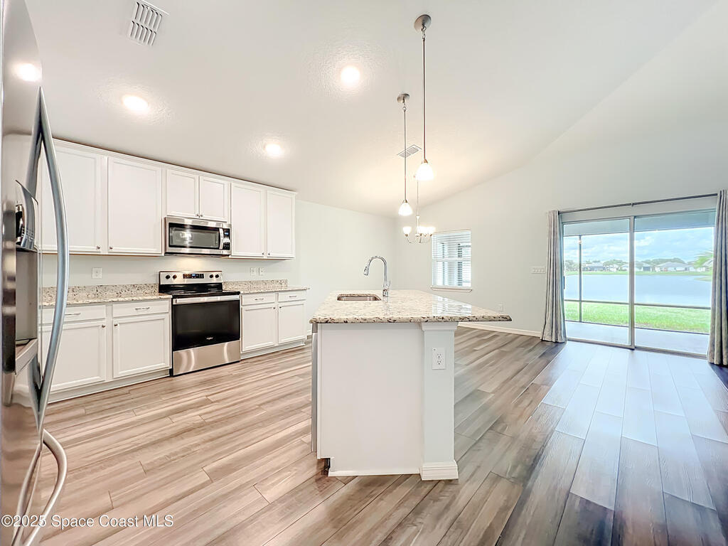 Fantastic Lakefront four Bedroom, two Bathroom, two car garage , CBS home in sought after Bayridge community! Why wait for new construction?Built by Holiday in 2020 with tons of upgrades, this home is move in ready. Fantastic open floor plan with great lake views combined with four bedrooms make this home perfect for families that need a little extra space. Primary suite features an amazing bathroom, door to back patio and a walk in closet. Chefs will love the kitchen with stainless steel appliances, center island with sink, upgraded cabinets and granite countertops. Close to dining and shopping in nearby Bayside Lakes, this south west Palm Bay home is a dream come true. Outside Air Conditioner just replaced, full gutters, irrigation system, fully landscaped and hurricane shutters all included. Why wait ?