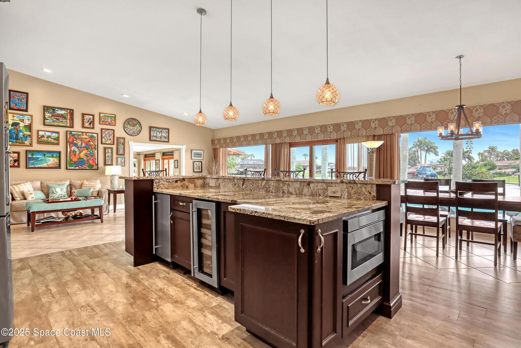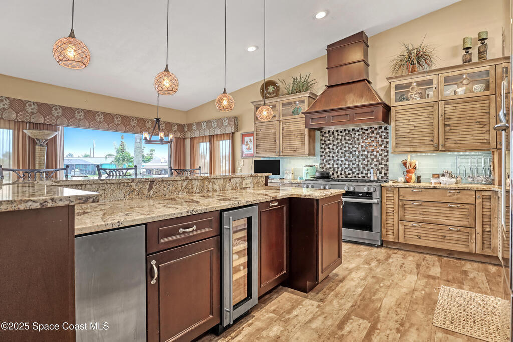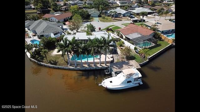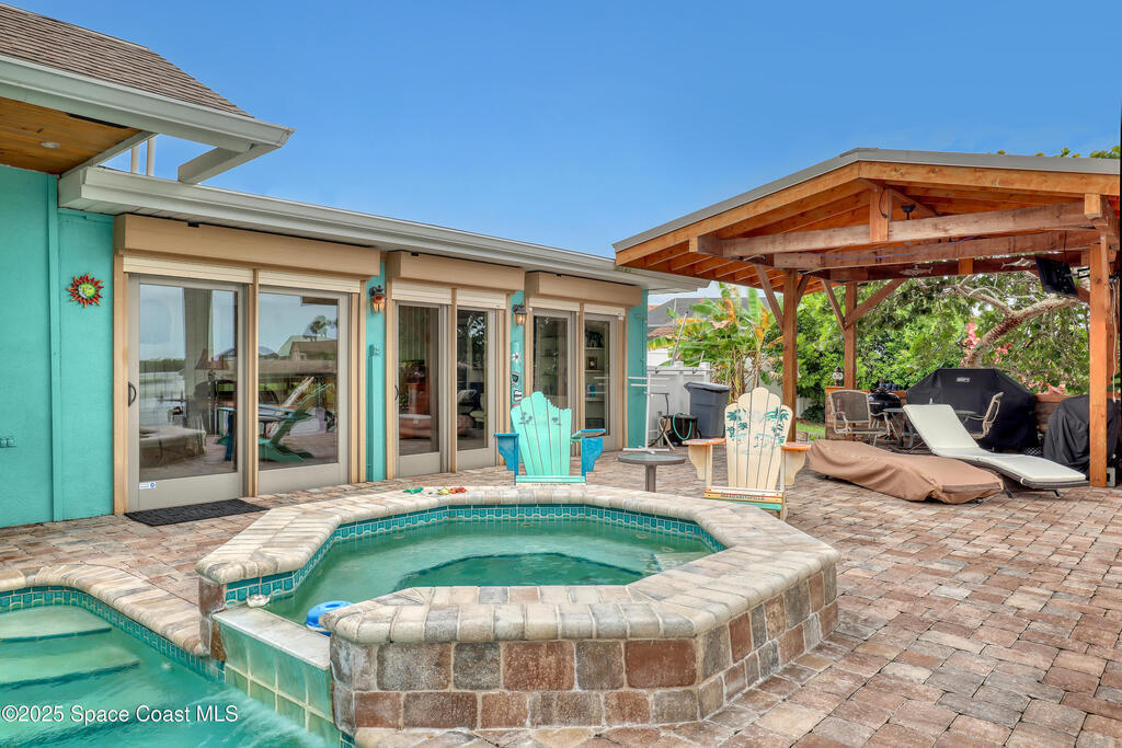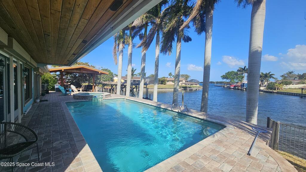 Experience unparalleled water views from this stunning pool home, ideally situated at the intersection of two canals. It features a covered boat dock with a lift, as well as a jet-ski lift, making it an ideal spot for water enthusiasts. The outdoor area is a true oasis, complete with a tiki covered patio, a sparkling pool, and a relaxing hot tub, all surrounded by majestic queen palm trees. Inside, the kitchen is a chefs dream equipped with a natural gas commercial range and oven, a beautifully vented ornate hood, custom cabinetry and gorgeous granite countertops. The kitchen is seamlessly open into the dining and living room areas, offering panoramic views of the water and pool. There are 2 master suits, each equipped with sliding doors that take you outside to a brick paver patio area. This home features Anderson Hurricane Windows and also full hurricane protection with electric powered hurricane shutters. Newer roof as well.