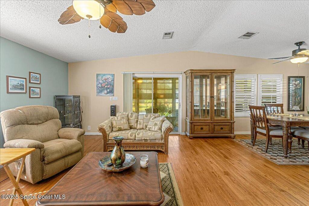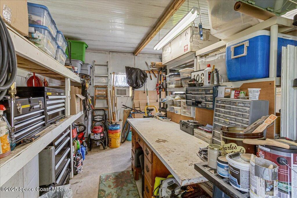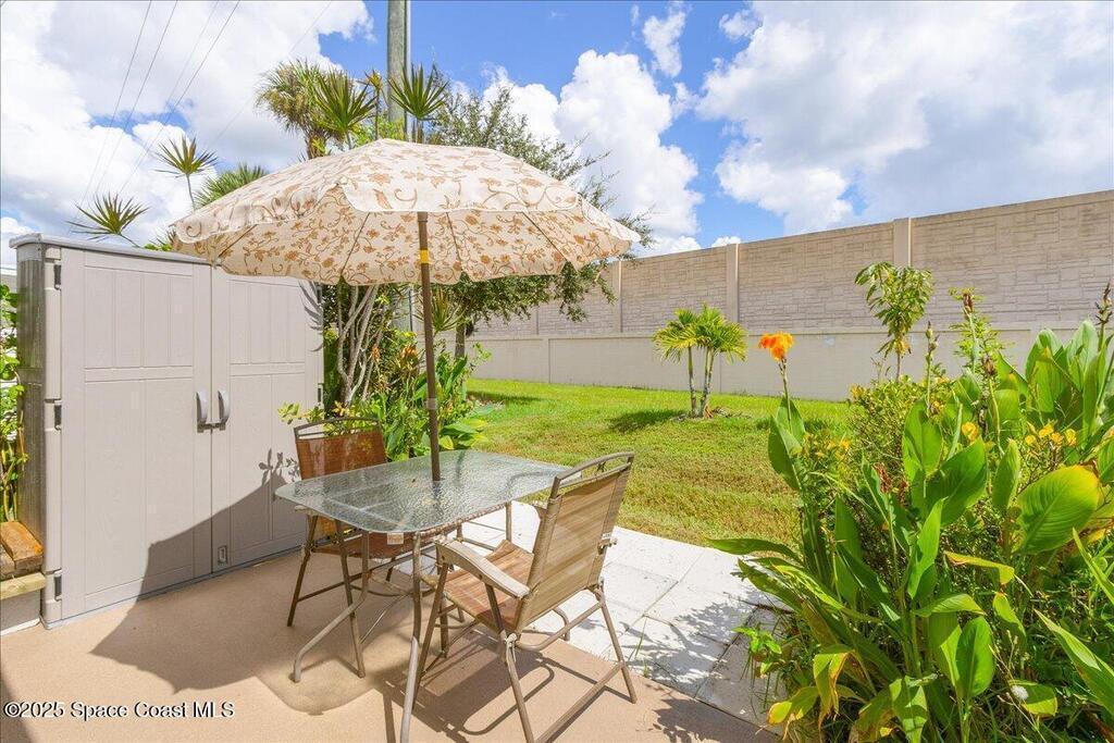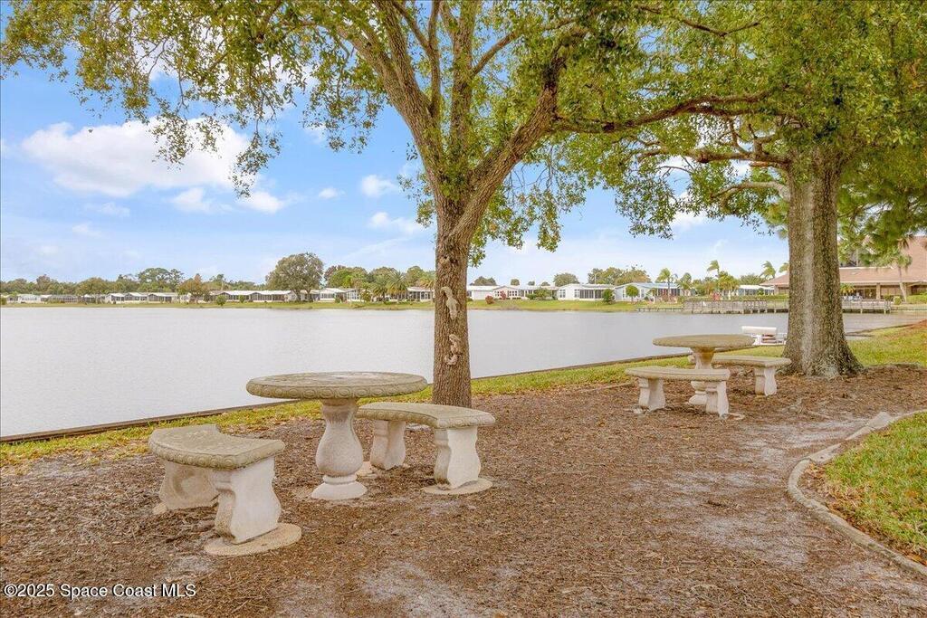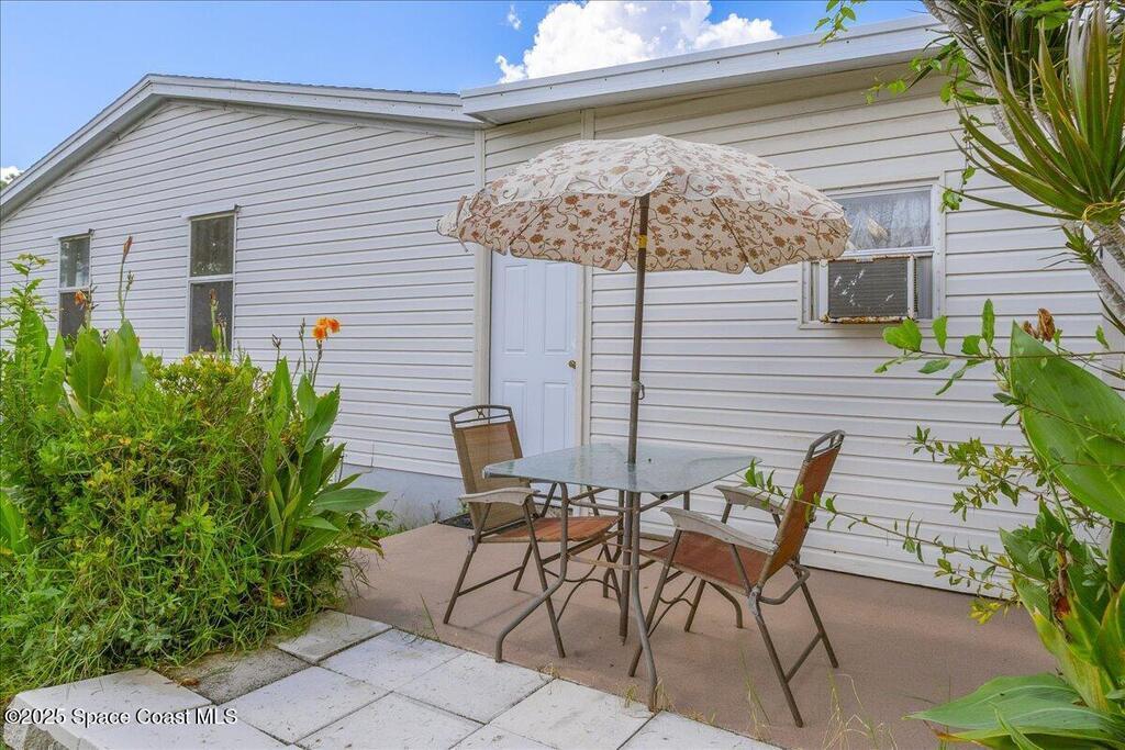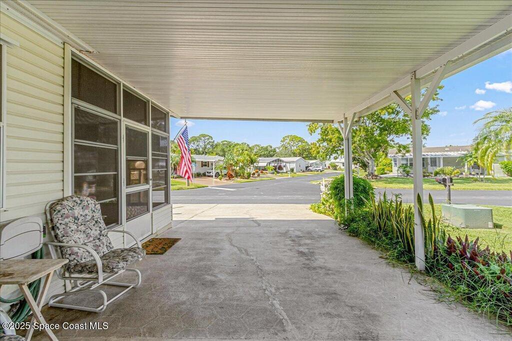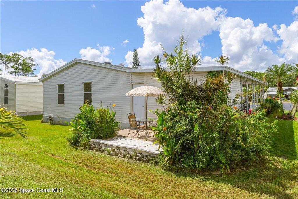 Own your land in this senior community where HOA fees are low and include cable,internet,lawncare and security.This charming 2/2 home has a front and back patio,an oversized.shed and workshop,. Plenty of parking for cars and toys,golfcart,kayak,etc.Community activities aplenty with swimming pool.pickle ball,billiards,plus a card room,just to name a few.Watch rocket launches from your yard.....check it out,you're going to love it!