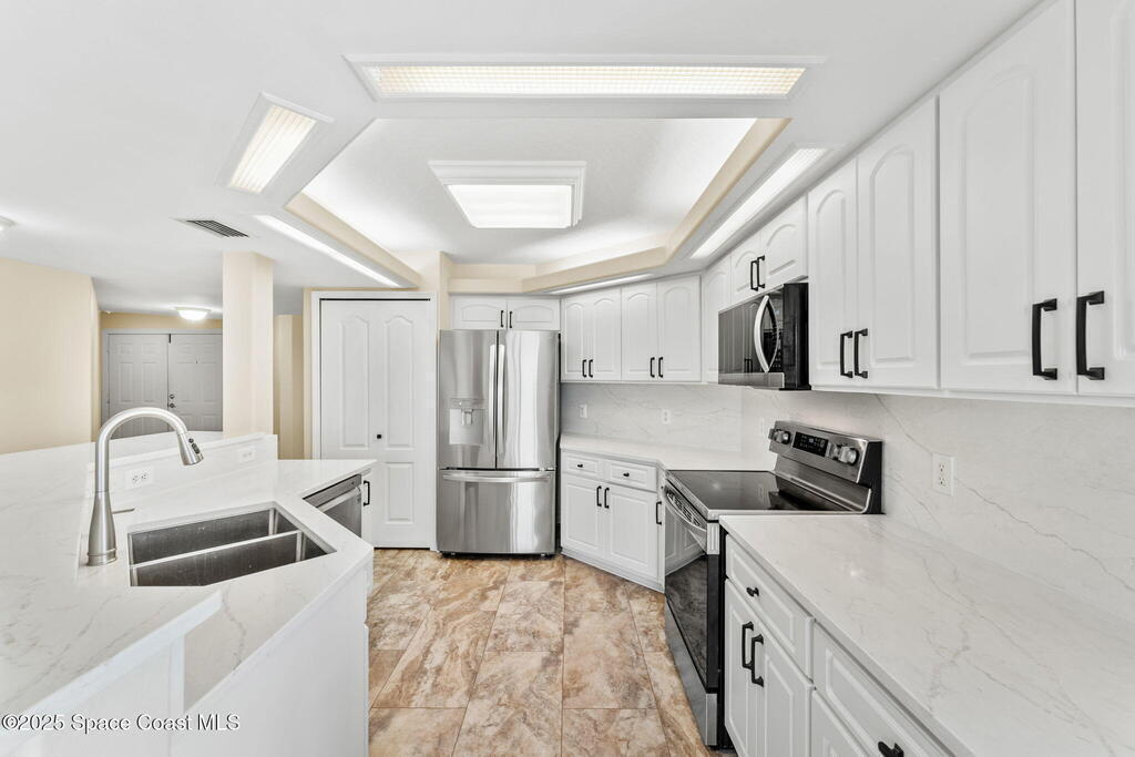 NEW PRICE!!! Welcome to the Harbor Del Rio Community, ideally situated in Central Merritt Island. Featuring three bedrooms, each with private access to the expansive wrap-around balcony (with hurricane shutters for storm protection). The large open-concept design boasts laminate flooring throughout, updated kitchen with new appliances. Primary bedroom offers dual closets, and an en suite with double vanities, a spacious walk-in shower, and a separate garden tub. The kitchen and bathrooms are finished with solid surface countertops, complemented by window treatments throughout and a generous laundry room. The community provides amenities such as a Pool/Spa, Gym, and Clubhouse. It's conveniently located by the NEW hospital being built and minutes away from shopping, dining, and the world-renowned Cocoa Beach.