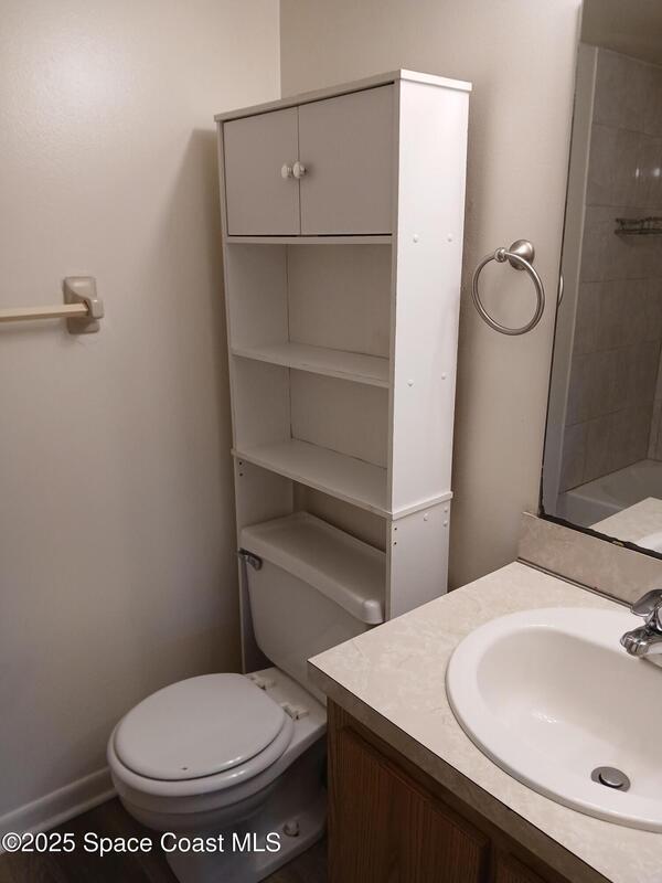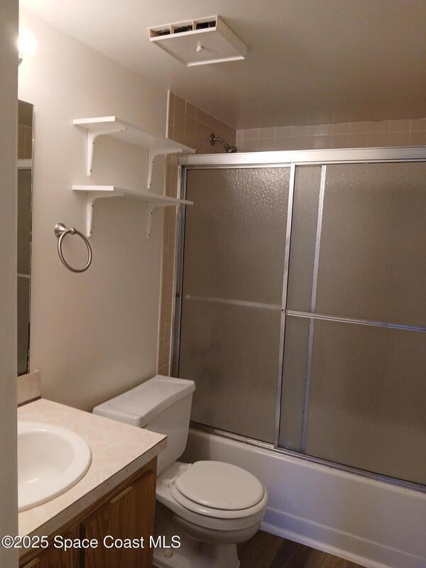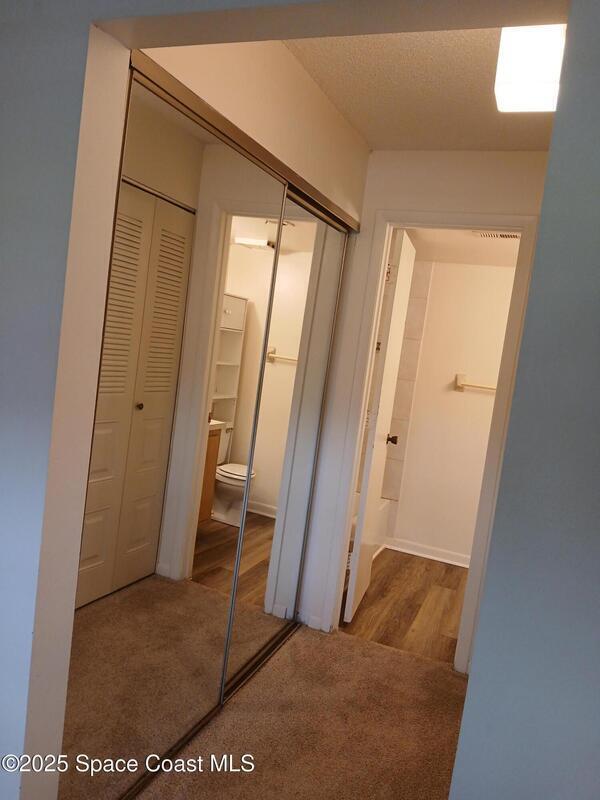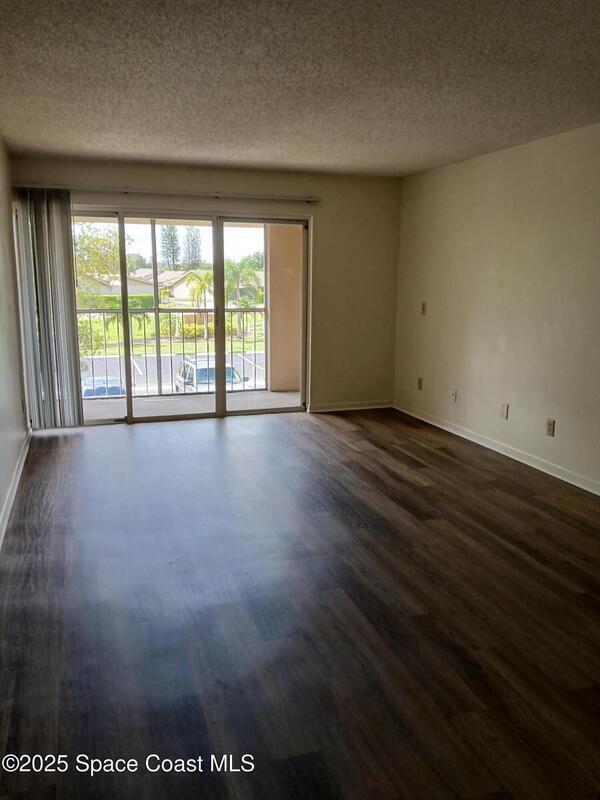 Beautiful 2BR/2BA second floor condo in central Palm Bay location. New plank flooring and carpeting in the bedrooms enhances this well-maintained unit. View from the screened balcony is to the west so you don't miss any glorious sunsets. HOA fee covers everything except your FPL bill. Great value for your dollar, be you a 1st-time buyer, a retiree, or an investor.. Solid block construction with block walls between each unit and cement between the floors. New A/C May 2025.