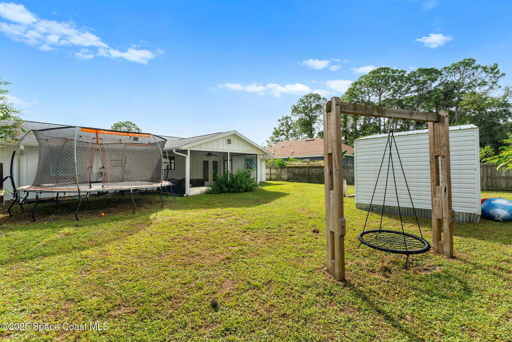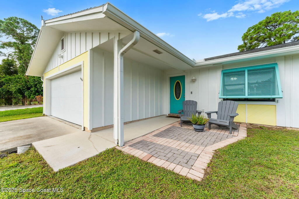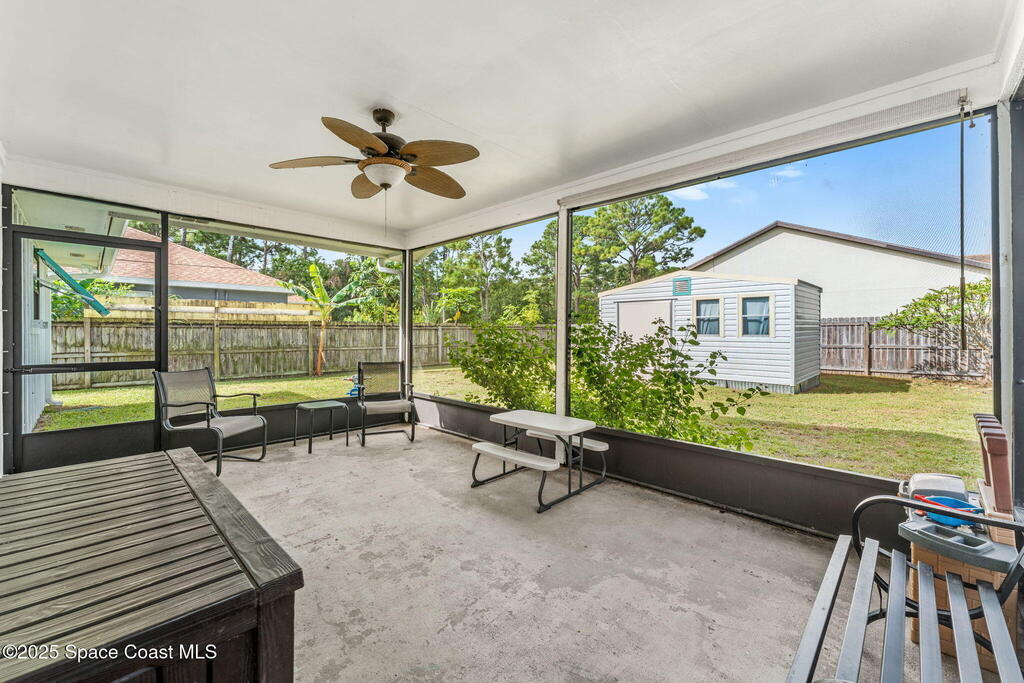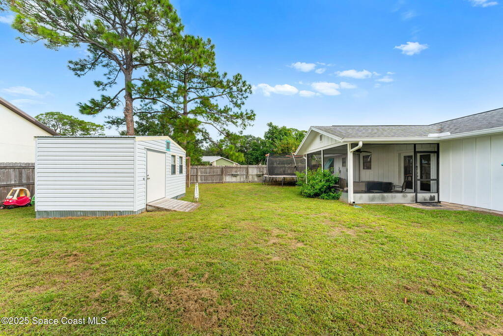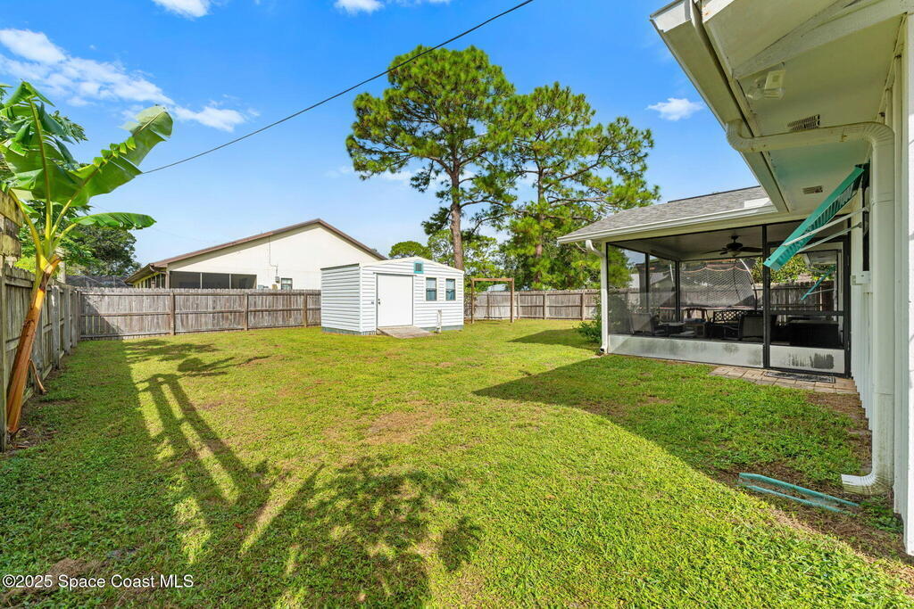 Set on a corner lot in NW Palm Bay, this 1,513 sq ft residence combines open, airy living with thoughtful updates and inviting outdoor spaces. A split floor plan and vaulted ceilings enhance the sense of comfort, while the primary suite stands apart with a walk-in closet and a renovated en-suite featuring a sleek walk-in shower. Durable vinyl plank flooring and granite countertops add modern appeal, complemented by the security of a 2019 roof. Bahama shutters remain in place year-round, offering shade that helps keep interiors cooler in summer while closing easily for hurricane preparation. The fenced backyard offers both privacy and character with mature avocado and banana trees creating a touch of tropical charm. With no HOA restrictions, the property allows freedom and flexibility. Everyday convenience is close at hand with shopping and dining just minutes away, I-95 access nearby, and the Atlantic shoreline in Melbourne Beach and Indialantic less than a 20-minute drive.