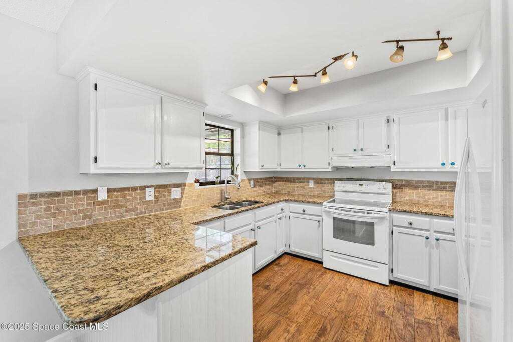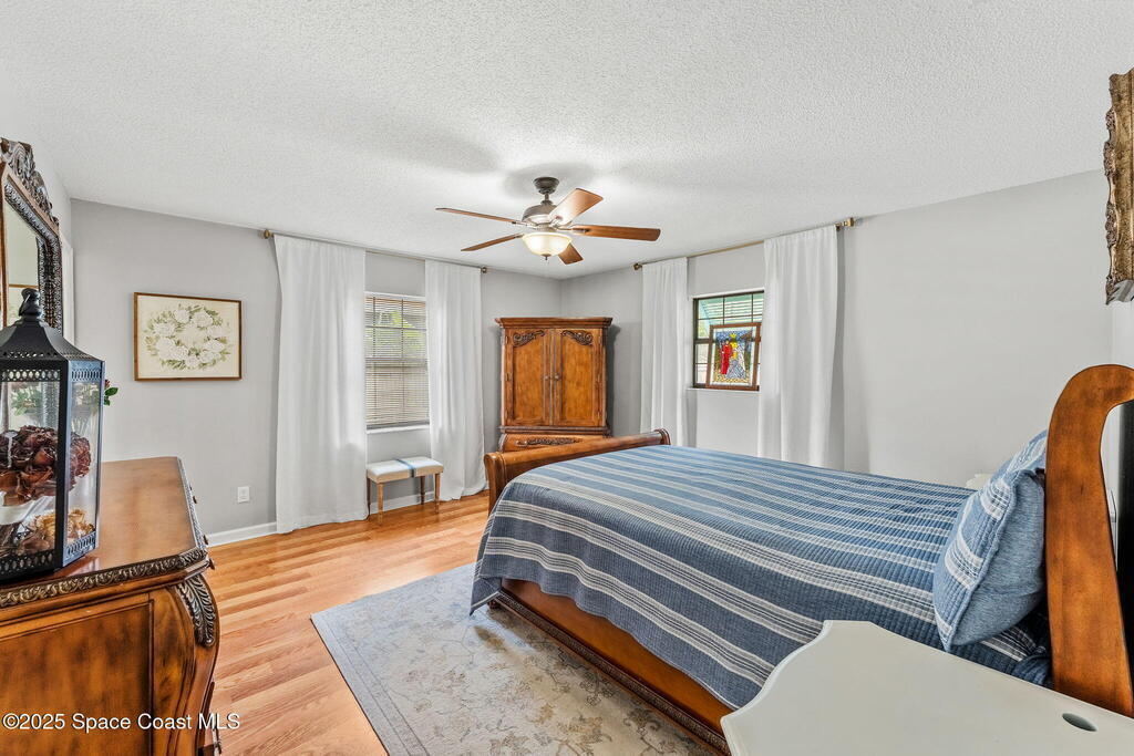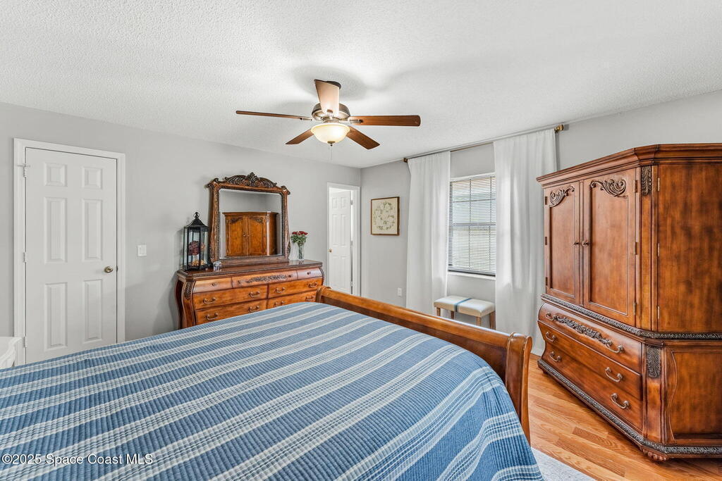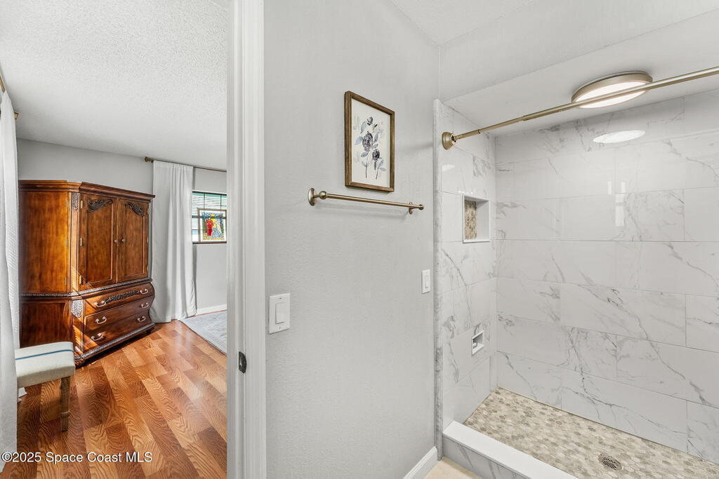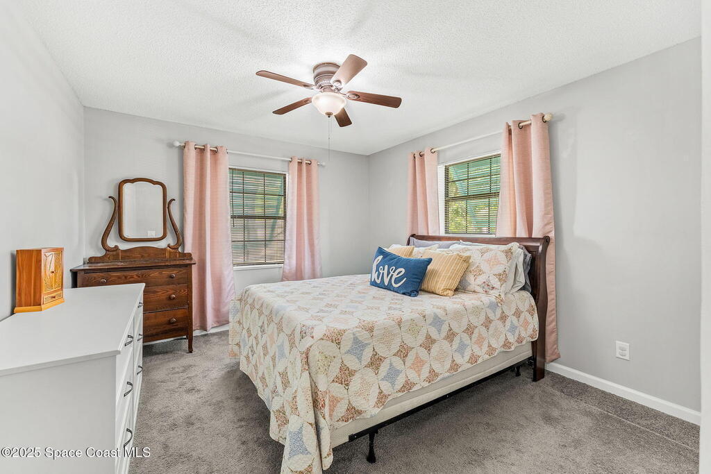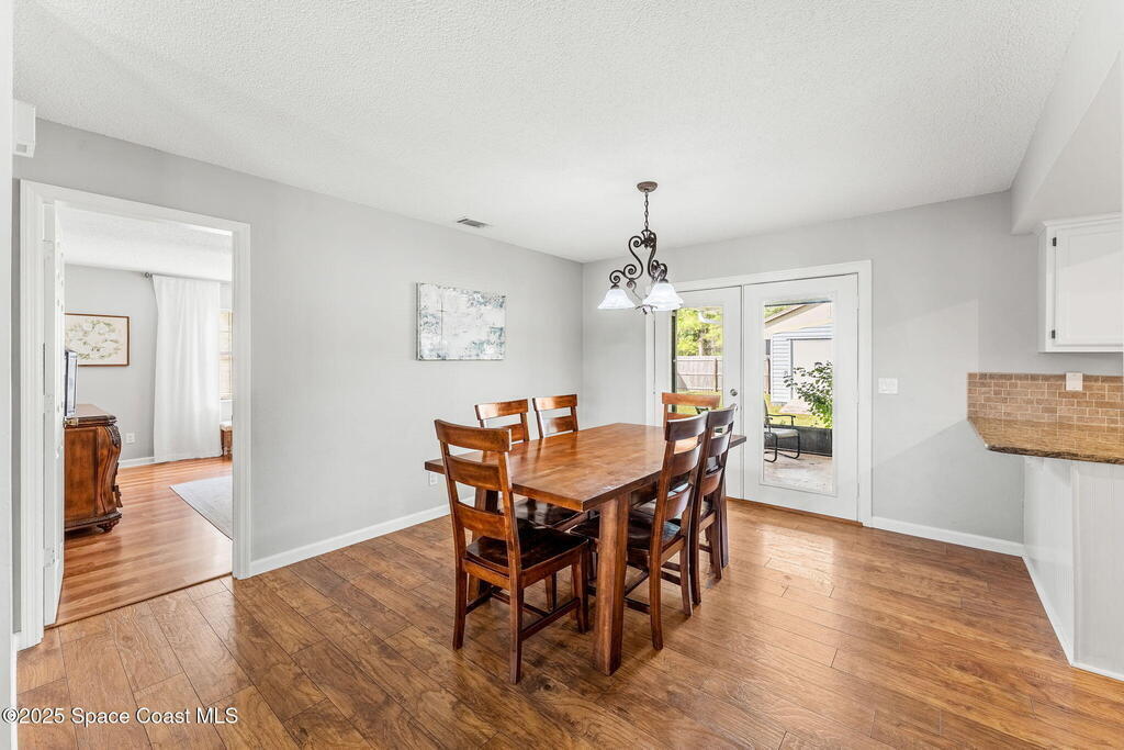 Set on a corner lot in NW Palm Bay, this 1,513 sq ft residence combines open, airy living with thoughtful updates and inviting outdoor spaces. A split floor plan and vaulted ceilings enhance the sense of comfort, while the primary suite stands apart with a walk-in closet and a renovated en-suite featuring a sleek walk-in shower. Durable vinyl plank flooring and granite countertops add modern appeal, complemented by the security of a 2019 roof. Bahama shutters remain in place year-round, offering shade that helps keep interiors cooler in summer while closing easily for hurricane preparation. The fenced backyard offers both privacy and character with mature avocado and banana trees creating a touch of tropical charm. With no HOA restrictions, the property allows freedom and flexibility. Everyday convenience is close at hand with shopping and dining just minutes away, I-95 access nearby, and the Atlantic shoreline in Melbourne Beach and Indialantic less than a 20-minute drive.
