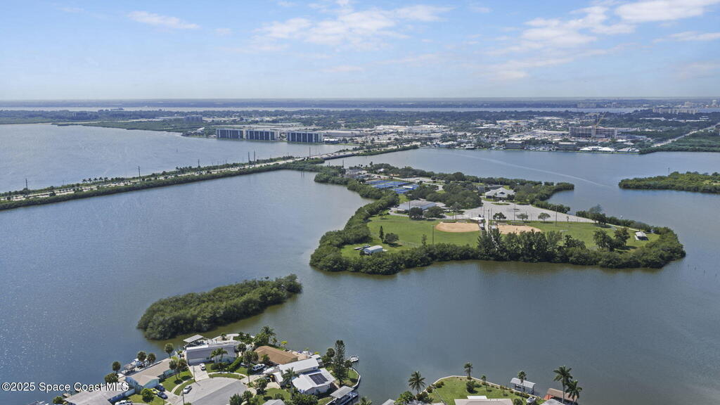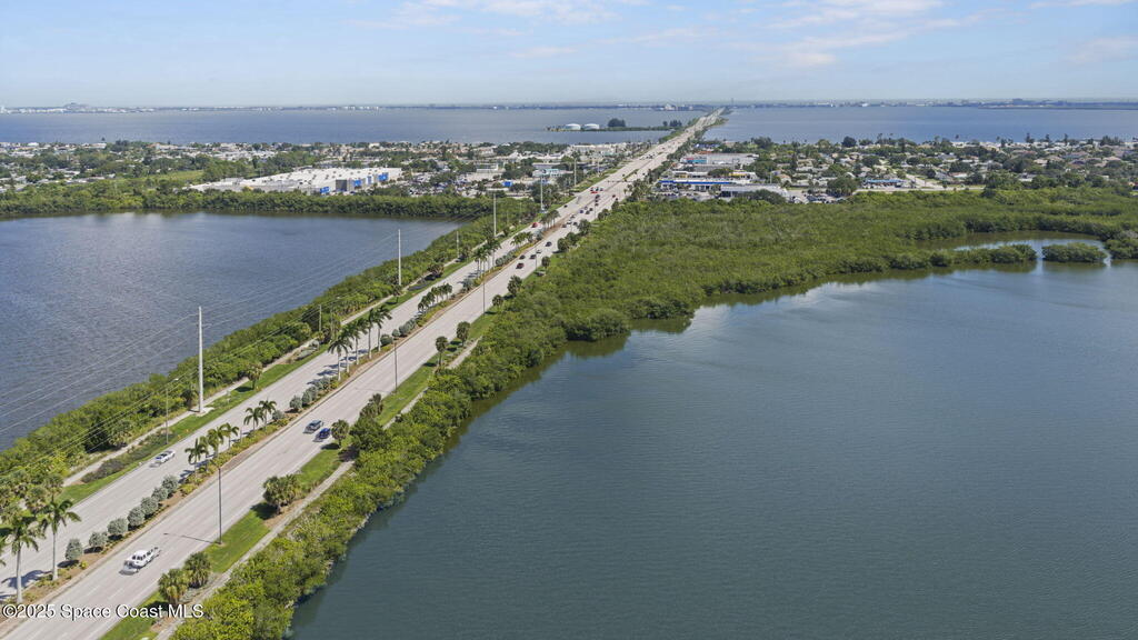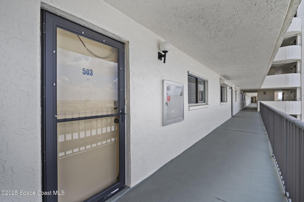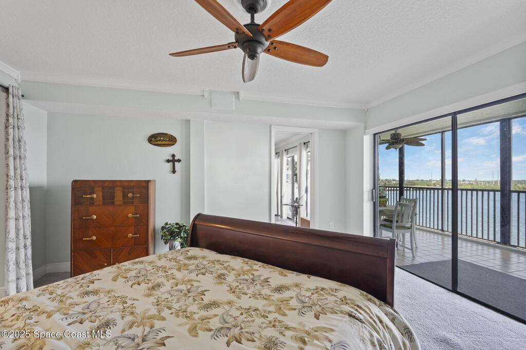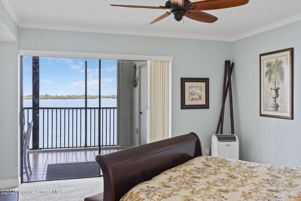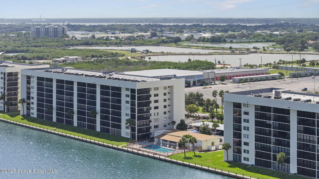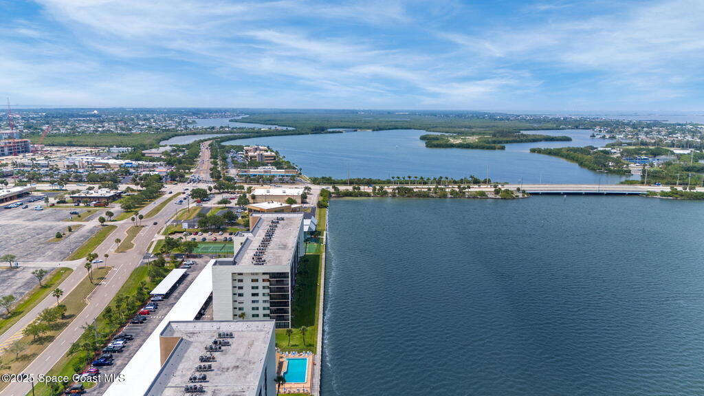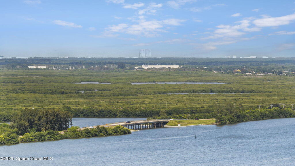 Updated 5th floor condo at Merritt Towers with direct panoramic views of Sykes Creek. Enjoy coastal breezes and watch rocket launches from your own balcony! Inside you'll find a thoughtfully updated kitchen with modern finishes, an open layout, designer pocket door at the laundry room and custom lighting. Additional design features include crown molding, elegant tiled showers, luxury vinyl plank flooring and built-in bar area. For your convenience and safety the front windows have hurricane panels and the balcony has accordion style hurricane shutters. This well-managed community offers great amenities including two waterside pools, tennis and pickleball courts, shuffleboard, riverfront boardwalk, sauna, clubhouse and more! Condo fees cover all utilities except electric. Recent building updates include new elevators, concrete and balcony restoration. All assessments have been paid in full.