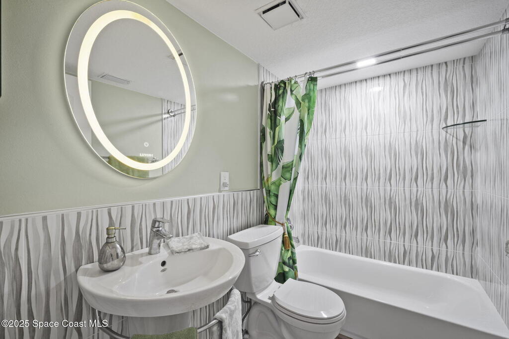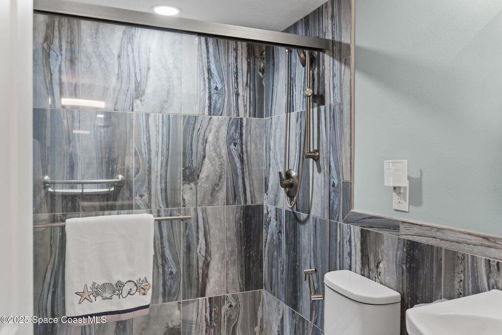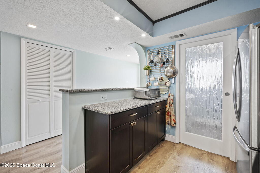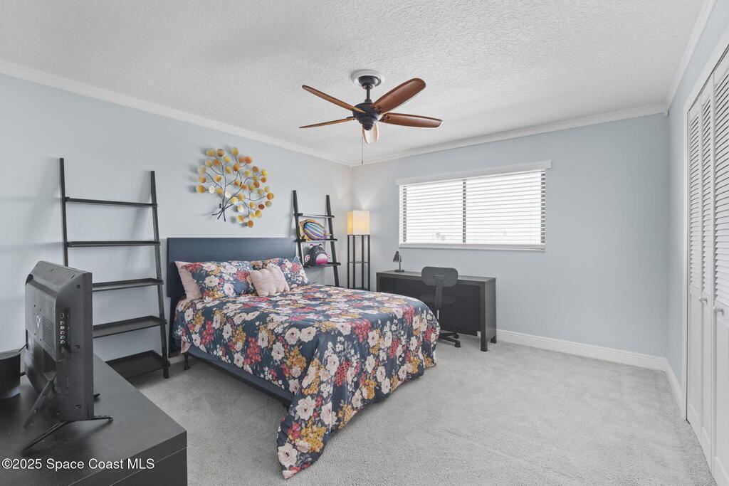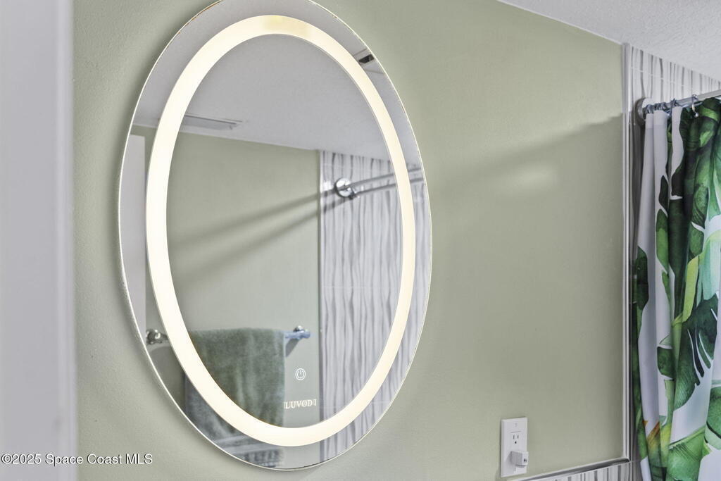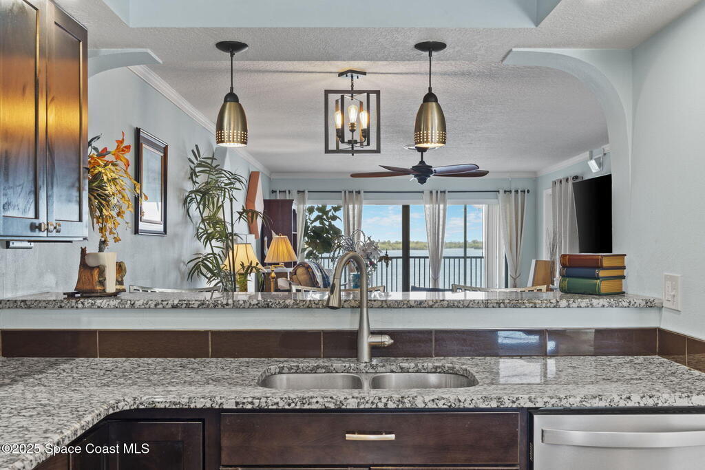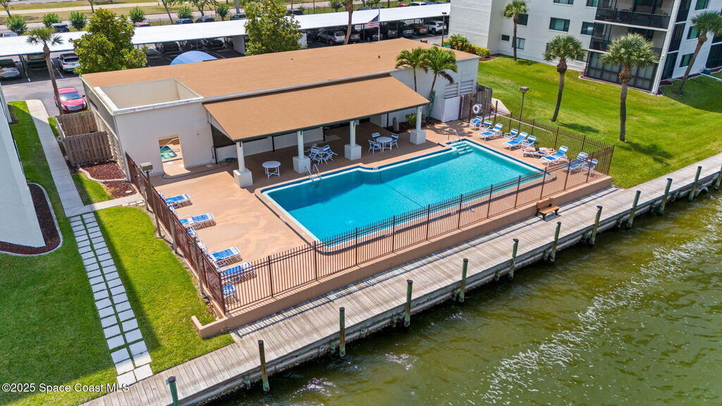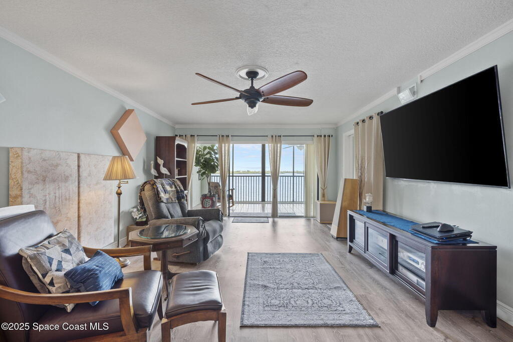 Updated 5th floor condo at Merritt Towers with direct panoramic views of Sykes Creek. Enjoy coastal breezes and watch rocket launches from your own balcony! Inside you'll find a thoughtfully updated kitchen with modern finishes, an open layout, designer pocket door at the laundry room and custom lighting. Additional design features include crown molding, elegant tiled showers, luxury vinyl plank flooring and built-in bar area. For your convenience and safety the front windows have hurricane panels and the balcony has accordion style hurricane shutters. This well-managed community offers great amenities including two waterside pools, tennis and pickleball courts, shuffleboard, riverfront boardwalk, sauna, clubhouse and more! Condo fees cover all utilities except electric. Recent building updates include new elevators, concrete and balcony restoration. All assessments have been paid in full.