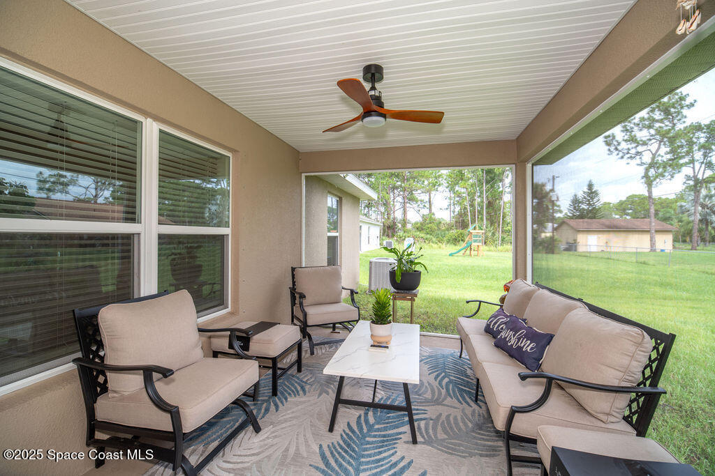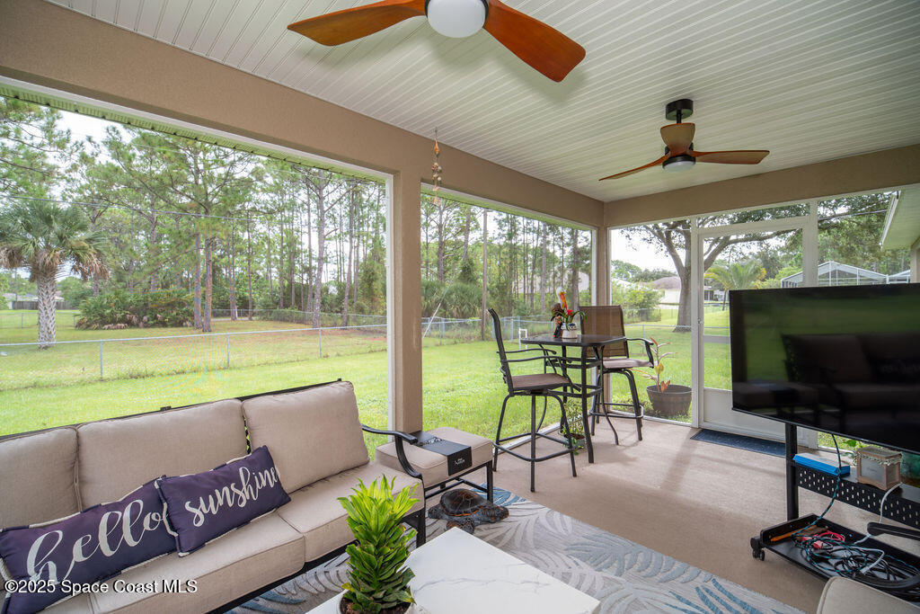 Dream Home Awaits in Coveted Palm Bay. Welcome to one of Palm Bay's most desirable and rapidly growing neighborhoods. This beautifully maintained, single-owner 4-bedroom, 2-bathroom home is an exceptional blend of luxury and functionality, featuring top-tier upgrades throughout. Enjoy the Florida lifestyle with a spacious 10' x 20' screened-in lanai, perfect for dining, relaxing, and entertaining. Gourmet Kitchen: Equipped with premium LG stainless steel appliances, including a slide-in electric range with InstaView, Air Fry, and ProBake technology, plus an InstaView glass refrigerator with Craft Ice and PrintProof finish. The master bath offers a luxurious garden tub, bathed in natural light through a privacy window.Ceiling fans in every room and a RainSoft whole-house water treatment system for added comfort and quality. Tech-Ready Garage: Includes a 50-amp plug, ideal for RV or electric car.
