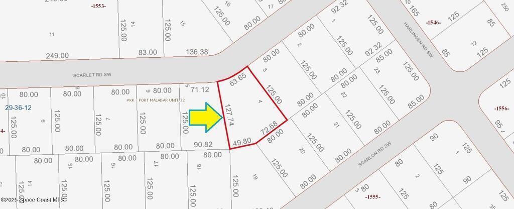 The 0.26 acre buildable residential lot is available in Port Malabar Unit 32 of Palm Bay. Located in the southwest section, this lot is just 1.9 miles - 5 minutes to Bayside High School, 3.2 miles - 9 minutes to the Publix Supermarket, 12.3 miles - 28 minutes to Melbourne Airport, and 15 miles - 35 minutes to the beaches of Indialantic. From exit #176 of I-95 go west on Palm Bay Road for .7 miles, left on Minton Road for 3.4 miles, right on Jupiter Boulevard and quick left on DeGroodt Road for 1.0 mile, right on Sawyer Street for .4 miles, right on Harlingen Road for .2 miles, and left on Scarlet Road. The lot will be on your left.