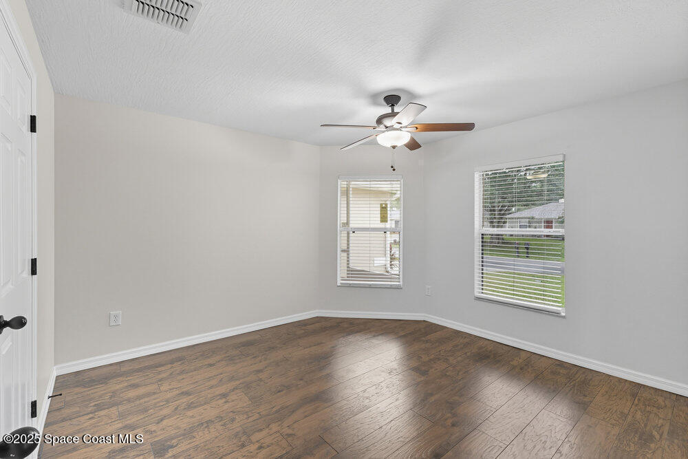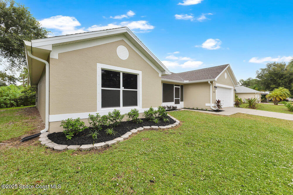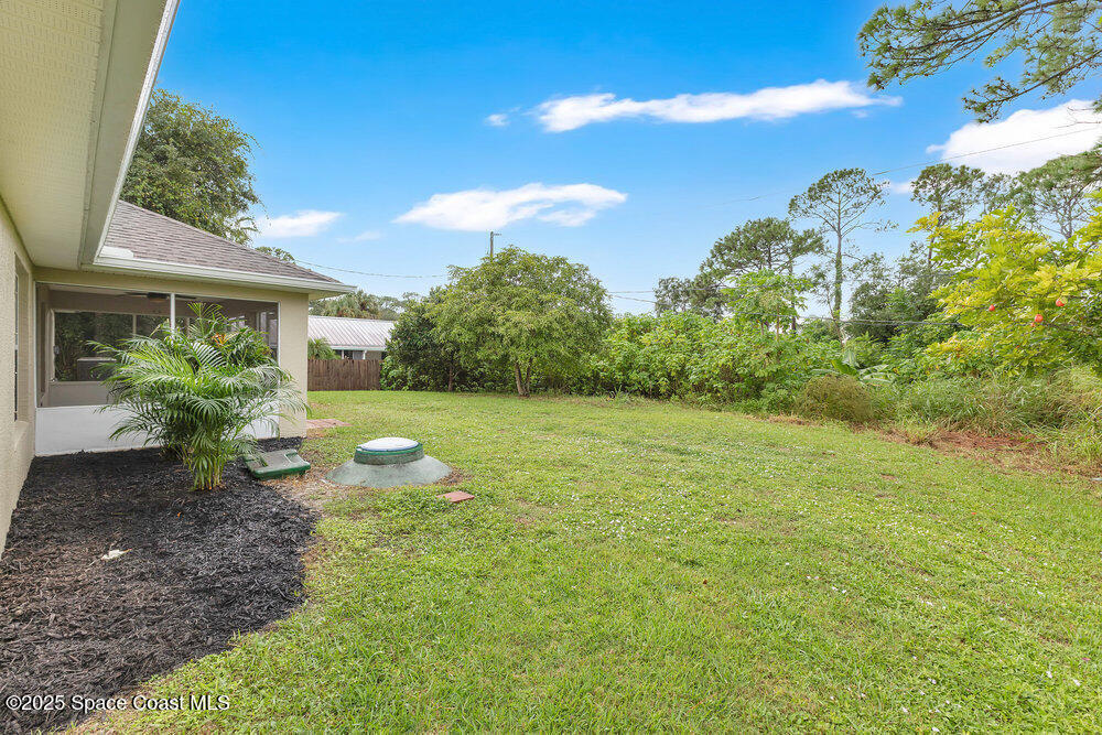 Wow! New Price! Don't miss out on this beautiful 3 bed 2 bath spacious, ready to move-in home in southeast Palm Bay. The home was just connected to city water and also has a fully functioning well system for watering the lawn. The home sits on an elevated lot with a 2 car garage and screen porches on the front and rear. The roof was replaced in 2018. You'll love all the nice upgrades in the interior with custom kitchen cabinets, granite counter tops, new stainless appliances, porcelain tile floors, ceiling fans, wood laminate flooring in the bedrooms and new interior paint. The bathrooms have been upgraded with custom cabinets, granite tops and a large walk-in shower in the primary bath. The laundry room has plenty of cabinet and countertop space. Other updates include a new air pump for the Nayadic aerobic wastewater treatment system, new exterior paint, rain gutters and a new compressor for the AC condenser.