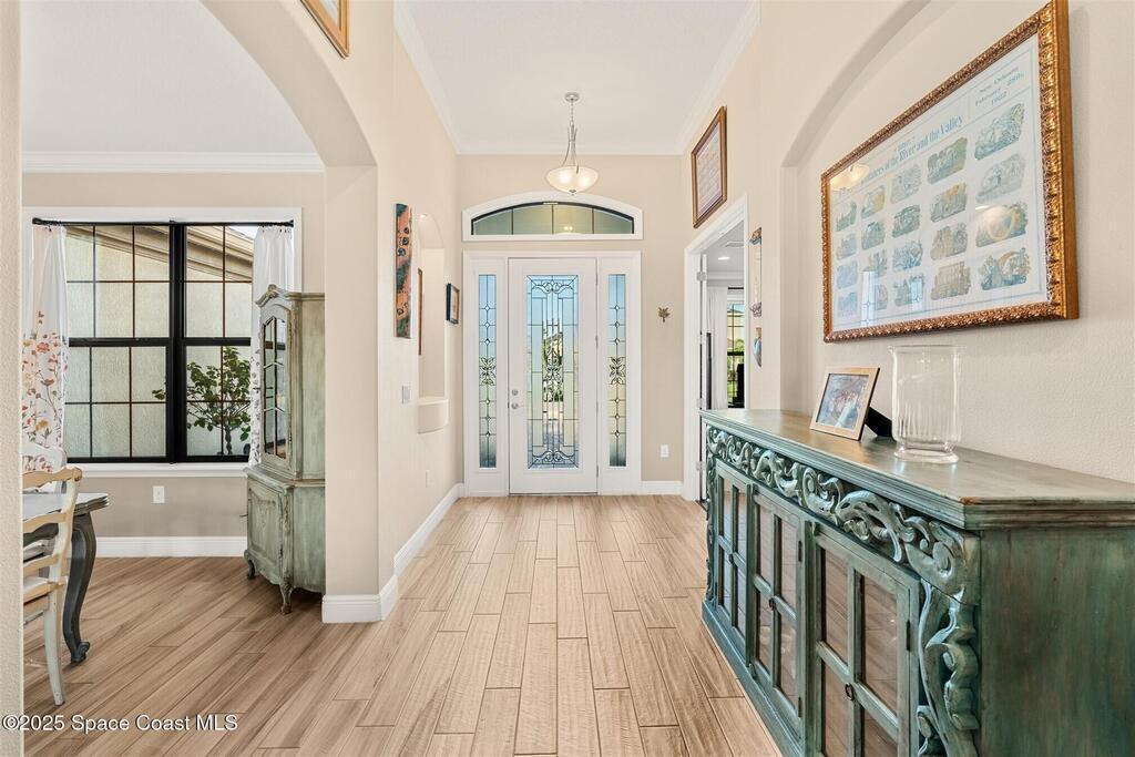 Enjoy gorgeous lakefront views in this meticulously maintained contemporary CBS home in the sought-after gated community of Stonecrest at Viera. Located on one of the larger lots in the neighborhood, this house boasts double water views. Decorating for the seasons is as easy as pushing a button with the exterior custom lighting system. A glass-door entryway welcomes you into the open floorplan, with a formal dining room and flex/bonus room to either side of the foyer. Natural light from large double pane windows guide you through to the kitchen, great room, and breakfast nook. At the heart of the home, the light and bright kitchen offers stainless steel appliances, a vented hood, gas range, convention oven, a breakfast bar and pantry. Move through the 8 ft. sliders to the extended screened patio and take in the sparkling lake views while cooking on the grill. The expansive primary bedroom with its own sitting area includes a spacious ensuite SEE ''MORE