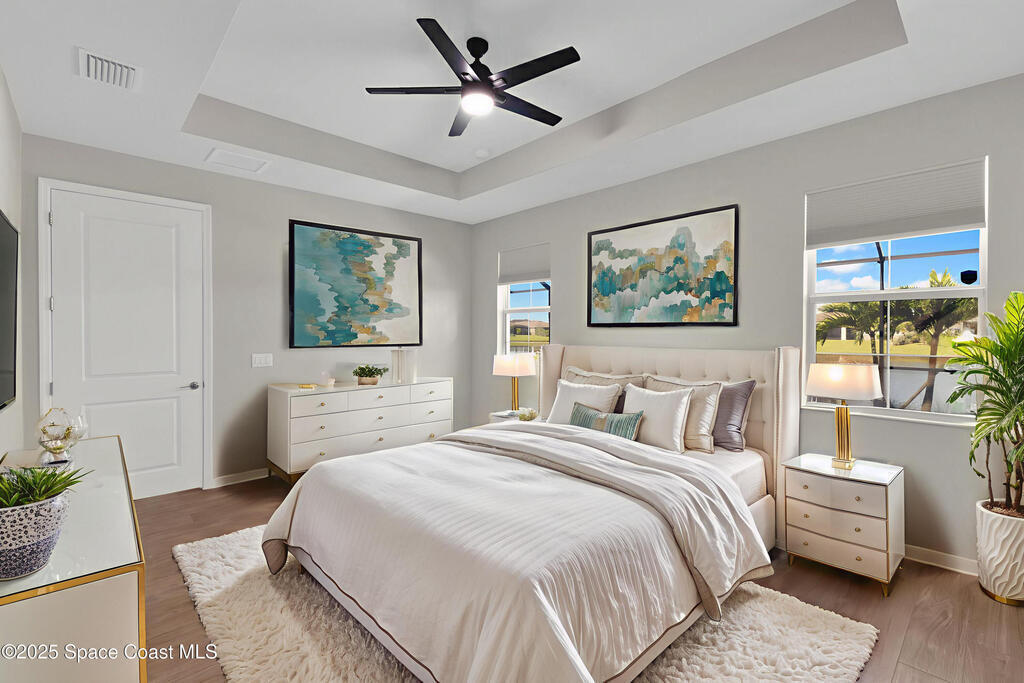 Experience luxurious Viera living in this stunning 4-bedroom pool home, complete with a versatile flex room. Enjoy spectacular sunsets from your private backyard oasis, featuring a sparkling pool perfect for relaxing or entertaining. The gourmet kitchen is a chef's dream, showcasing premium finishes, a gas stove, stainless steel appliances, and beautiful quartz countertops. Elegant upgraded lighting and designer hardware add a modern touch throughout. Enjoy peace of mind with impact-resistant windows, and a low-maintenance lifestyle with lawn care included in the HOA fee. An open-concept design with natural light fills the spacious living areas. The large master suite offers serene lake views, a huge walk-in closet, and a double-sink walk-in shower. Outside, a beautifully landscaped yard enhances the curb appeal. Located near top-rated schools, premier shopping, and dining, this home is a gem in one of Viera's most sought-after communities.