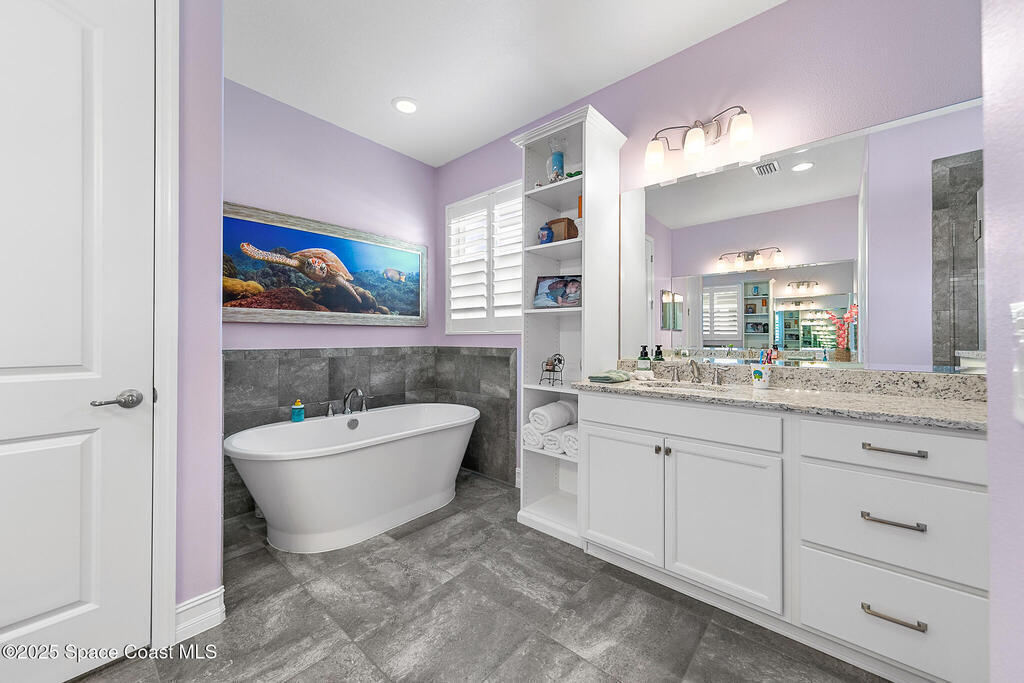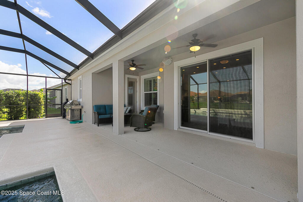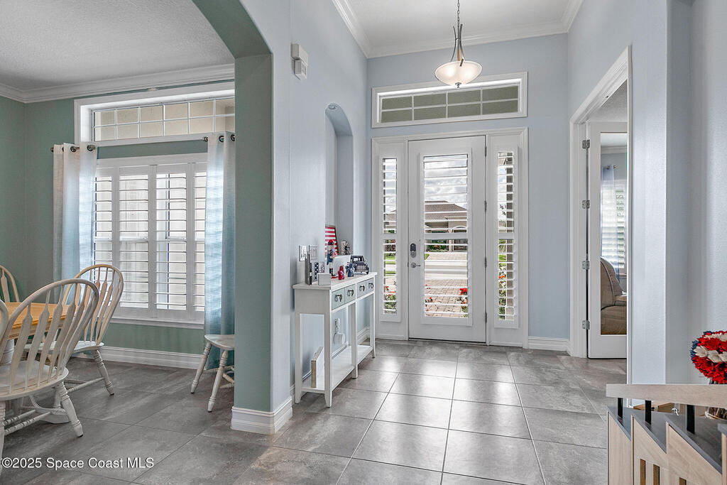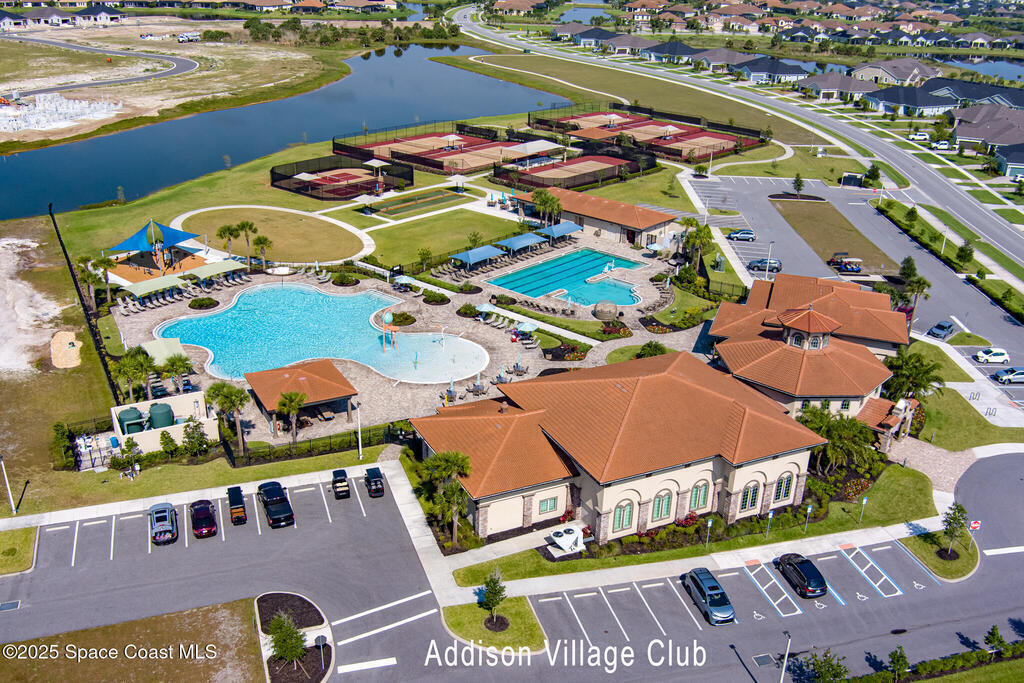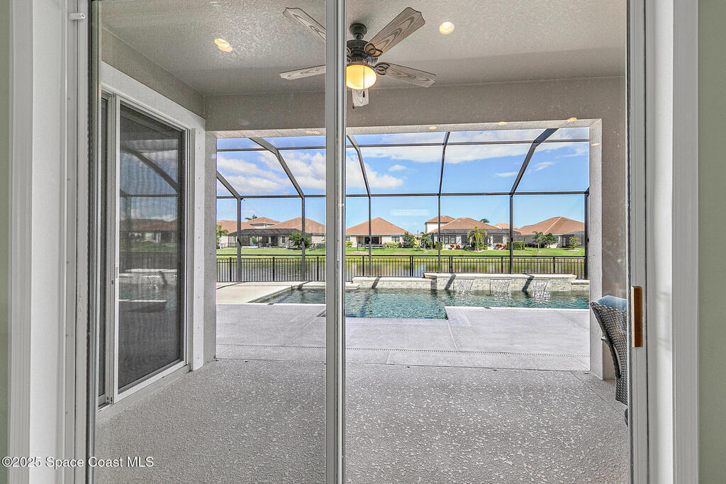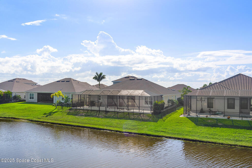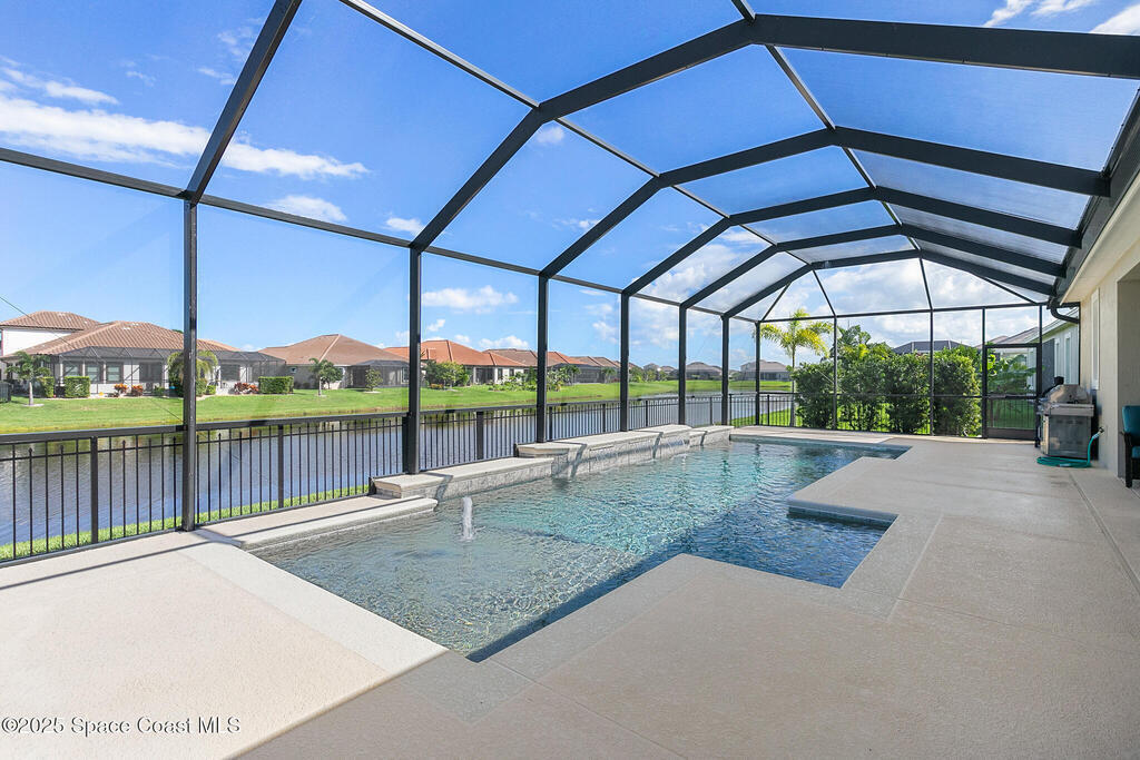 This lakefront pool home is in the heart of Viera, and once the model for the neighborhood. Located behind the gates of the Stonecrest subdivision which is less than 1 mile from I-95 and in the heart of and in Brevard's premier school district. This gorgeous 5 bedroom, 4 bathroom lake front home is LOADED with extras. This spacious gourmet kitchen has a gas stove. IMPACT WINDOWS throughout home. The garage is air conditioned with a separate workspace/office (the living sq ft doesn't include the garage). The outdoor living has a large porch & screened pool with tranquil waterfront views. The floor plan is well versed with office/den in the front of home plus a HUGE bonus room bath and the 5th bedroom on the second level. This golf cart friendly subdivision has a community pool, exquisite clubhouse, multiple pickleball and tennis courts and even a shaded playground with many walking paths to venture along. Home is turnkey, and ready for a new family for immediate occupancy.