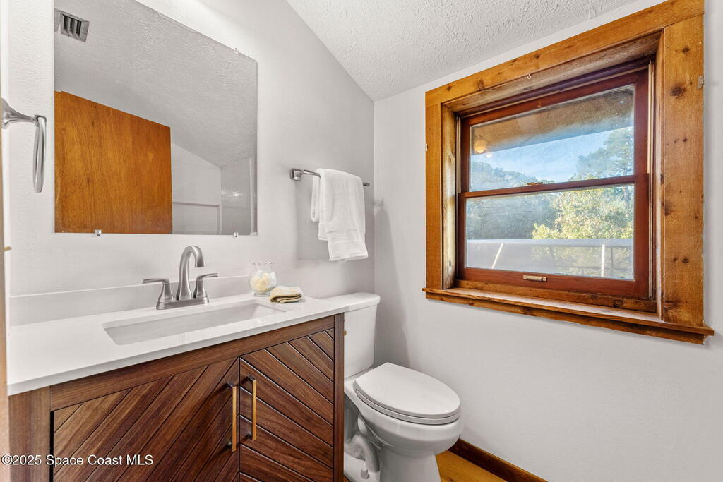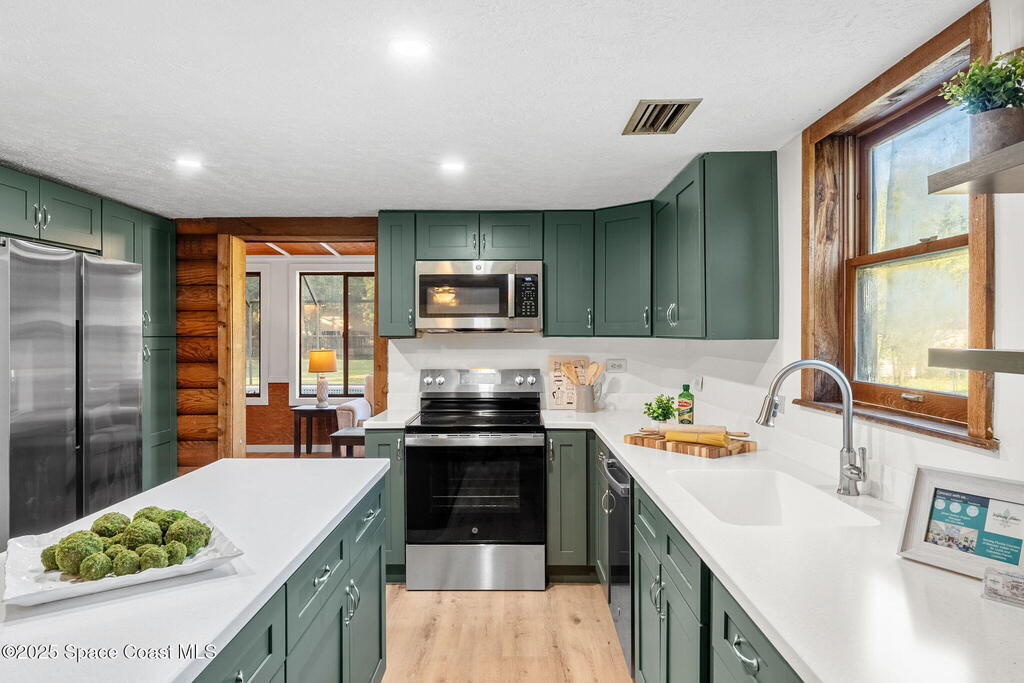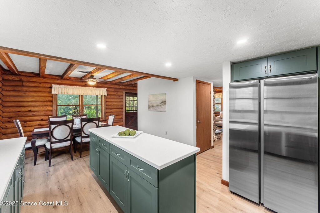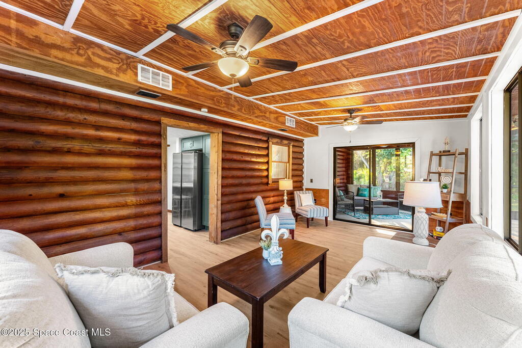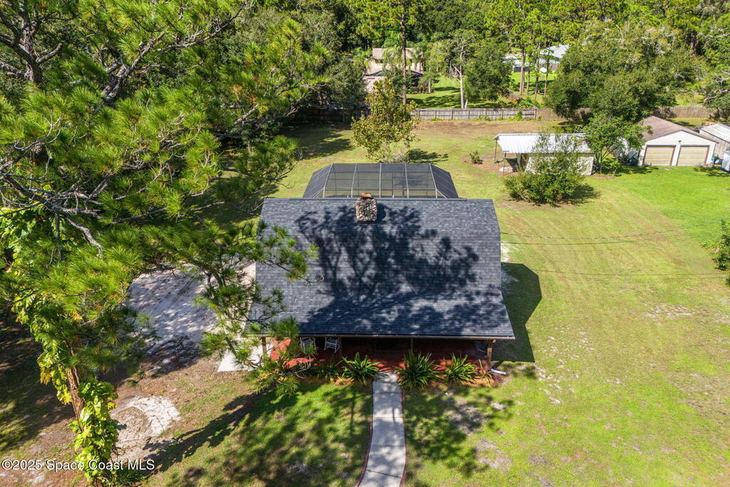 Set on over an acre in Canaveral Groves, this renovated 3-bed, 2.5-bath pool home feels like something out of a storybook, only this one comes w/ a new roof, new septic system, & an AC & water heater both under 2 years old. The wide front porch with tongue & groove ceiling & rich wood exterior welcome you in, where exposed beams, & a stone wood-burning fireplace give the home character you just can't fake. The brand-new kitchen has beautiful green shaker cabinetry, solid-surface counters, & SS appliances, opening into the dining area & a flexible bonus space w/ pool access. Upstairs, the primary suite includes dual closets & a private bath, while 2 additional bedrooms share a full hall bath. Outside, a screened pool w/ spa, covered patio, & sprawling backyard create a private retreat. A detached outbuilding adds storage or workspace flexibility. No HOA, plenty of privacy, & close to beaches, Cocoa Village, The Avenue Viera, & major highways.