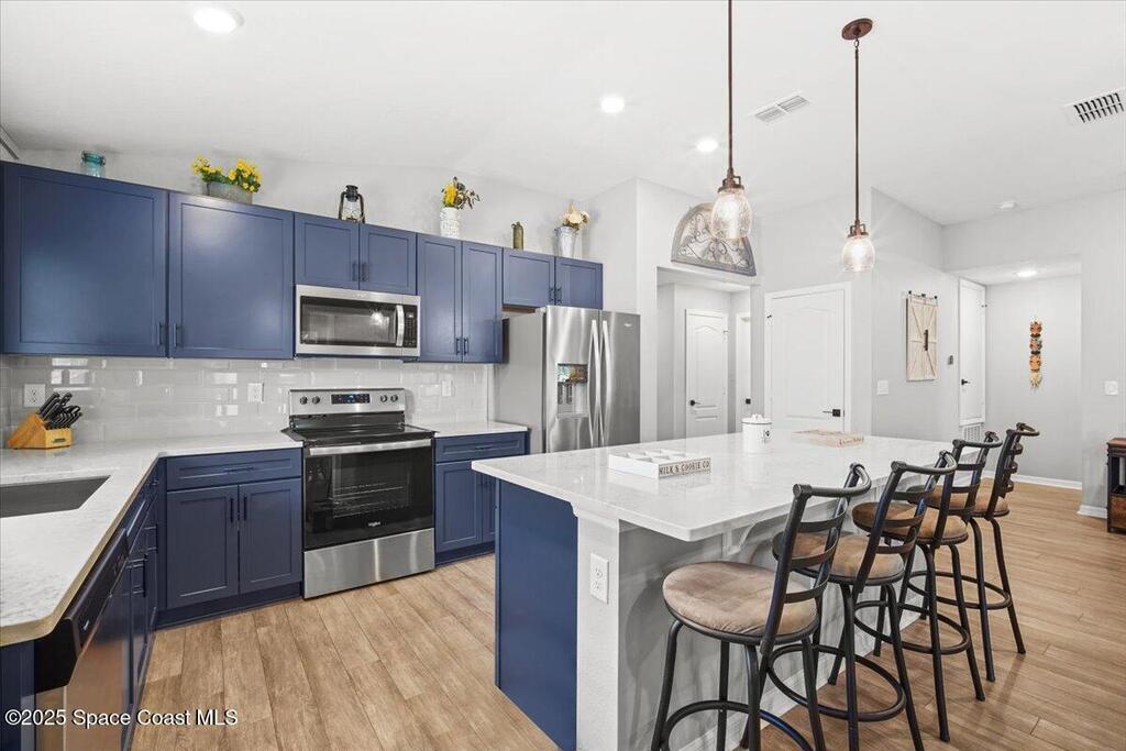 Welcome to Verona, a modern and family-oriented community complete with resort style community pool, kids splash pad, club house, walking trails, and beautifully designed homes. 1389 Moscato offers a well thought out 3-bedroom, split floor plan, with nearly $75,000 in upgrades from the design studio at time of build. This home boasts beautiful luxury vinyl plank floors throughout the entire home, with tile in the bathrooms. Luxury kitchen with custom cabinets with soft close, dove tail pull outs, Silestone Quartz countertops throughout the kitchen and bathrooms, recessed lighting, center island with pendant lighting, large pantry, and stainless steel appliances. Spacious bedrooms with large closets. Updated bathrooms with tiled walls and upgraded vanities. Other notable features include upgrades to vaulted ceilings, double pane/impact windows with shutters, extended and trussed screened porch, Smart home features, PVC fenced back yard, gutters, ceiling fans, and ship lap accent walls.