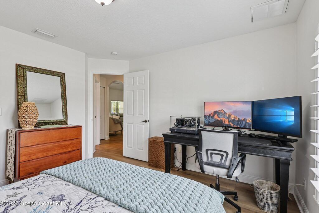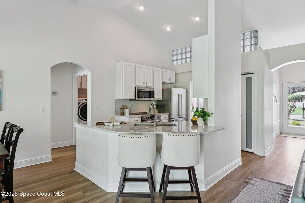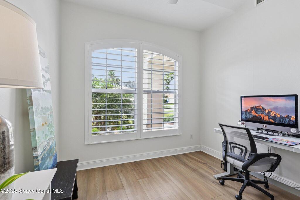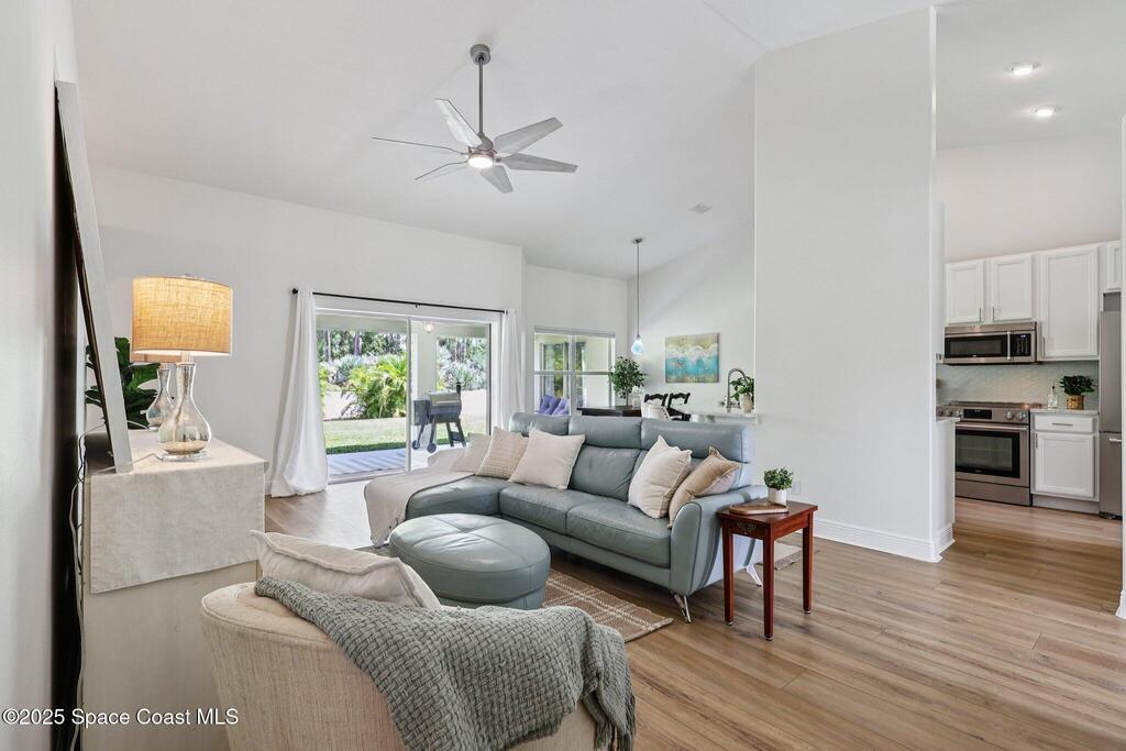 This beautifully updated four-bedroom, three-bathroom home is in the desirable gated community of Bayside Lakes, situated on a spacious, private corner lot that backs onto a serene preserve. Featuring a dedicated office and a flexible bonus room, the open split floor plan with high ceilings showcases lush landscaping. Renovated in 2023 with a new roof in 2024, the home includes luxury upgrades. The stunning kitchen boasts high-end appliances, elegant quartz countertops, and a coastal-inspired backsplash. The expansive primary suite offers a peaceful retreat with a walk-in closet, deep soaking tub, and separate shower. Additional highlights include updated flooring, a new 87-gallon water heater, custom shades, plantation shutters, and designer ceiling fans. Residents enjoy a tranquil environment with amenities like sidewalks, ponds, a clubhouse, pool, gym, tennis, basketball courts, and a playground -all conveniently located near I-95, Melbourne, and Space Coast beaches!