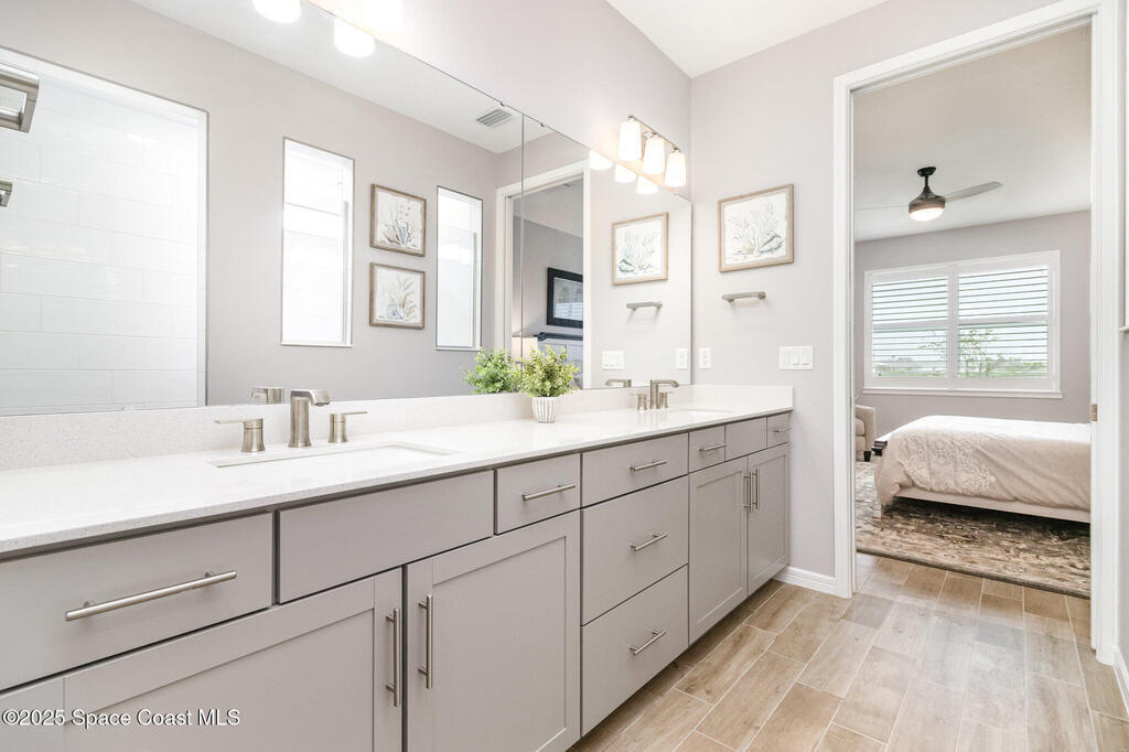 This stunning lakefront, oversized premium lot, 3Bed/2Bath. The enclosed Flex room perfect for a 3rd guest bedroom or office. This is a Del Webb Palmary model with amazing sunset and water views and is ready to move in & start enjoying life in an active resort-style community. Entertaining is easy with a large open concept gathering room with tray ceiling, kitchen with large island, and cafe. There is an extended screened lanai, electric hurricane impact screens, fenced yard with puppy picket, plantation shutters, designer window treatments & lighting fixtures. The 2-car garage was extended by 4ft & has epoxy flooring, upgraded laundry room has both upper and lower cabinets and a sink, built-in HMC outside laundry room. Cameras and security system are installed. Chef's kitchen has upgrades such as quartz countertops, stainless steel Whirlpool appliances, wood hood, upgraded sink/faucet, backsplash, under-cabinet lighting and so much more. Other upgrades include ceramic tile flooring