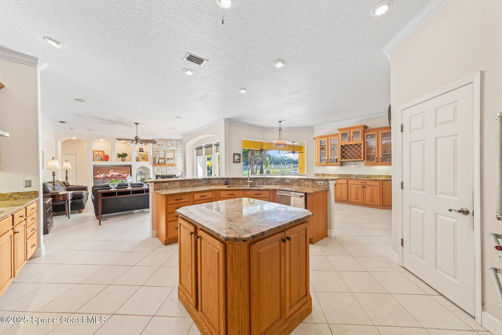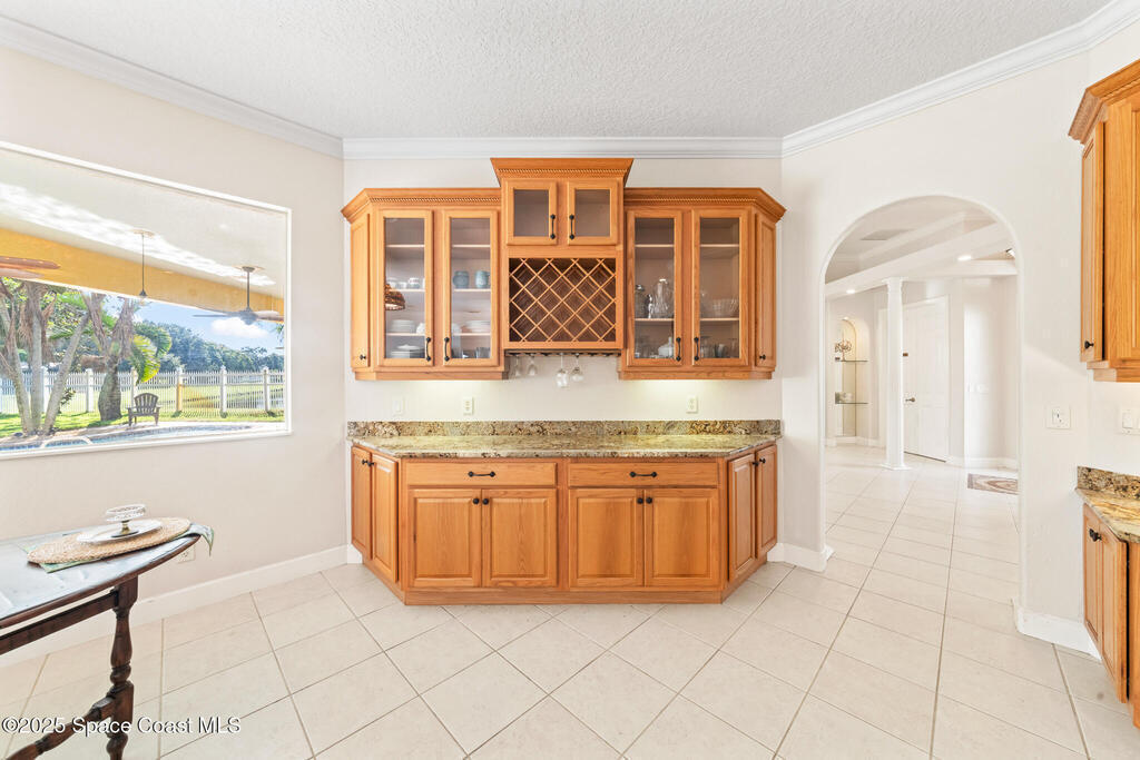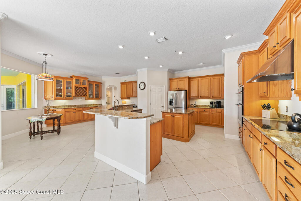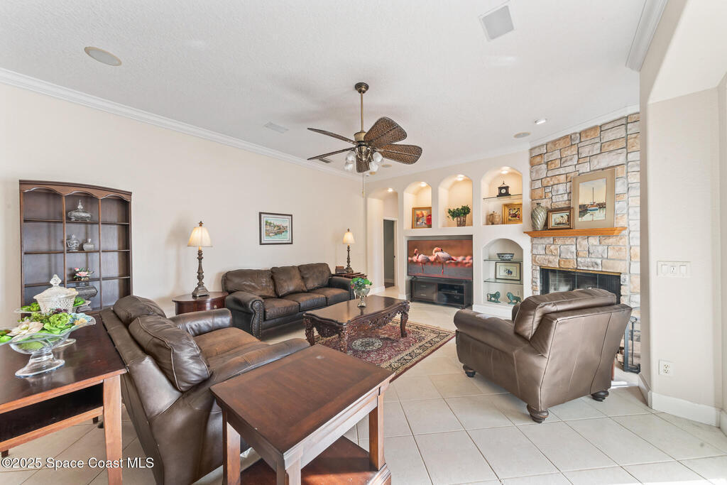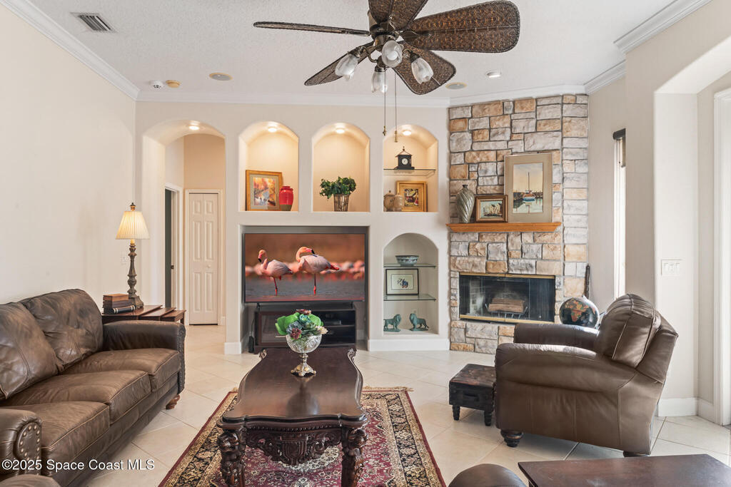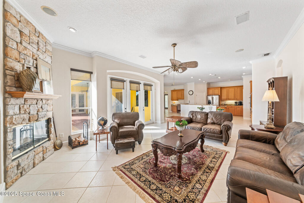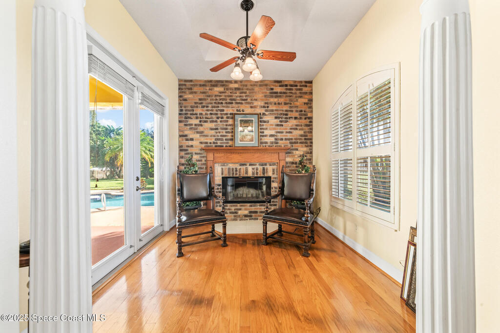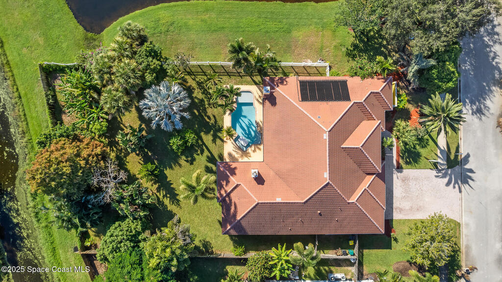 72 HOUR KICK OUT CLAUSE An exceptional opportunity to live in one of Merritt Island's most beloved neighborhoods.Originally built and owned by the developer of River Grove, this stunning single story lakefront home boasts quality and prime location. Featuring durable tile roof and a true master suite with private sitting area, wood floors, and charming fireplace, this residence exudes warmth, elegance and spaciousness. The large kitchen offers solid oak cabinets, granite countertops, built-in wine bar, and island perfect for entertaining. Set on an oversized fully fenced lot adjoining the serene neighborhood lake, the property includes multiple fruit trees. Enjoy outdoor living with grilling area, shower and swim-up table in the pool, resurfaced in 2019. A light filled family room with a second wood-burning fireplace completes this spacious home. Storm Shutters on premise. Yard is irrigated by well. Community Dock on the Indian River with Fishing Rights.