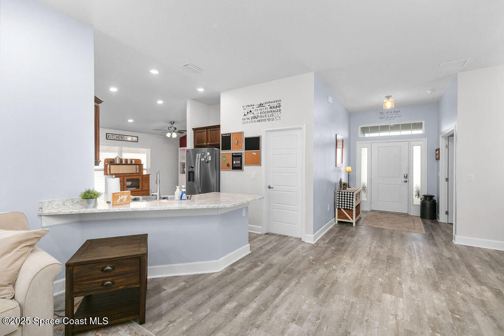 Step into this immaculate, move-in ready nearly new home built in 2020, offering a spacious and well-designed layout perfect for modern living. This home features an open-concept floor plan consisting of 4 bedrooms, 2 bathrooms, 2 car garage, stylish kitchen with modern finishes, under-cabinet lighting, breakfast bar, and eat-in dining space, separate formal dining room, a spacious living room, indoor laundry room, covered front porch and a covered back porch. The primary suite highlights include a large walk-in closet, bathroom with dual sink vanity, walk-in shower with a shower bench (remodeled in 2024), and a linen closet. This home also boasts new sod and landscaping, paid off solar panels, newer water heater (2023), split bedroom plan, irrigation system, hurricane shutters, double paned windows, fully fenced backyard with a shed, and so much more. Prime location just minutes from shopping, dining, gas stations, and beauty services. Less than 2 miles from Hwy 528 for easy commute