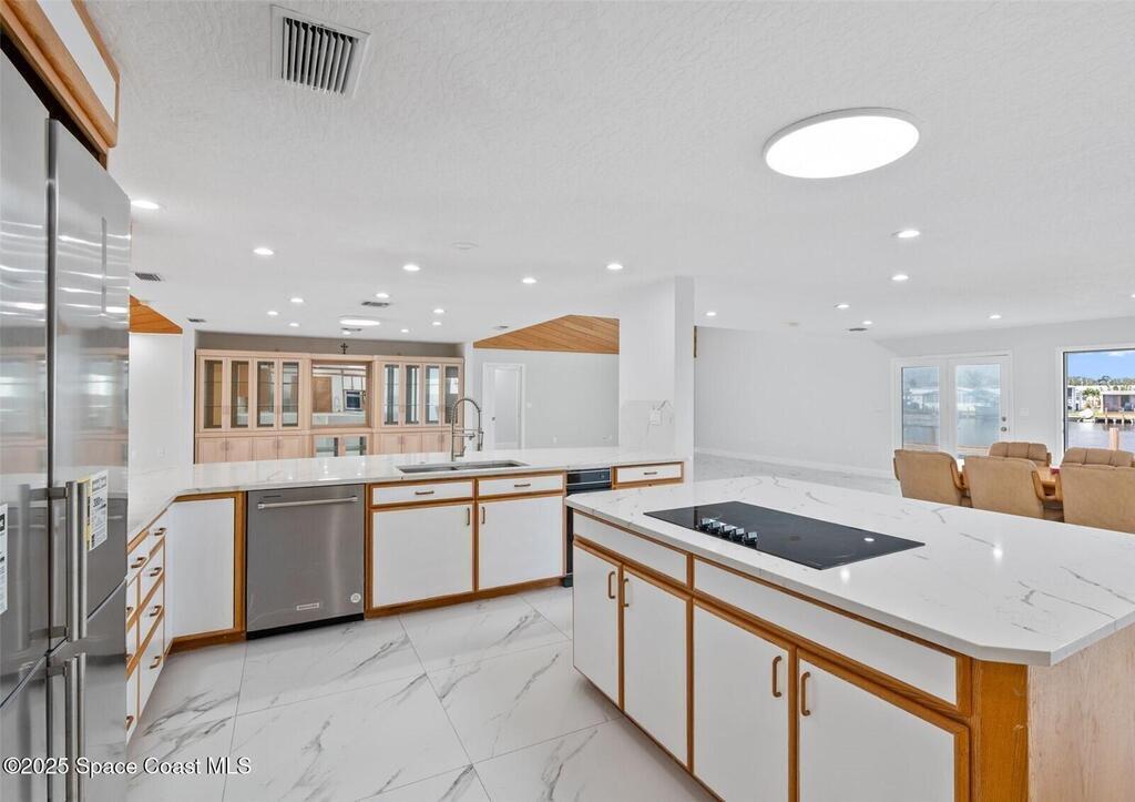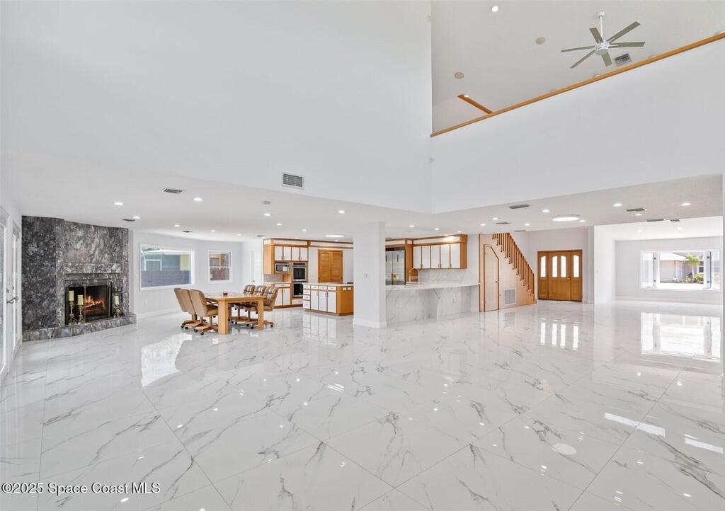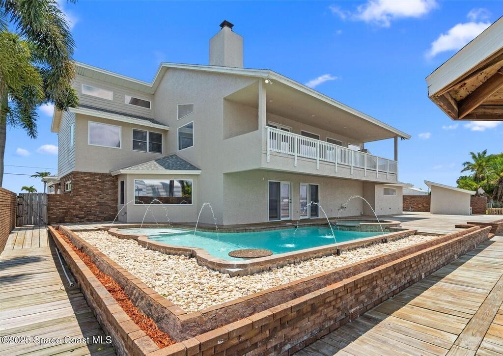 WELCOME HOME TO EXCLUSIVE MILFORD POINT MERRITT ISLAND!An absolute tropical boater's paradise! This stunning canal front single family home offers 5 bedrooms 4 full bathrooms and an open floor plan designed for spacious coastal living. Stunning Kitchen equipped with new stainless appliances. Features include 2 primary suites--one on the first floor and another upstairs with a loft overlooking the main living area, a private balcony overlooking pool and Pelican Creek. One of the downstairs bedrooms is perfect for in-law quarters. The garage is fully equipped custom cabinets and 2 work benches & oversized driveway. Additional highlights include a newer roof, 2 newer HVAC units, two wood-burning fireplaces (one on each level) and an expansive 1,531 sq. ft. dock spanning the full width of the property. Outdoor living at its finest with multiple deck space, a sparkling pool, and a relaxing spa. This property offers direct canal access with no bridges, making it a true boater's dream!
