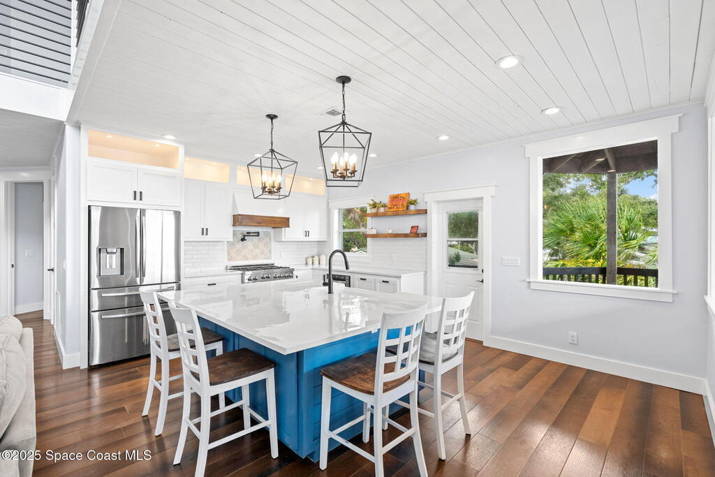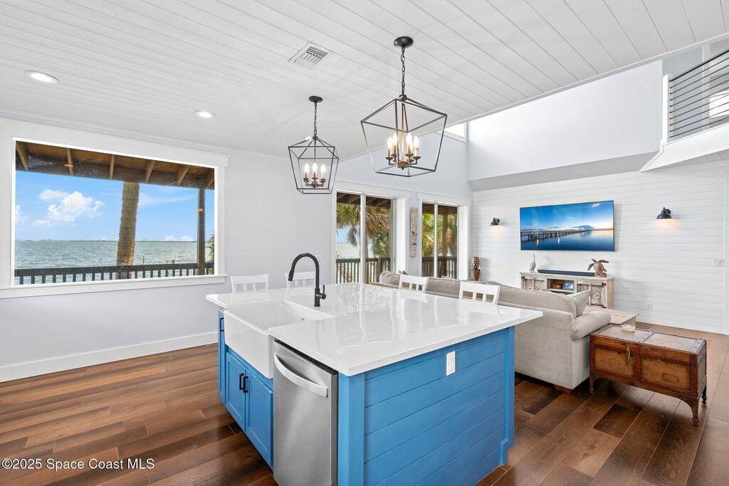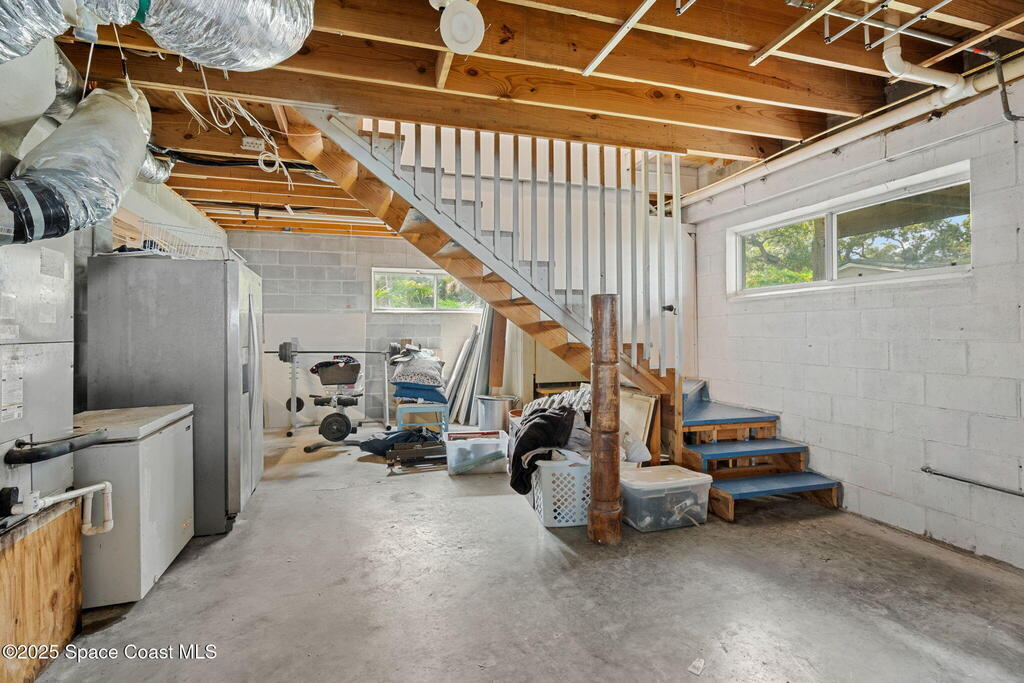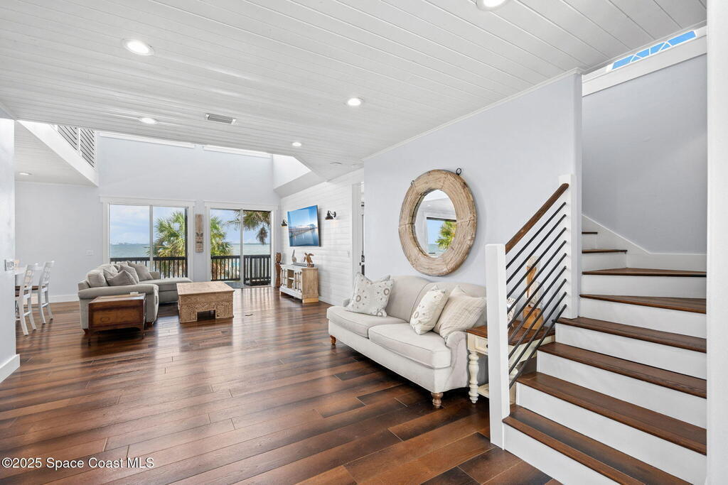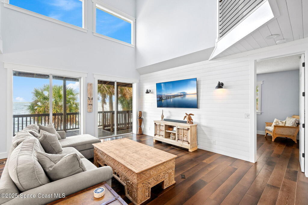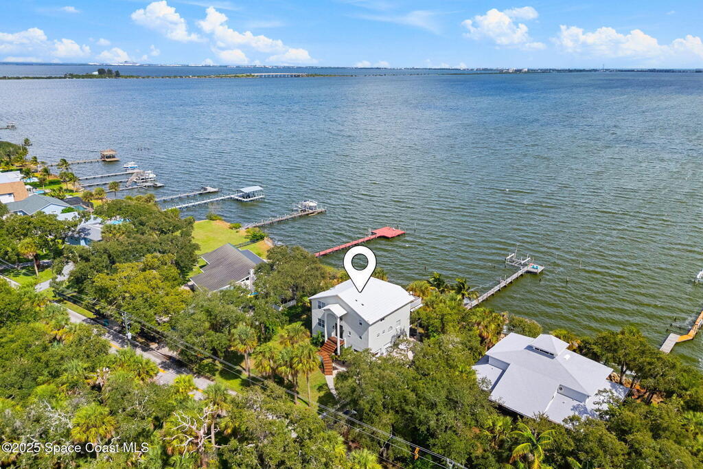 Welcome to your dream waterfront escape -- a beautifully remodeled three-story coastal chic home with endless views of the River. From the moment you arrive, you'll feel the serenity of lush palm trees, privacy, and the perfect blend of modern comfort and timeless Florida charm. Inside, the thoughtful layout maximizes both function and flow. The main living level features a spacious open concept with a master suite and an office or guest bedroom, perfectly positioned to capture the river breeze and incredible sunrise views. Below, a massive garage and unfinished workspace offer endless potential -- finish it under air to create an additional 500 sq. ft. of living space, ideal for a gym, recreation room, or social lounge. Upstairs, two more bedrooms and a full bath open to a private balcony overlooking the dock and boat lift -- your front-row seat to the river life. Morning coffee, evening cocktails, or spontaneous boat days -- it's all right outside your door.