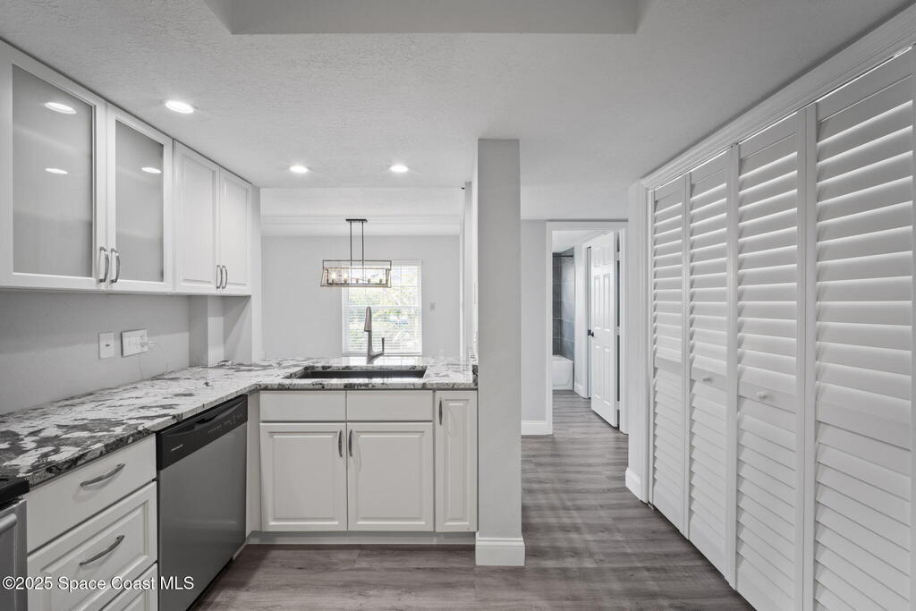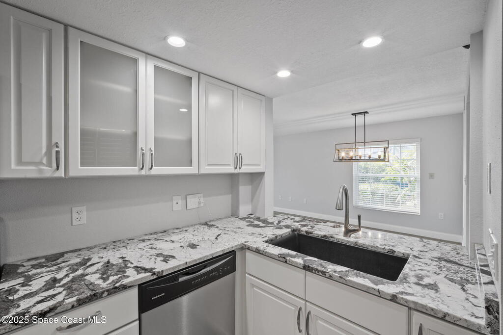 Beachside living at its best, turn-key, move in ready corner unit in desirable Harbor Isles. Just steps from your PRIVATE GARAGE, tennis courts, clubhouse, waterfront boardwalk, pools, ramp road park, & BOAT/RV STORAGE ON SITE. Florida sunrises are just a block way from quiet beach access. Inside, is extremely well maintained with vinyl wood look flooring and coast colors throughout. The chef kitchen features high end granite counters, solid wood cabinetry, and matching stainless appliances. Natural light fills the spacious family room with side windows and over sized slider and wrap around patio overlooking community lake. The waterside primary suite offers walk-in closet matching sold wood vanity w/granite, soaking tub and shower. Two guest bedrooms share a stylishly updated full bathroom. Other updates include roll down hurricane shutters, new A/C and new roofs.