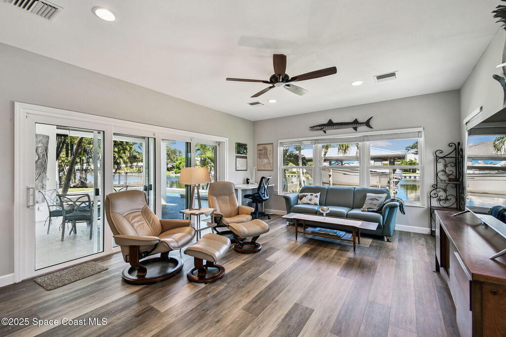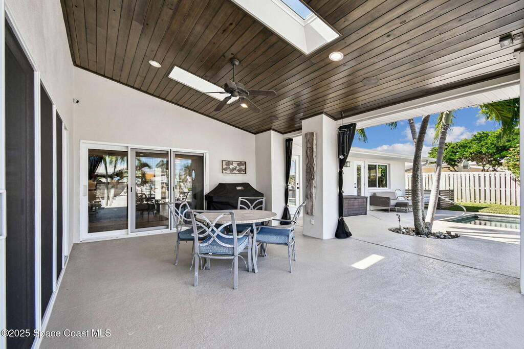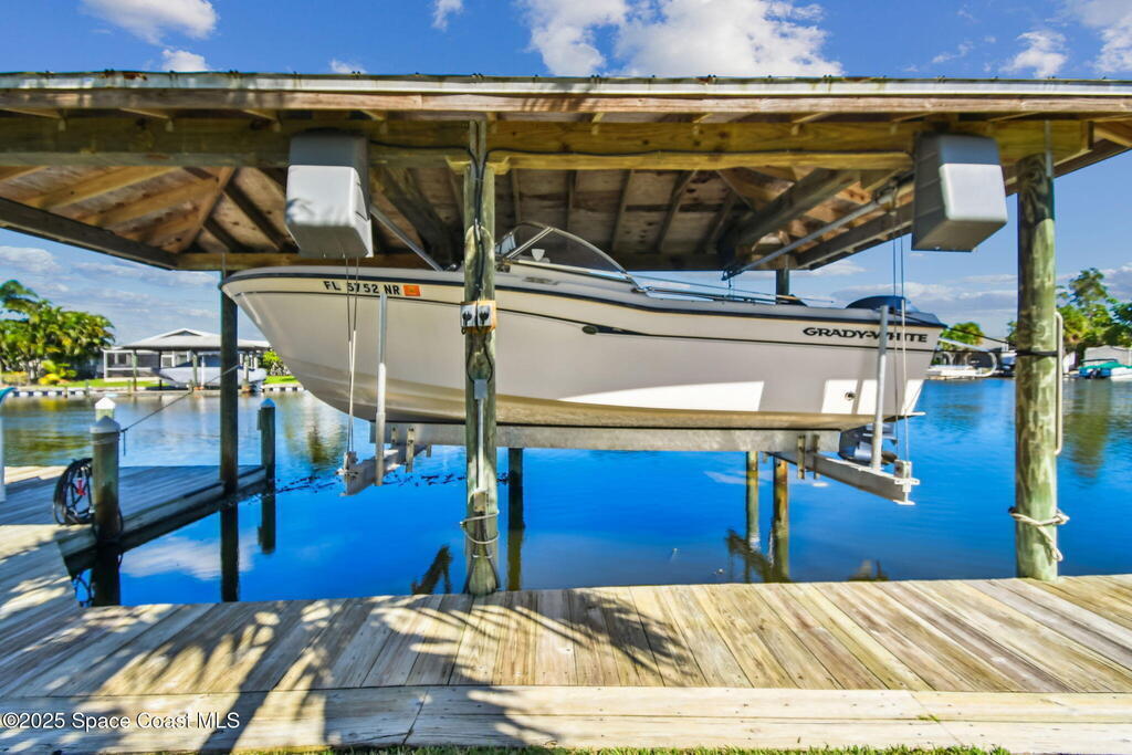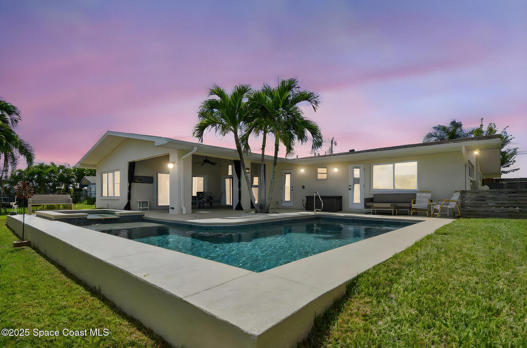 From the curb it appears modest, but step inside and the wow factor hits fast, especially when you see the pool, spa, wide canal, and outside entertainment options.Exceptional waterfront living on one of Cocoa Beach's desirable streets. This fully remodeled, move in ready coastal home (taken to the studs in 2016) offers two primary suites, two spacious living areas, and an open floor plan with a modern kitchen and gas cooktop. Tile and COREtec floors run throughout, along with a mudroom, dining room, pantry, and laundry area with a pool access bath.The backyard is a private resort style retreat with a gas heated saltwater pool, spa, covered dock, and boat lift on a wide, deep water canal with quick access to the Banana River. Perfect as a primary residence, vacation home, or luxury waterfront retreat. Close to downtown Cocoa Beach, golf, beaches, and top rated schools. A rare opportunity for true Cocoa Beach waterfront living.