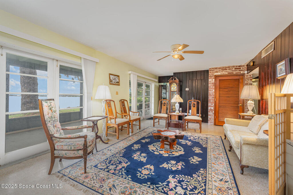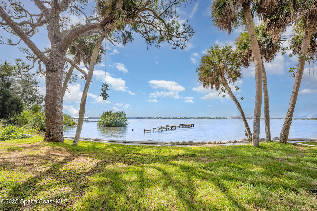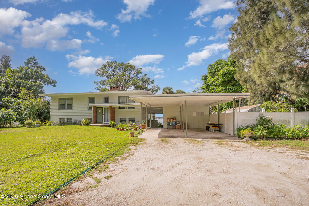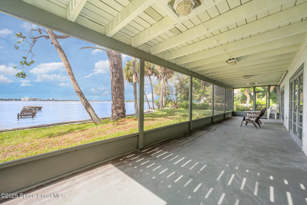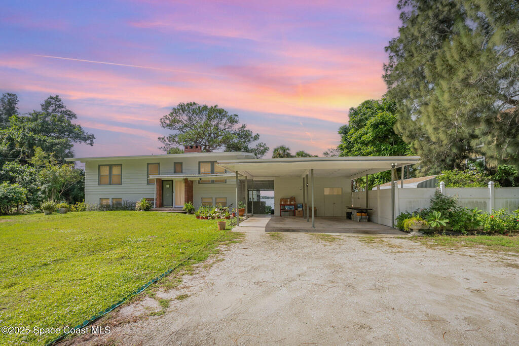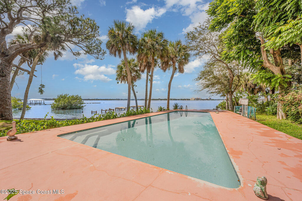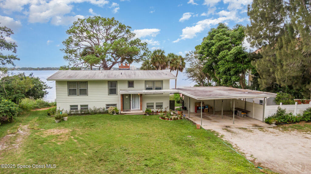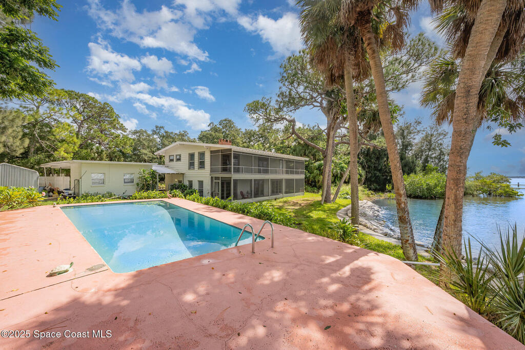 Stunning Indian River estate on coveted South Tropical Trail. Nestled down a long driveway, this home offers an upstairs living room with vaulted ceilings, a wood-burning fireplace, and French doors to a balcony under trusses, plus 3 bedrooms--one with balcony access--and 1 bath. Downstairs features a kitchen with laminate wood flooring, dining room, 2nd living area & 1 bedroom. Three sets of French doors downstairs open to a screened porch overlooking the river. Home also has ceiling fans throughout. Enjoy a beautiful pool, new 2025 seawall, 2018 roof, 2019 geo-thermal A/C, electrical panel 2011 and fresh exterior paint (2024). Home faces west for stunning sunsets and overlooks Cocoa Village across the water--watch the fireworks during the 4th of July from your backyard! .9-acre lot, no HOA, 2-car carport with laundry room and a storage shed. Survey on file--schedule your showing today!