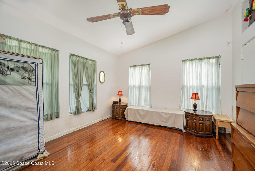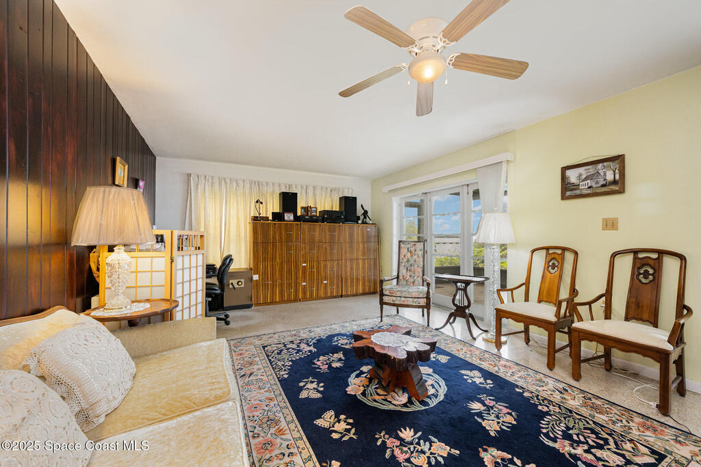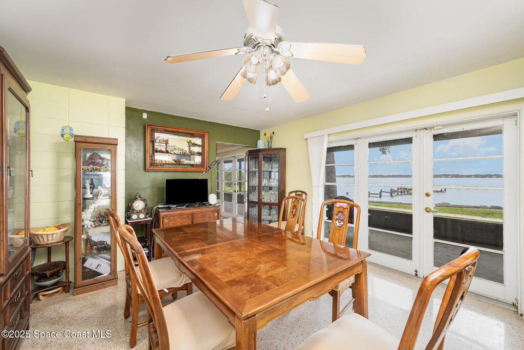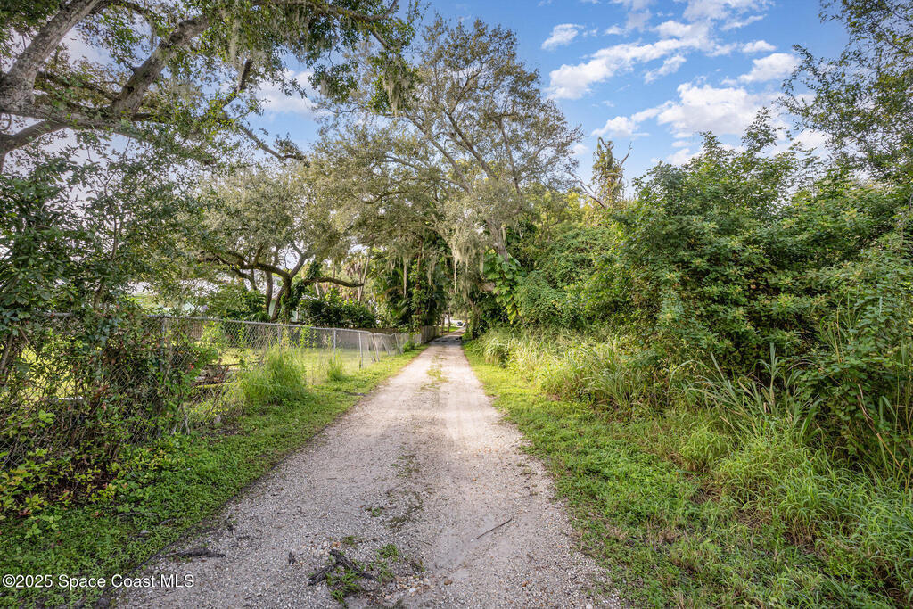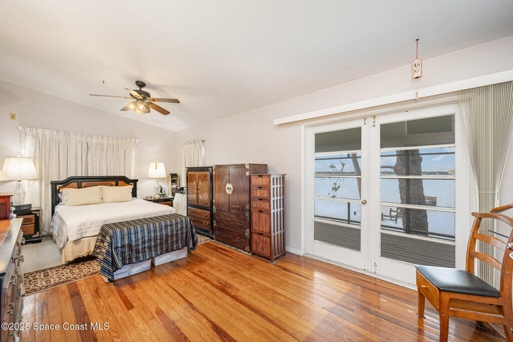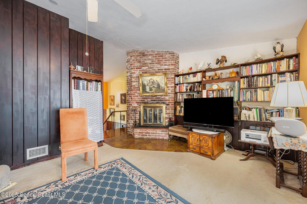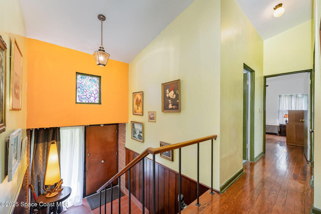 Stunning Indian River estate on coveted South Tropical Trail. Nestled down a long driveway, this home offers an upstairs living room with vaulted ceilings, a wood-burning fireplace, and French doors to a balcony under trusses, plus 3 bedrooms--one with balcony access--and 1 bath. Downstairs features a kitchen with laminate wood flooring, dining room, 2nd living area & 1 bedroom. Three sets of French doors downstairs open to a screened porch overlooking the river. Home also has ceiling fans throughout. Enjoy a beautiful pool, new 2025 seawall, 2018 roof, 2019 geo-thermal A/C, electrical panel 2011 and fresh exterior paint (2024). Home faces west for stunning sunsets and overlooks Cocoa Village across the water--watch the fireworks during the 4th of July from your backyard! .9-acre lot, no HOA, 2-car carport with laundry room and a storage shed. Survey on file--schedule your showing today!