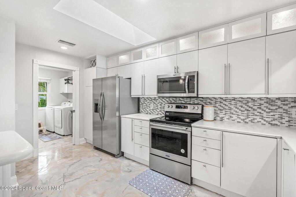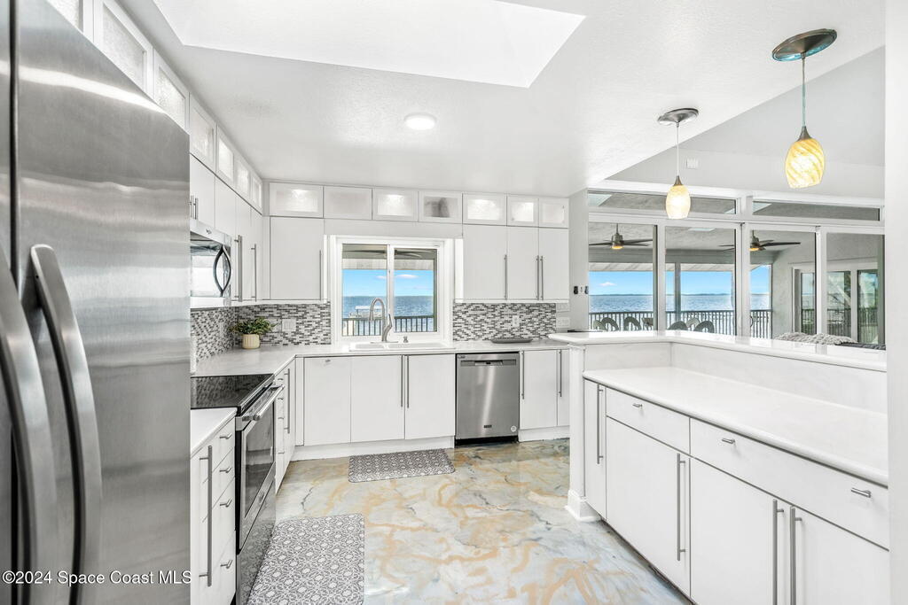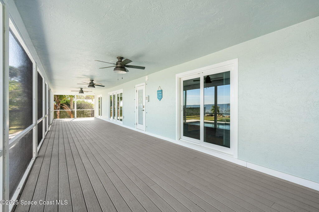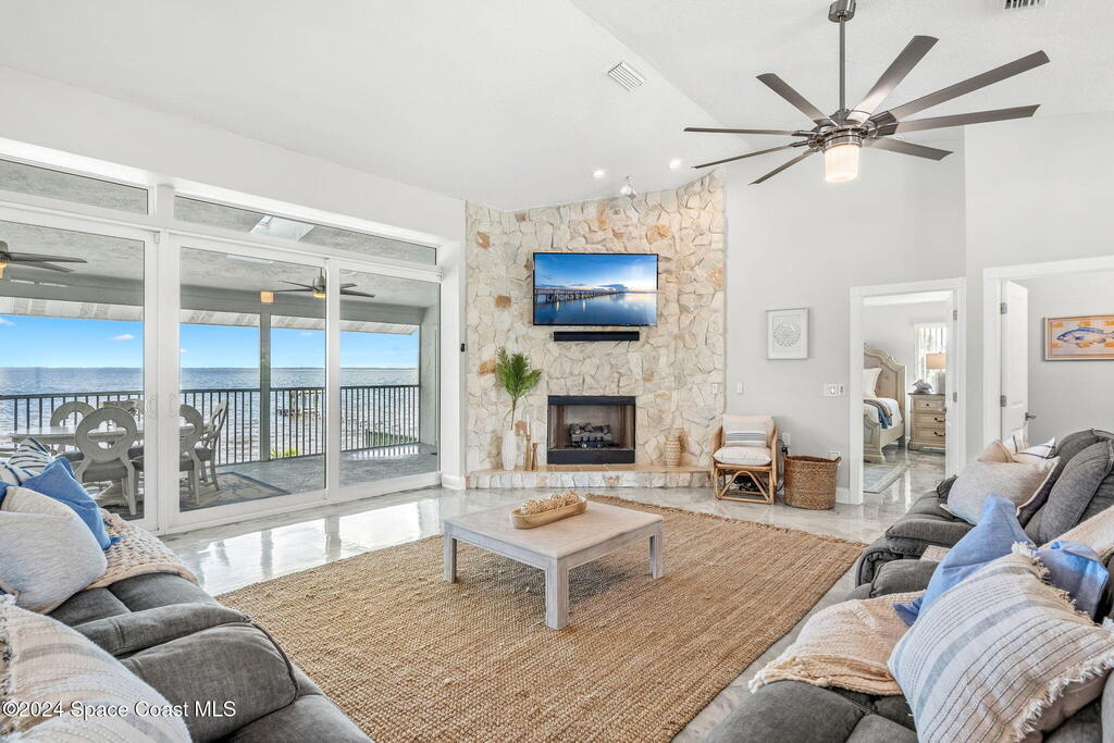 This ''Old Florida'' Riverfront Estate with pool and boat dock/lift is located 2 miles south of NASA Cswy offering direct water and rocket launch views....and both a 3-Car Attached Garage PLUS a 6-Car detached garage! Nestled on a private gated road directly on the river, it was built in 1986 with 4 bedrooms and 3.5 baths, and rests on .68 acres. There is a TON of living space both inside and out with a generous 3016 sq ft under air and 4776 sq ft under roof and over a 3-4 ft elevation. The home is exceptionally well-cared for with the prior two owners being general contractors. Level one is centered around a shared living space surrounded by three bedrooms and two full baths and opens to an absolutely magnificent 648 sq ft screened in patio (54'L x 12'D) overlooking the oversized natural-bottom heated pool and a generous 125' of direct Indian Riverfront. This truly is an entertainer's dream with an outdoor wet bar, and a fisherman's dream with your 300' private dock and boathouse.