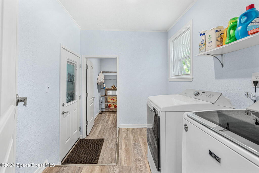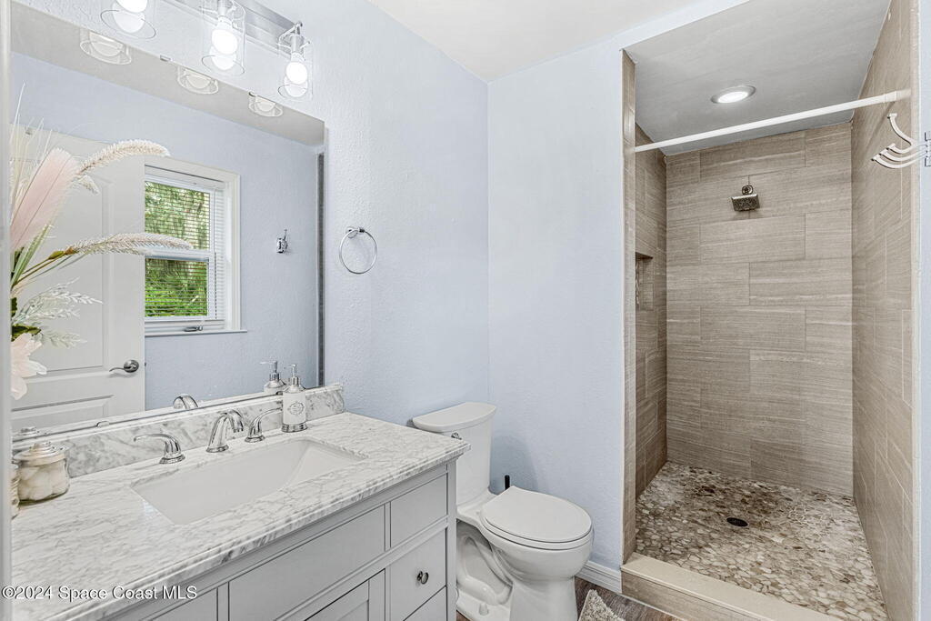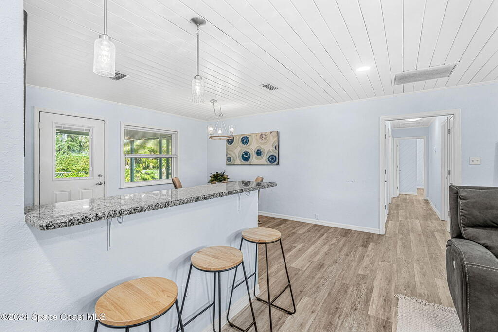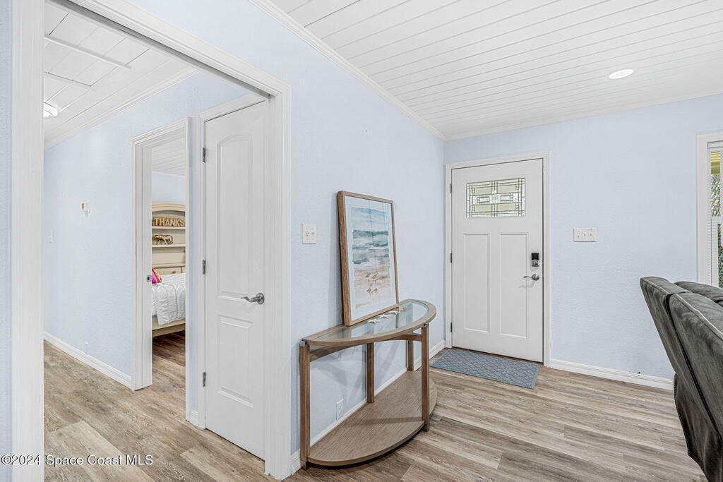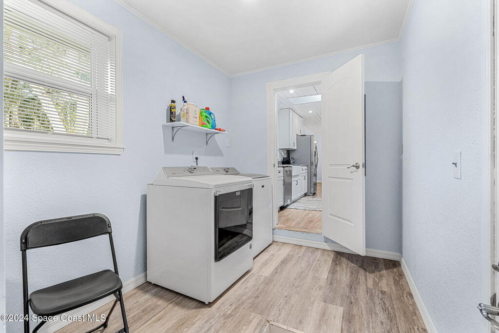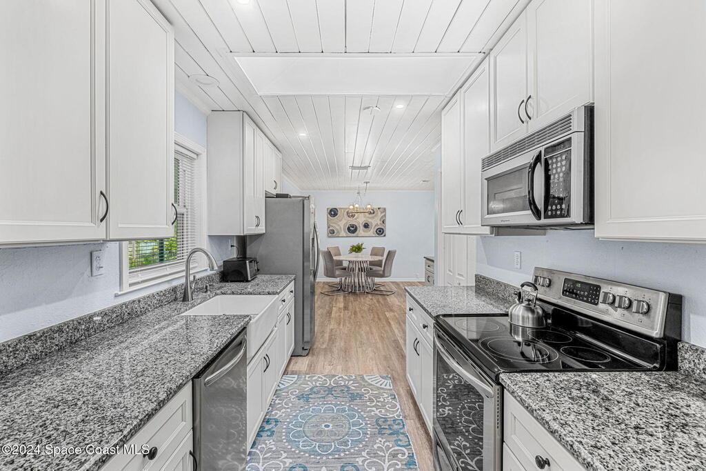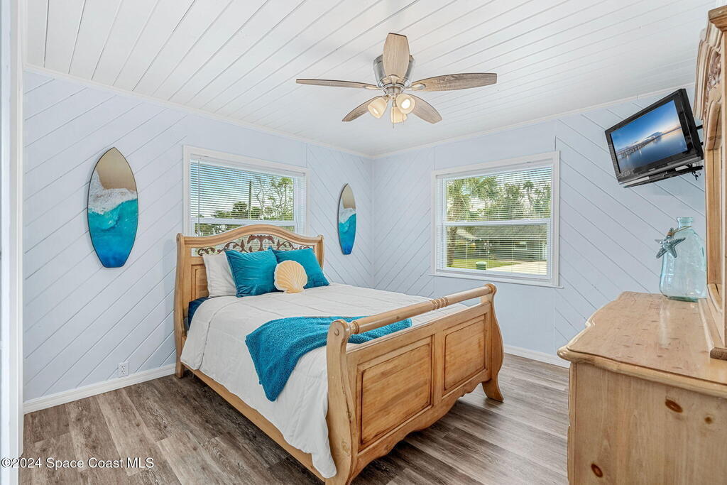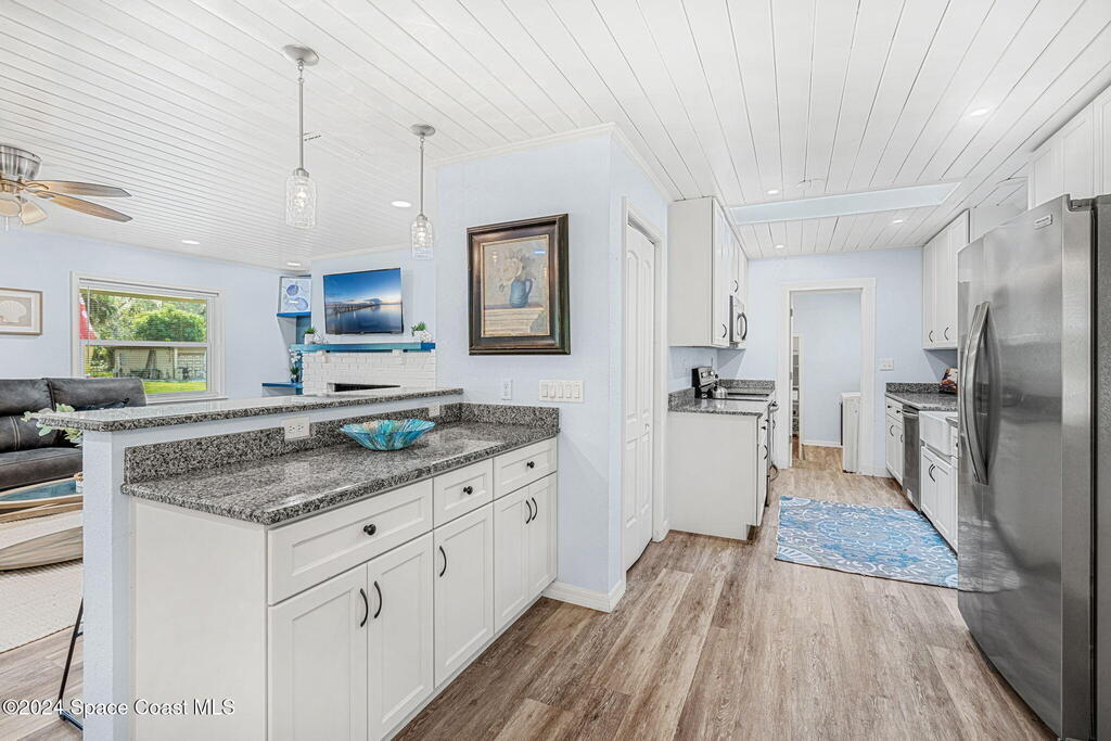 This beautifully crafted 3/2 is situated on a unique, private, and gated road in the quaint town of Bellwood, Titusville, FL. Fully renovated, the home offers 1,428 sq ft of living space and 2,630 sq ft under roof, nestled on a generous .29-acre lot.Inside, a stunning floor-to-ceiling stone fireplace and slat pinewood accents throughout perfectly complement the mature trees and Old Florida charm surrounding the property. The spacious kitchen features updated stainless steel appliances, ample granite counter space, custom cabinetry, and a large walk-in pantry. Built-in desk spaces and modern light fixtures throughout the home enhance both style and functionality, creating a comfortable and inviting atmosphere. The home also includes a 780 sq ft garage for parking, storage, and workspace. Constructed with cedar B&B siding and wood-frame construction, the property exudes rustic yet coastal charm. Features also include hurricane impact windows and doors. Roof installed 2015.