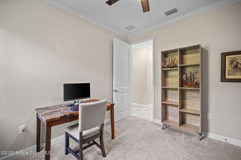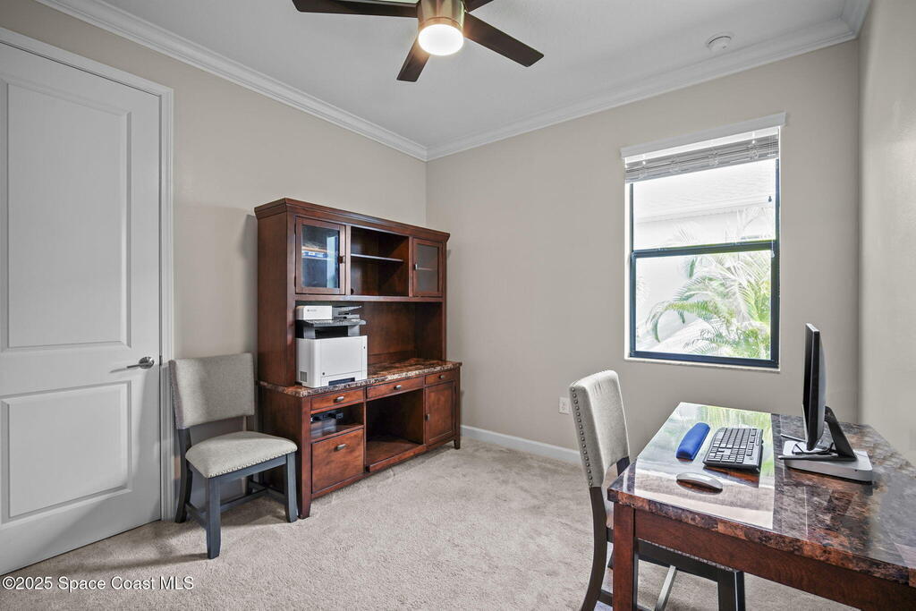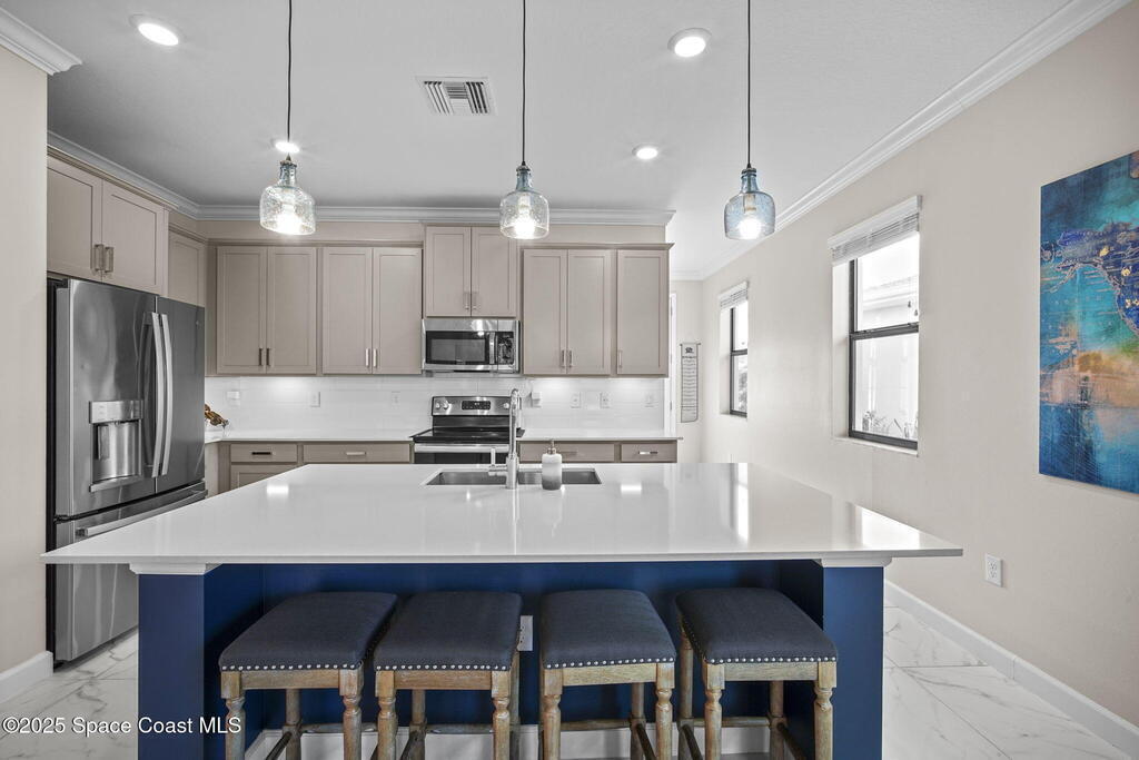 Discover resort-style living in the highly sought-after 55+ gated community of Bridgewater at Viera. This meticulously maintained 3bed, 2bath home built in 2021 is like new. Offering an inviting open floor plan with lovely design details throughout. Kitchen features quartz countertops, a large island, upgraded appliances, sliding cabinet shelves, under-cabinet lighting, neutral finishes to complement any decor. Upgrades include crown molding, porcelain tile flooring, a water filtration system, epoxy garage floor, LiftMaster garage door opener, a ClosetMaid system in the primary bedroom. Start your day with a cup of coffee on the expanded screened-in lanai as the sun rises--or unwind in the evening with a cocktail during golden hour. Experience the ultimate in active adult living with private clubhouse amenities, including a heated resort-style pool and spa, fitness center, group exercise studio, tennis, pickleball, bocce, movie theater and more. 45min to Orlando, 15min to the beach,