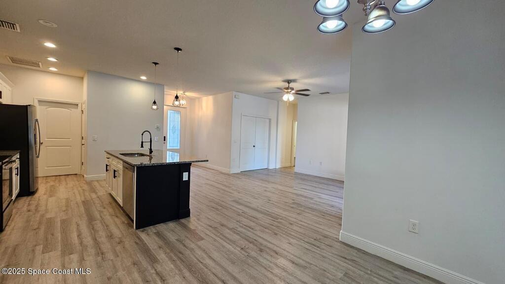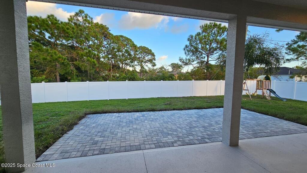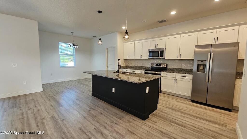 Welcome to this beautifully designed Contemporary Florida home built with comfort, efficiency, and modern style in mind. This 3-bedroom plus den/flex room (possible 4th bedroom), 2-bath, 3-car garage home features a bright open layout with vaulted ceilings and abundant natural light. The kitchen offers stainless steel appliances, soft-close cabinetry, and a large island perfect for entertaining. The split floor plan provides privacy for the primary suite with dual walk-in closets, double vanity, and walk-in shower. Enjoy outdoor living on the covered patio overlooking a spacious, manicured backyard with room for a pool or garden. Built with energy-efficient block construction, storm protection, and modern fixtures, this home offers both comfort and peace of mind. Located on a quiet east-west street near Bayside Lakes, schools, dining, and I-95, this move-in-ready gem combines curb appeal, quality finishes, and low-maintenance Florida living.