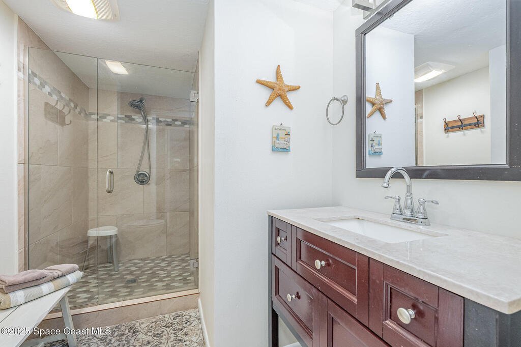 Enjoy OCEANFRONT living in this beautifully remodeled 2-bed, 2-bath Ground floor condo, just steps from the sand and a short walk to the Pier! Features include tile floors throughout, soft-close kitchen cabinets, granite counters, stainless steel appliances, and a breakfast bar. The primary suite offers a barn-door entry, walk-in closet, and updated bath with walk-in shower. The private 1-car garage includes laundry, a utility sink, and shower for rinsing off after the pool or beach. Updates include hurricane shutters, new A/C (2023), hot water heater (2021), new electrical panel, screen doors, ceiling fans, and balcony sliders with mirror-reflective film for privacy. Located in a solid two-story oceanfront community with healthy financials and all known assessments paid in full, this coastal gem blends quality, comfort, and an unbeatable location!