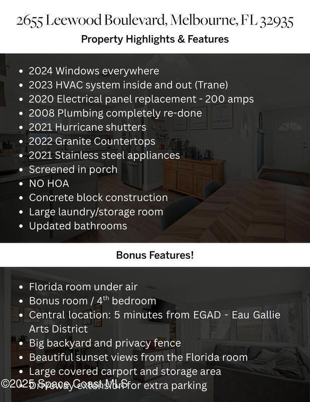 Beautifully updated and move-in ready, this Melbourne gem blends comfort, style, and peace of mind. Featuring 2024 windows & shutters, a 2023 Trane HVAC system, 2022 granite counters, and 2021 stainless steel appliances & flooring, plus updated plumbing! The open layout includes a bright Florida room under air, updated baths, and a bonus room perfect as a 4th bedroom or office. Enjoy gorgeous sunset views from the screened porch or private backyard with a full privacy fence. Concrete block construction, a newer 200-amp electrical panel, and hurricane shutters offer lasting security. With a large laundry room, covered carport, and no HOA, this home delivers space, freedom, and convenience--just 5 minutes from the vibrant Eau Gallie Arts District.