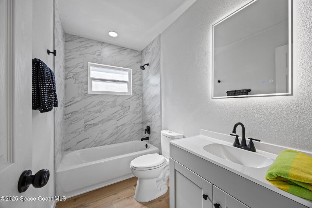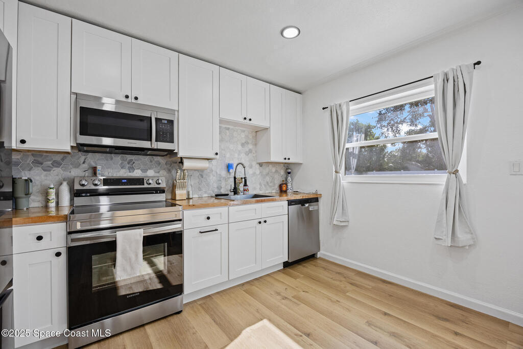 Turn-key and move-in ready! This beautifully updated 3-bedroom, 2-bath home is centrally located in the heart of Melbourne, close to shopping, dining, and the beaches. Inside, you'll find stylish vinyl plank flooring, LED lighting throughout, and a bright open layout. The kitchen boasts shaker cabinets, butcher block countertops, and stainless steel appliances, while both bathrooms feature custom-tiled showers and modern finishes. Enjoy peace of mind with 2024 updates including roof, A/C, electrical, plumbing, stucco, and instant hot water heater, along with hurricane impact windows and doors. Outside, a spacious two-car driveway and inviting back patio make it perfect for relaxing or entertaining. This home truly has it all--modern comfort, quality upgrades, and a fantastic Melbourne location!