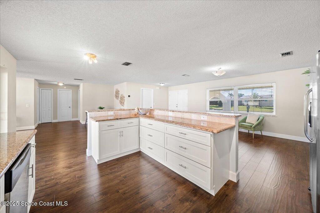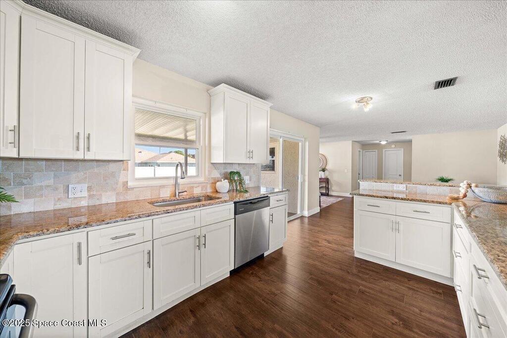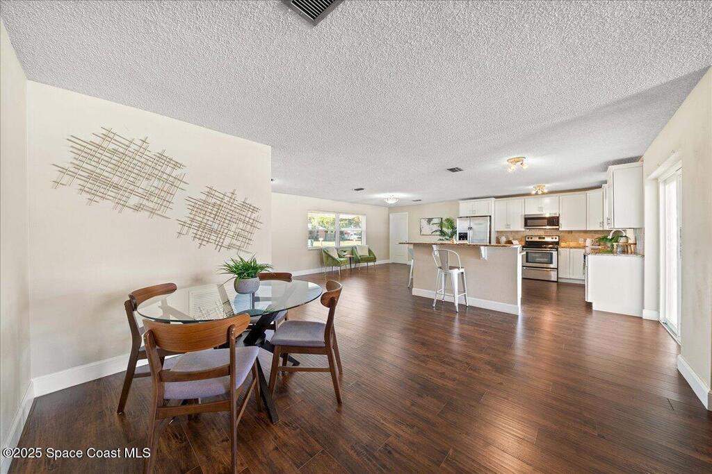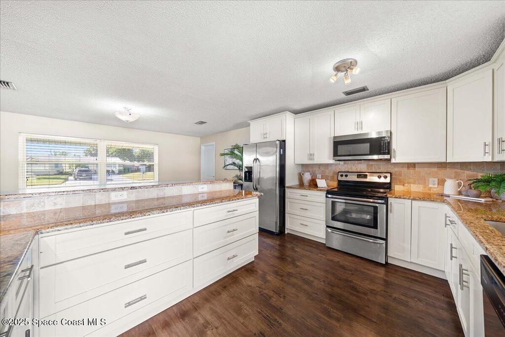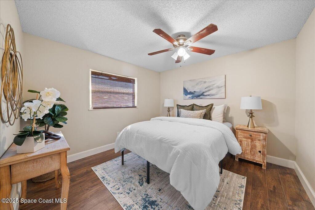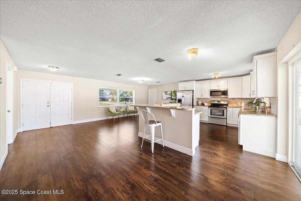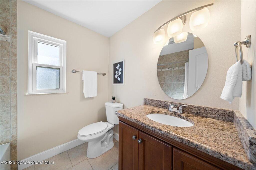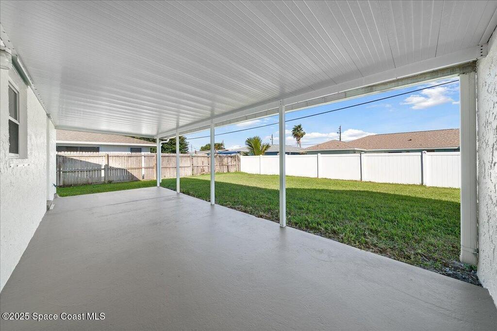 Move-in ready home in the heart of Satellite Beach's President Streets. This 3-bedroom, 2-bath residence features an open layout with warm wood-look flooring and a spacious kitchen complete with granite countertops, wraparound bar seating, and shaker-style cabinetry. The split floor plan provides privacy, and the large primary suite offers a walk-in shower, sizeable closet, and a private exterior door, ideal for a future pool bath. Recent updates include new exterior paint, upgraded electrical panel, hurricane shutters, and newer windows for added peace of mind. The arched entry and double front doors enhance the home's coastal charm, while the covered lanai and fenced backyard create the perfect setting for entertaining or adding a pool. An irrigation system and full two-car garage complete this inviting property. Located within walking distance to Spessard Holland Elementary, Delaura Middle, and Satellite High, this home truly embodies the best of beachside living.