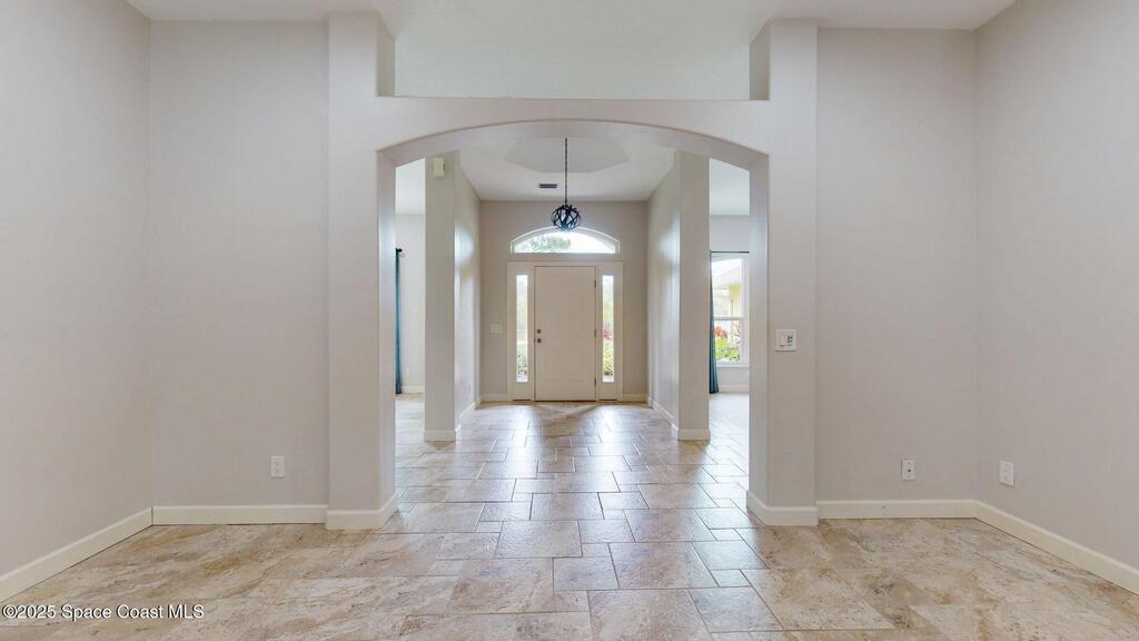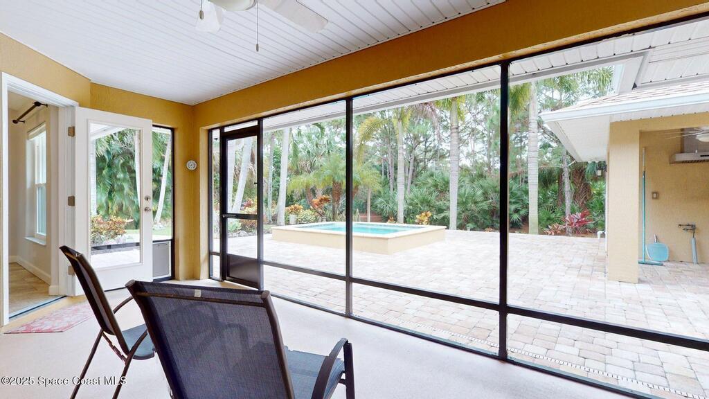This gorgeous home is better than new!! Boasting10 ft ceilings and was renovated inside and out in 2017! Walls were removed, all new lighting and custom porcelain tile was installed along w/ new double-pane windows and doors. In 2024, new roof, insulation, gutters, water heater and brick pavers. Kitchen was redesigned featuring custom maple cabinets w/ pull out features, top of the line appliances and quartz counter tops. Both baths boast the maple cabinets & quartz counters. Primary has a huge customized shower! Custom porcelain tile throughout! Large screened lanai overlooks a breath taking, private and peaceful oasis w/ 125 palms, brick pavers surrounding an in ground heated spool & a poured concrete work shop building w/ a 5X8 hurricane proof door. Covered space for a BBQ. Yard is fully fenced w/ a 14ft gate, perfect to park a boat or RV. This small, one circle, private community is located near the boat ramps and nature preserves. Don't miss out on this masterpiece!!!!.