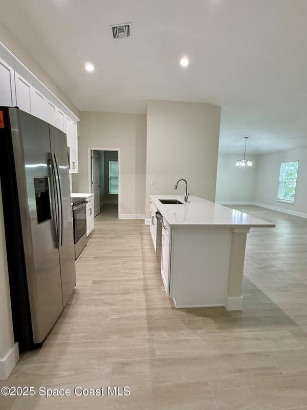 Spectacular new construction home with spacious layout. This great room floor plan features vaulted ceilings, 4 bedrooms, 2 bathrooms, 2 car garage, and covered patio. Kitchen features soft-close cabinet doors and drawers, quartz counter tops, under-cabinet lighting, stainless steel GE appliances, tiled backsplash, and one level island for eating/entertaining. The home has a large walk-in pantry and separate laundry room. All bedrooms have ceiling fans with remotes. Bathrooms feature soft-close cabinet doors and drawers, quartz counter tops, tiled shower/tub to ceiling, and brushed nickel plumbing/light fixtures. Flooring throughout is porcelain wood plank tile. This home is move-in ready with blinds installed at all windows and sliding glass door. Quiet neighborhood.