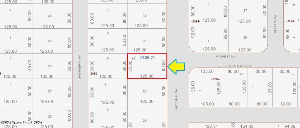 It's a .23 acre buildable residential lot with powerlines at the street available in Port Malabar Unit #49 of Palm Bay. Located in the southwest section, this lot is just 1.4 miles - 4 minutes to Bayside High School, 2.7 miles - 7 minutes to the Publix Supermarket, 14 miles - 30 minutes to Melbourne Airport, and 17.1 miles - 37 minutes to the beaches of Indialantic. From exit #176 of I-95 go west on Palm Bay Road for .7 miles, left on Minton Road for 3.3 miles, right on Jupiter Boulevard, quick left on DeGroodt Road for 2.5 miles, right on JA Bombardier Boulevard for .9 miles, and left on Madden Avenue. The lot will be on your right in .3 miles. Owner will only consider (a) a full price offer, and (b) a closing AFTER 01/02/2026 (this is for tax purposes).