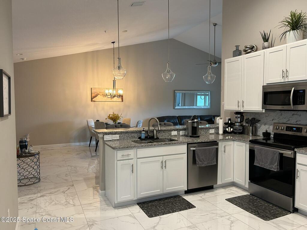 Experience comfort, style, and convenience in this beautiful 2nd-floor home, ideally located just 3 miles from The Shoppes at Viera with nearby golf, dining, A-rated schools, and easy I-95 access. The attached one-car garage includes a 220 outlet for EV parking. Inside, enjoy custom tile flooring throughout, an open layout with vaulted ceilings, and a designer kitchen featuring granite countertops and state-of-the-art stainless-steel appliances. The primary suite offers a walk-in closet and dual-sink vanity beneath a large mirror. Step onto the east-facing balcony to take in peaceful waterfront and sunrise views. Available furnished if desired--your perfect retreat awaits!