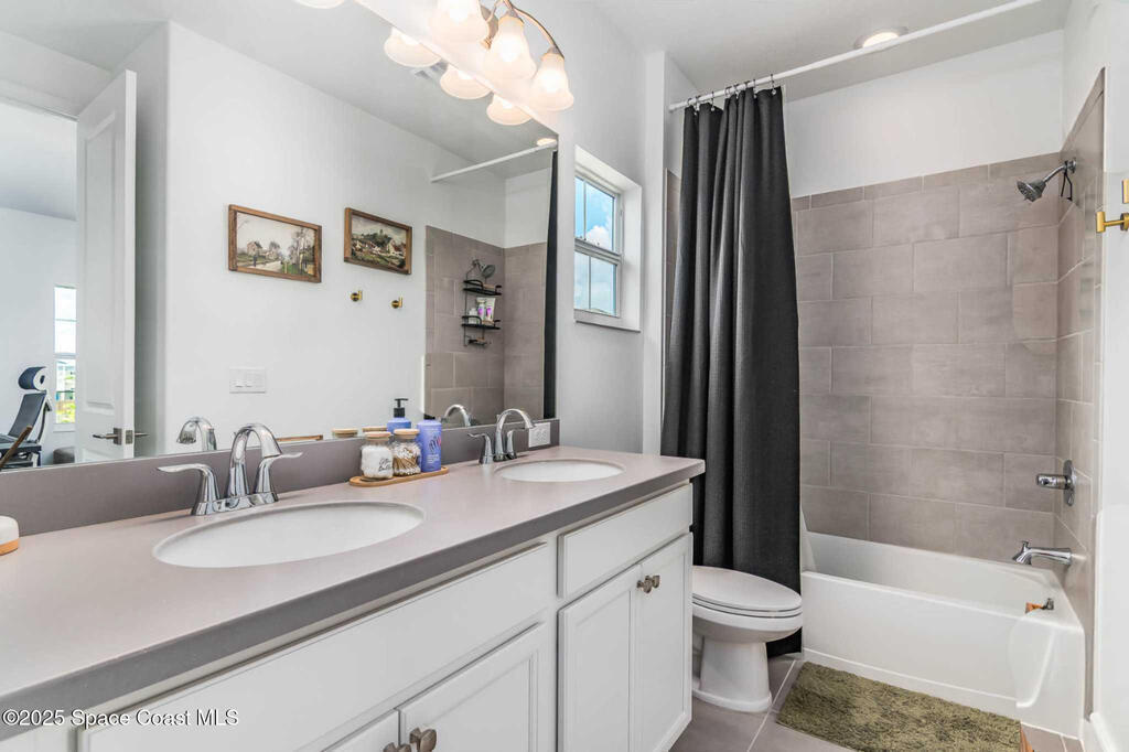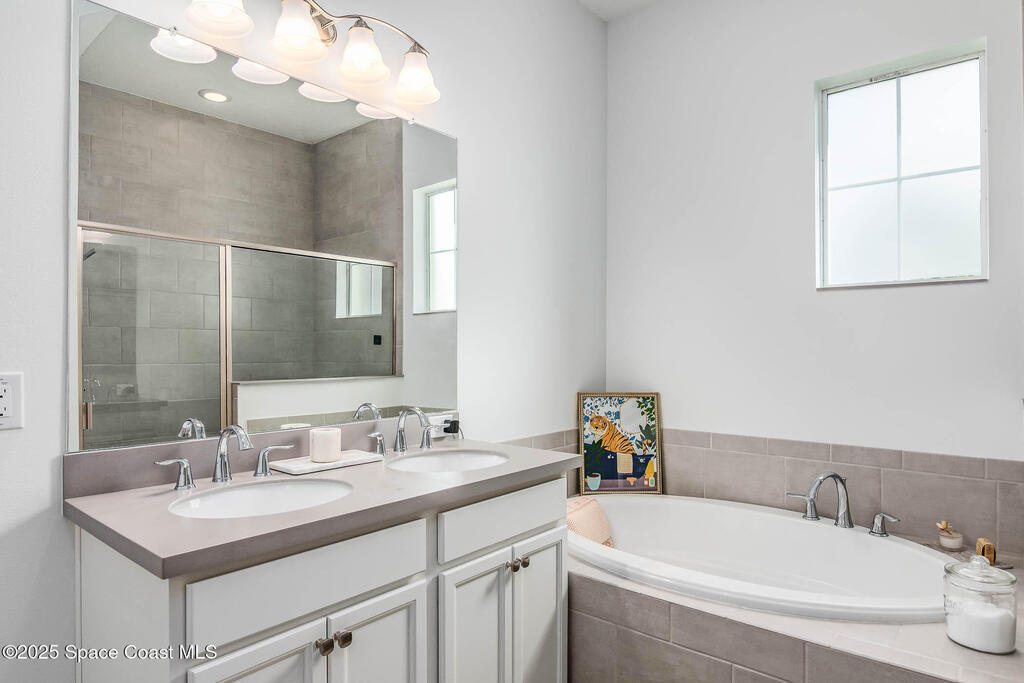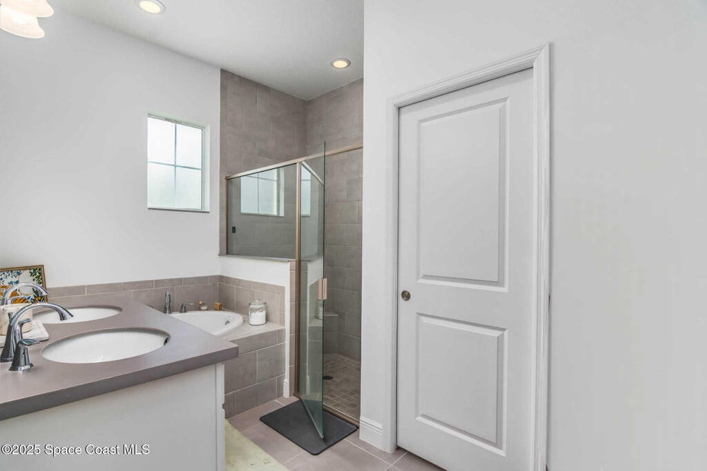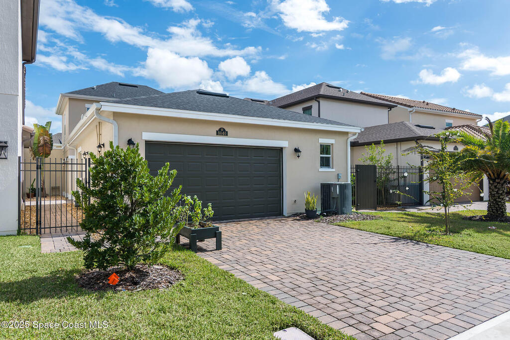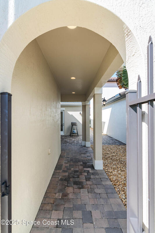 Experience modern luxury in this stunning 2022 home w/premium upgrades throughout. The kitchen space features a large center island, quartz countertops, Samsung Bespoke fridge, touch-enabled faucet & upgraded cabinetry. Elegant tile floors grace all living areas. An expansive great room w/10' ceilings & 9' sliding glass doors opens to a private 600 sqft paver courtyard--pre-plumbed for outdoor kitchen (water & gas). The owner's suite offers a walk-in closet, dual sinks, tub & shower. Upstairs,2 bdrms provide flexibility for guests or office, w/French doors to a private balcony w/lake views. Impact windows on 2nd floor & front provide storm protection. Smart home features include WiFi-enabled garage door, Nest front camera & door lock, plus security system on every door & window. Enjoy resort-style community amenities: 2 pools, tennis, pickleball & indoor basketball court. Minutes from Costco, Publix, A+ schools, Viera Hospital & The Avenues shops. Easy I-95 access & 20 min to the beach