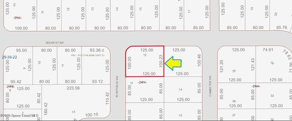 The 0.29 acre residential corner lot is available in Port Malabar Unit #53 of Palm Bay. Located in the SW rural section near the famous compound, the property has road access but does not have any utilities. The property will not be buildable until the City installs utilities in this section. The property is a tax deed sale; so please allow at least 45 days to close the transaction. From exit #173 of I-95 go west on Malabar Road to Minton Road. turn left on Minton, right on Jupiter Boulevard and quick left on DeGroodt Road for 2.5 miles. Turn right on JA Bombardier Boulevard for 2.6 miles, right on Carter Avenue for .2 miles, and right on Blanton Avenue for .3 miles to the corner with Cedar Street. The lot will be on the SE corner on your right. The buyer will get clear title to the property at closing.