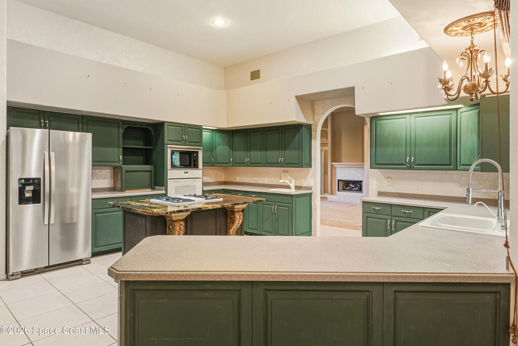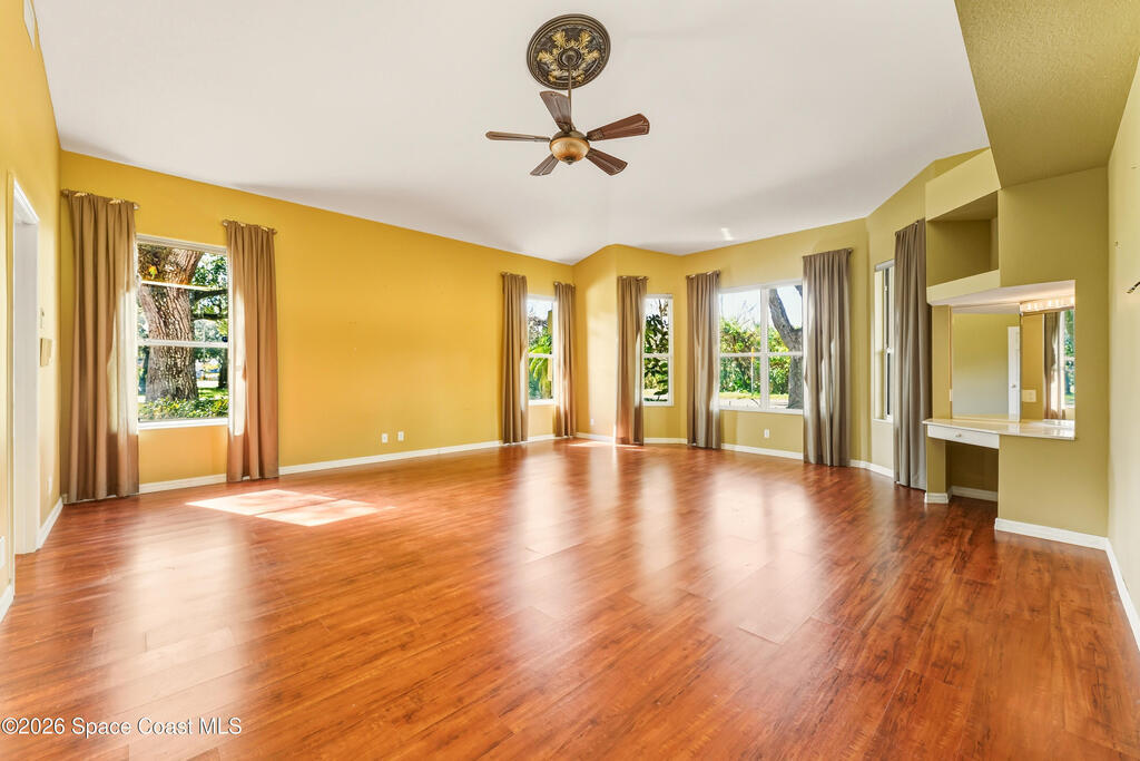 Spacious 4-bedroom, 3-bath split-plan home offering over 3,000 sq. ft. of comfortable living space. The open-concept layout features a center-island kitchen with an eat-in area, perfect for family gatherings or entertaining. A cozy fireplace anchors the main living area, creating a warm and inviting atmosphere. Enjoy both a large screened porch and an open-air paver patio overlooking a peaceful wooded backyard -- ideal for relaxing or outdoor dining. Additional highlights include a tile roof, circle driveway, built-in safe, and an indoor laundry room for everyday convenience. A truly inviting home combining generous space, thoughtful design, and natural surroundings. Close to shopping, entertainment, waterways, and interstates plus NASA, SpaceX, BlueOrigin, ULA, etc. are a short commute.