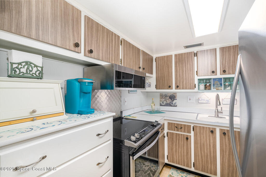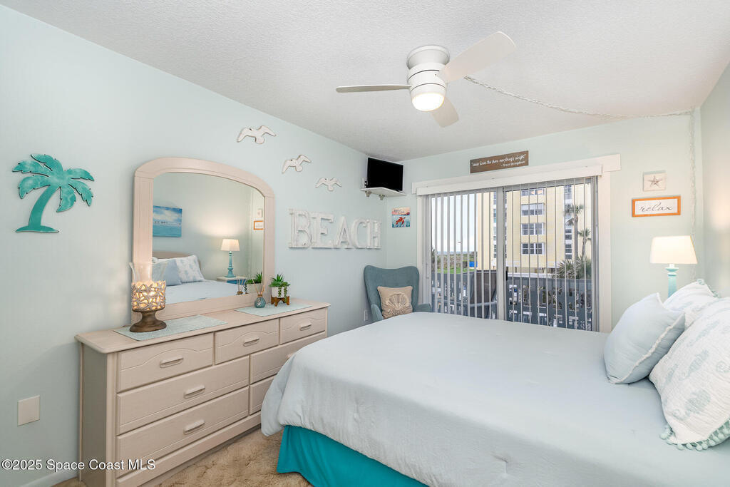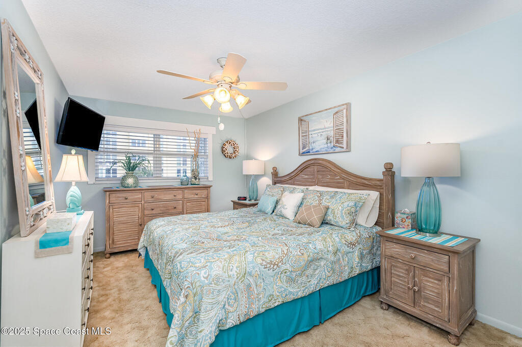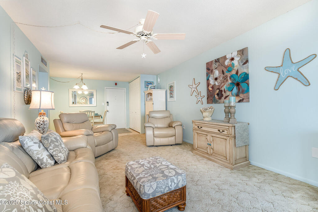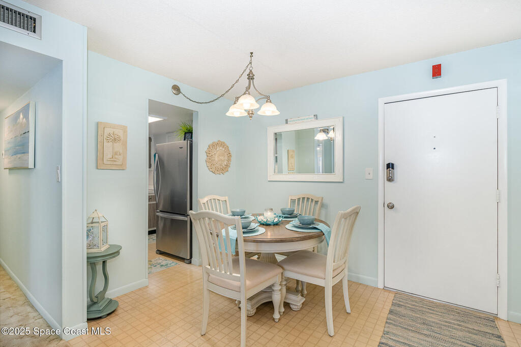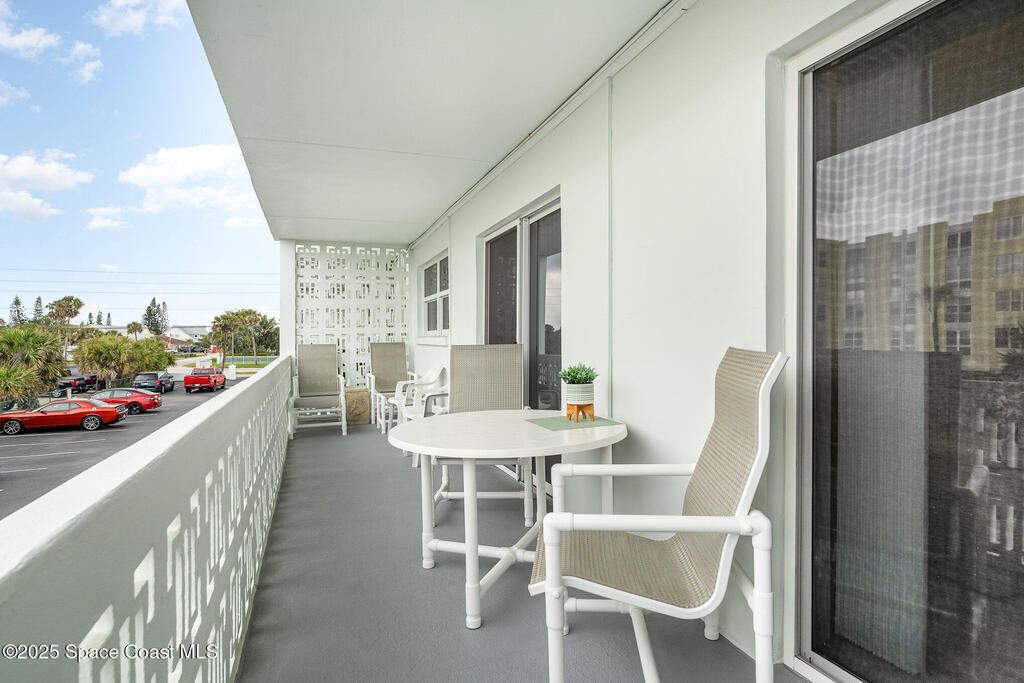 Escape to your own paradise in Cocoa Beach, with beautiful beaches, breathtaking sunrises, and a lifestyle that others Dream of. Stunning second-floor retreat featuring ocean views and an inviting open floor plan with fantastic decor. Kitchen offers stainless steel appliances with plenty of cabinet space. Dining area opens to the living space with sliding doors out to the covered patio. Two spacious bedrooms and a beautiful, remodeled bathroom with a walk-in shower. Condo has updated hurricane windows and sliders throughout with a new electrical panel and hot water tank 2025. Assigned parking, heated community pool and a splash pool for the little ones. HOA is fully funded, and all assessments have been paid. Come see what the Cocoa Beach Lifestyle is all about!