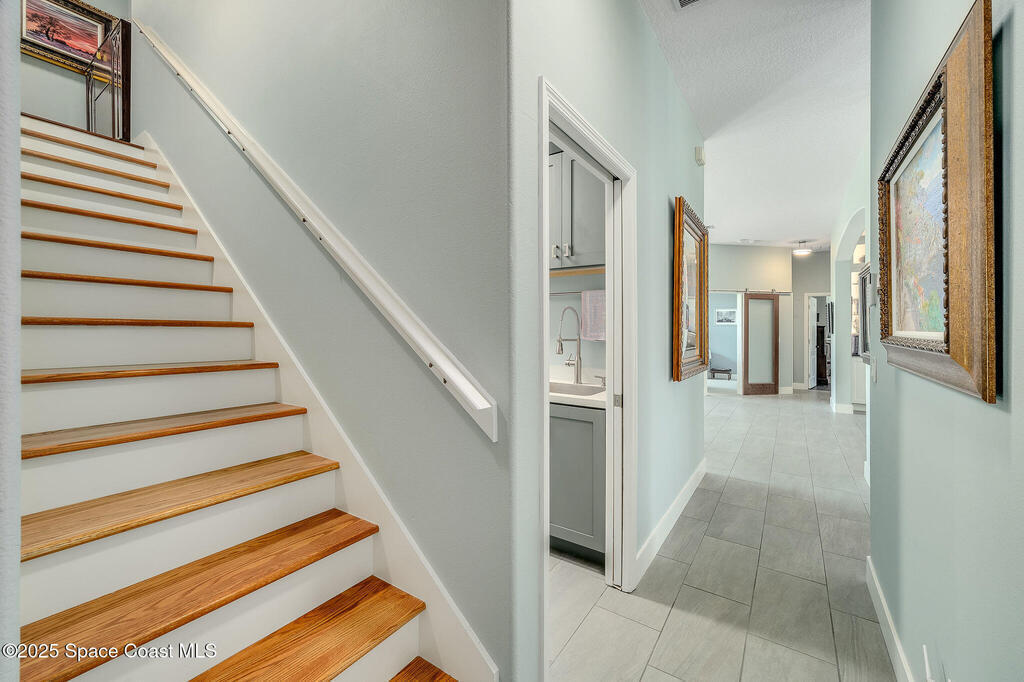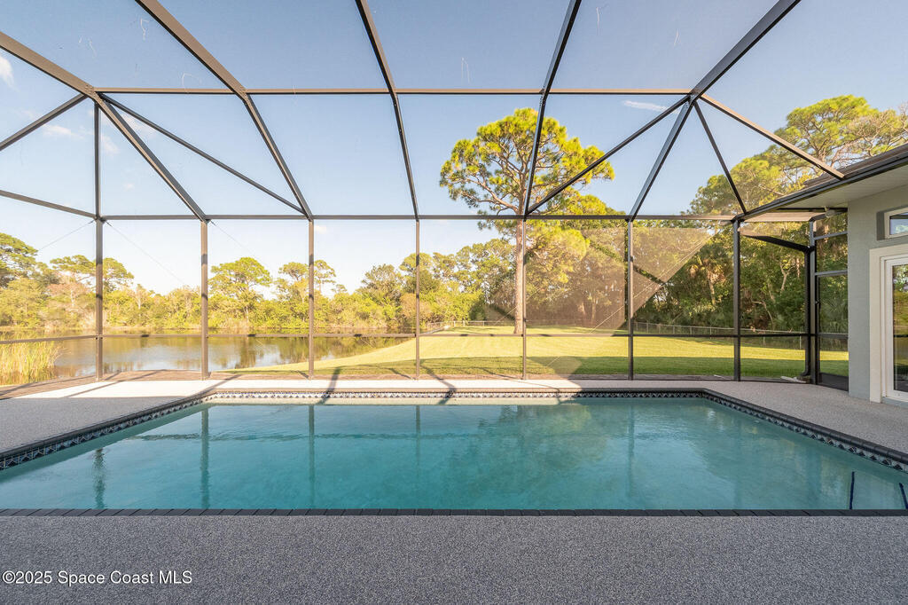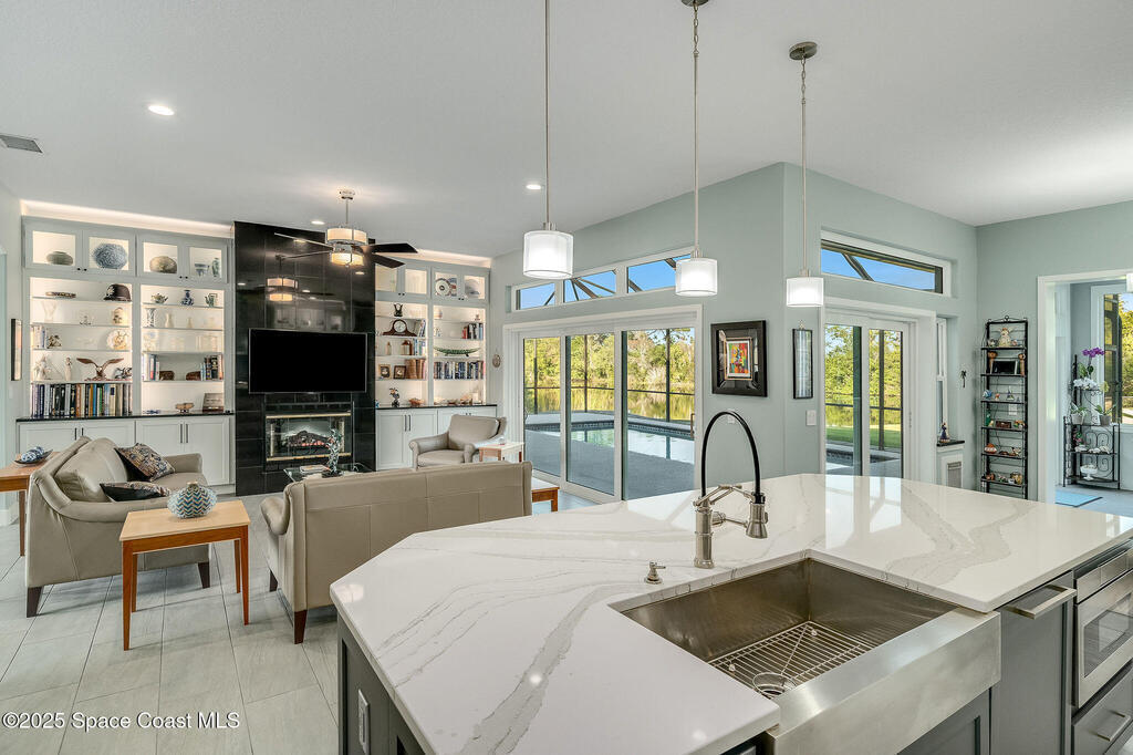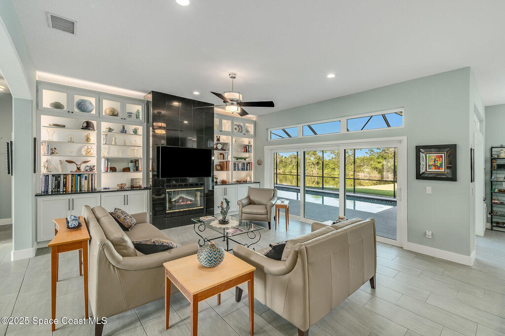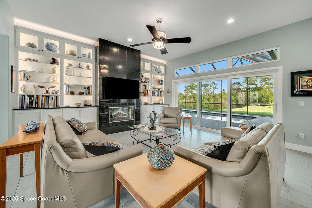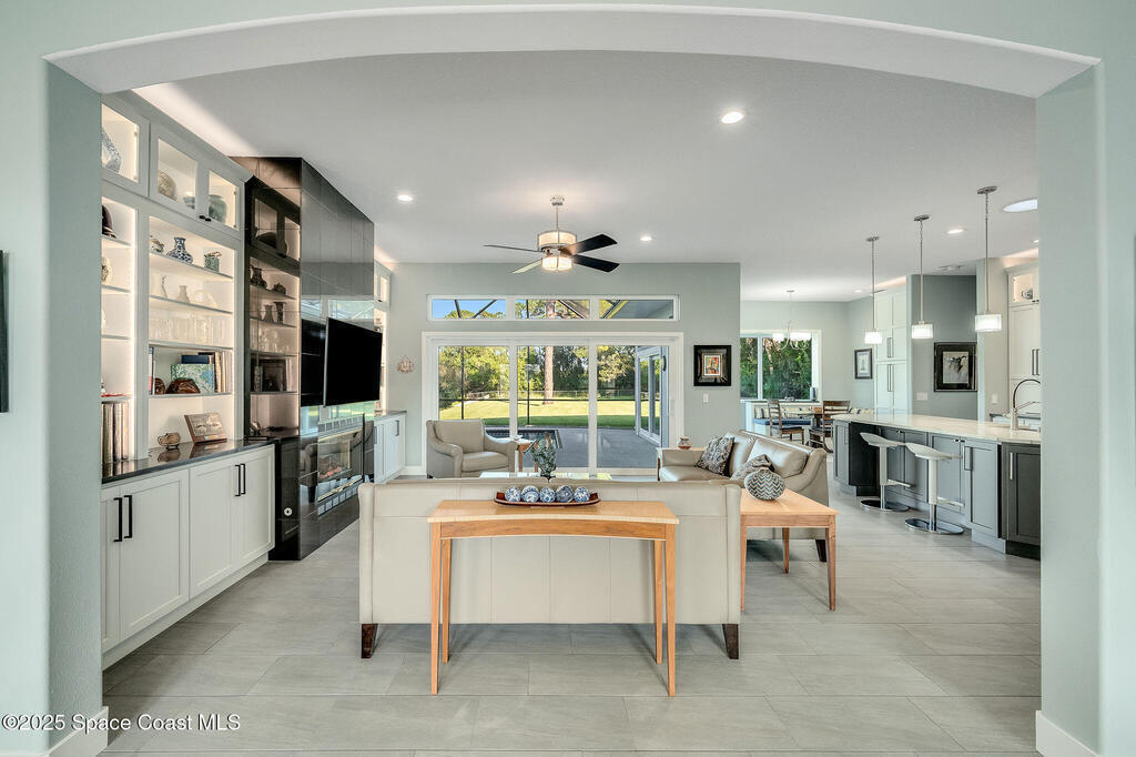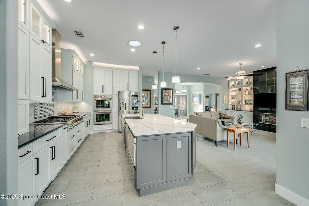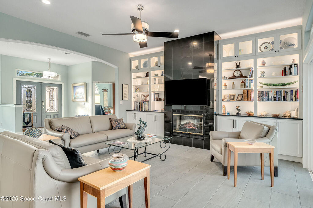 Discover refined lakefront living on 1.28 acres in The Trails, one of North Merritt Island's most sought-after communities. This 5-bedroom, 3.5-bath residence was fully remodeled in 2017 and offers luxury finishes, modern systems, and exceptional craftsmanship throughout. The interior showcases porcelain tile flooring in main areas, hardwood upstairs, and a chef's kitchen with StarMark soft-close cabinetry, glass-front uppers, under-cabinet lighting, and a full suite of Thermador appliances including double wall ovens, six-burner gas range, and dishwasher, plus a stainless French-door refrigerator and Sharp microwave drawer. Spa-inspired bathrooms feature frameless zero-threshold showers and granite or quartz counters. Additional highlights include a custom office with built-ins, an enclosed Florida room with mini-split A/C, Ecobee Smart Thermostat, tankless propane water heater, and newer Trane HVAC. The property features a 2-car attached garage and a 2022 constructed 2-bay RV