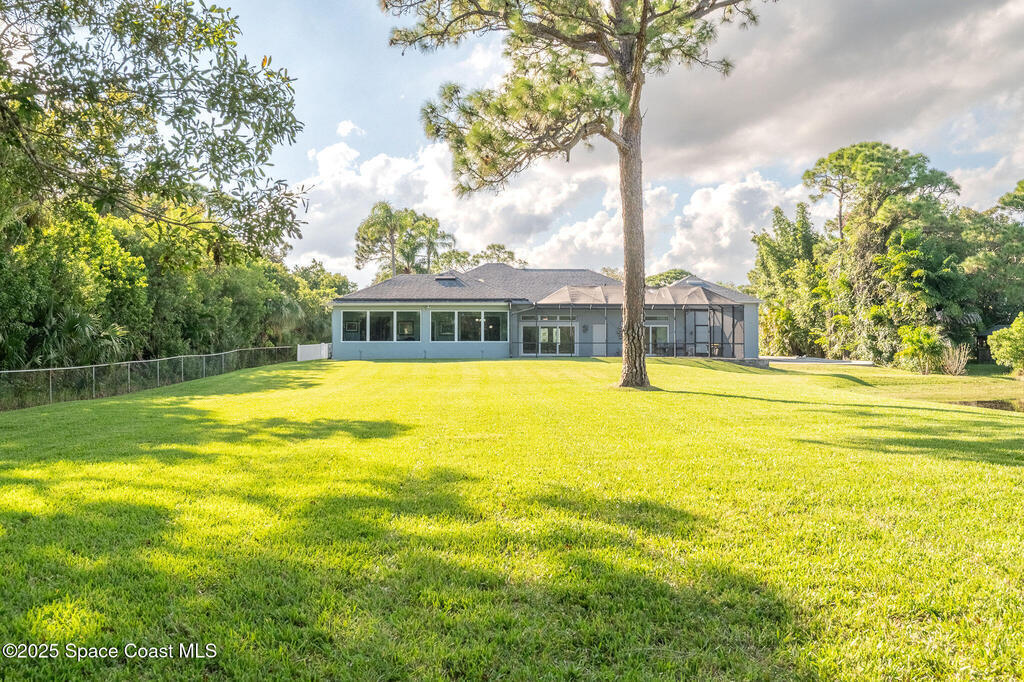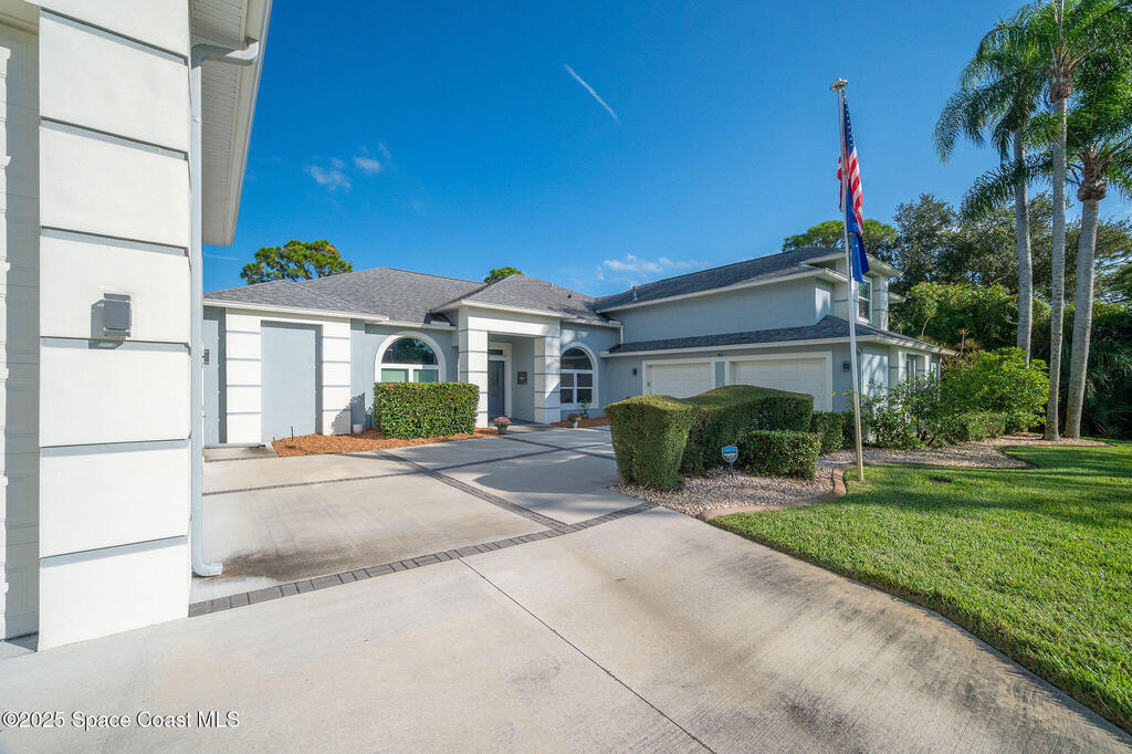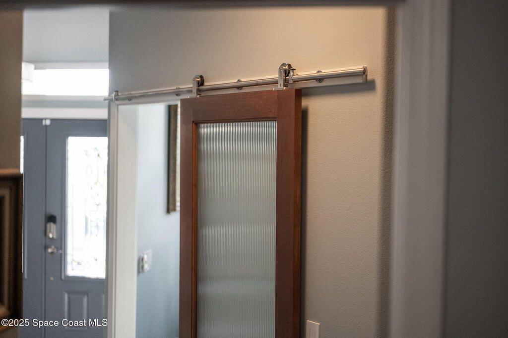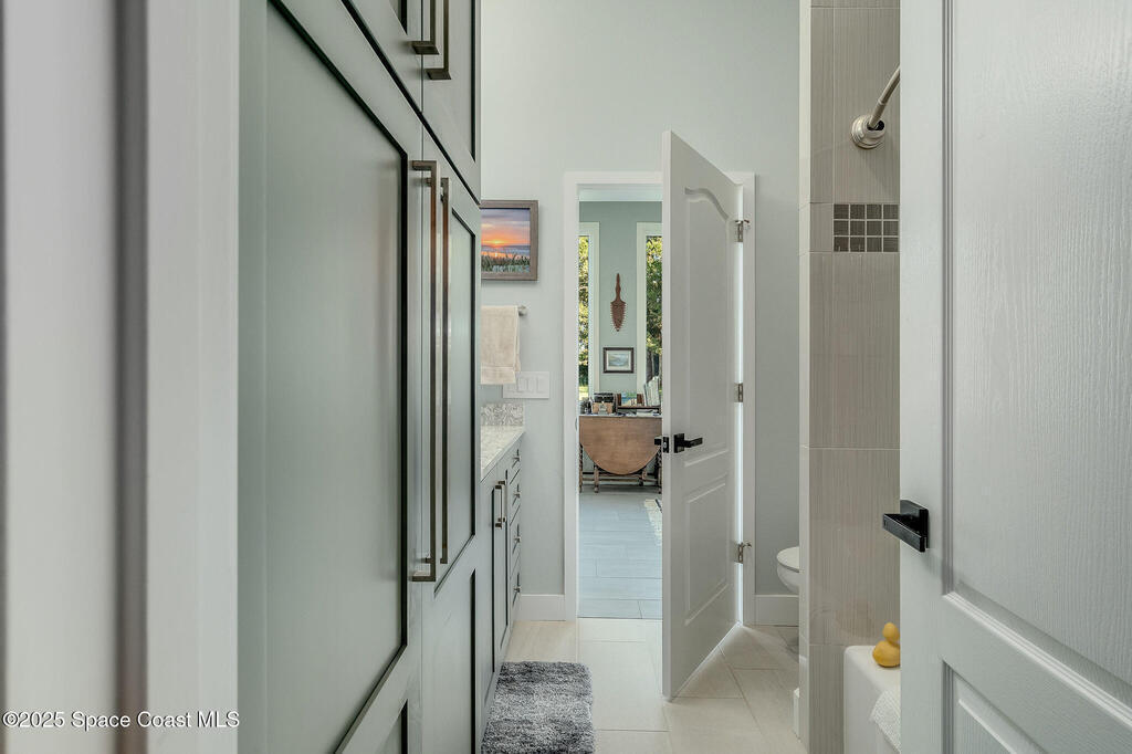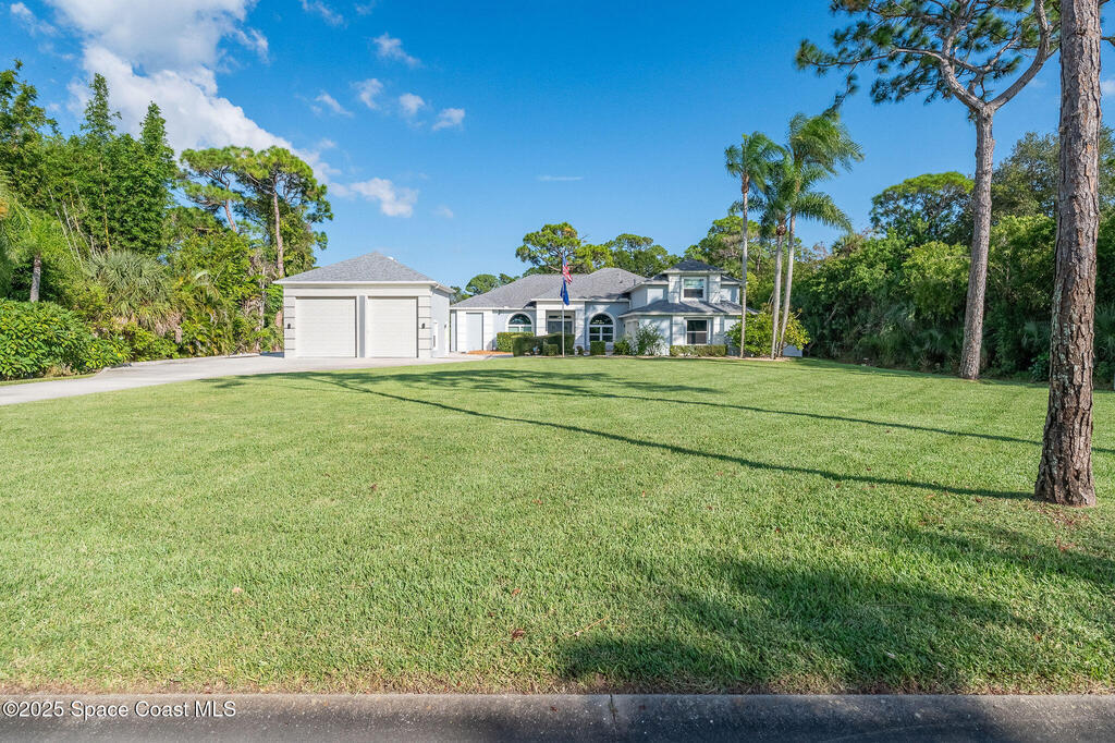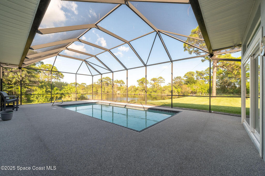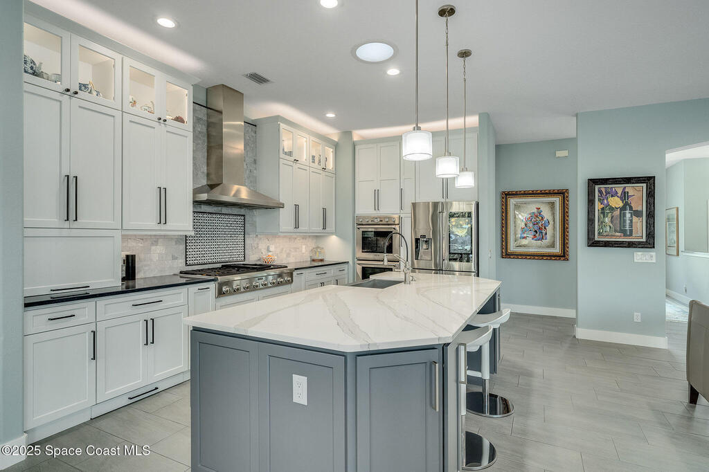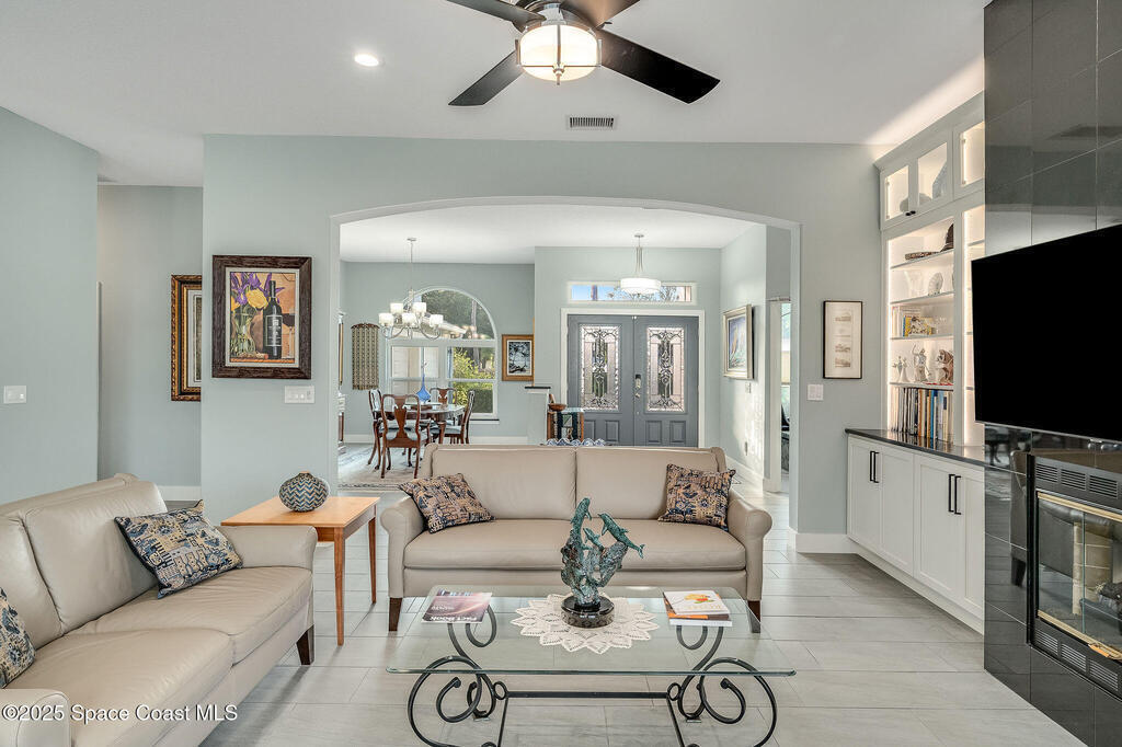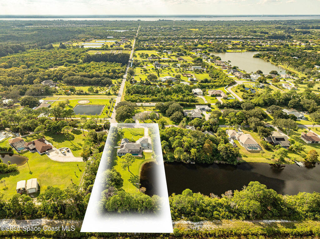 Discover refined lakefront living on 1.28 acres in The Trails, one of North Merritt Island's most sought-after communities. This 5-bedroom, 3.5-bath residence was fully remodeled in 2017 and offers luxury finishes, modern systems, and exceptional craftsmanship throughout. The interior showcases porcelain tile flooring in main areas, hardwood upstairs, and a chef's kitchen with StarMark soft-close cabinetry, glass-front uppers, under-cabinet lighting, and a full suite of Thermador appliances including double wall ovens, six-burner gas range, and dishwasher, plus a stainless French-door refrigerator and Sharp microwave drawer. Spa-inspired bathrooms feature frameless zero-threshold showers and granite or quartz counters. Additional highlights include a custom office with built-ins, an enclosed Florida room with mini-split A/C, Ecobee Smart Thermostat, tankless propane water heater, and newer Trane HVAC. The property features a 2-car attached garage and a 2022 constructed 2-bay RV