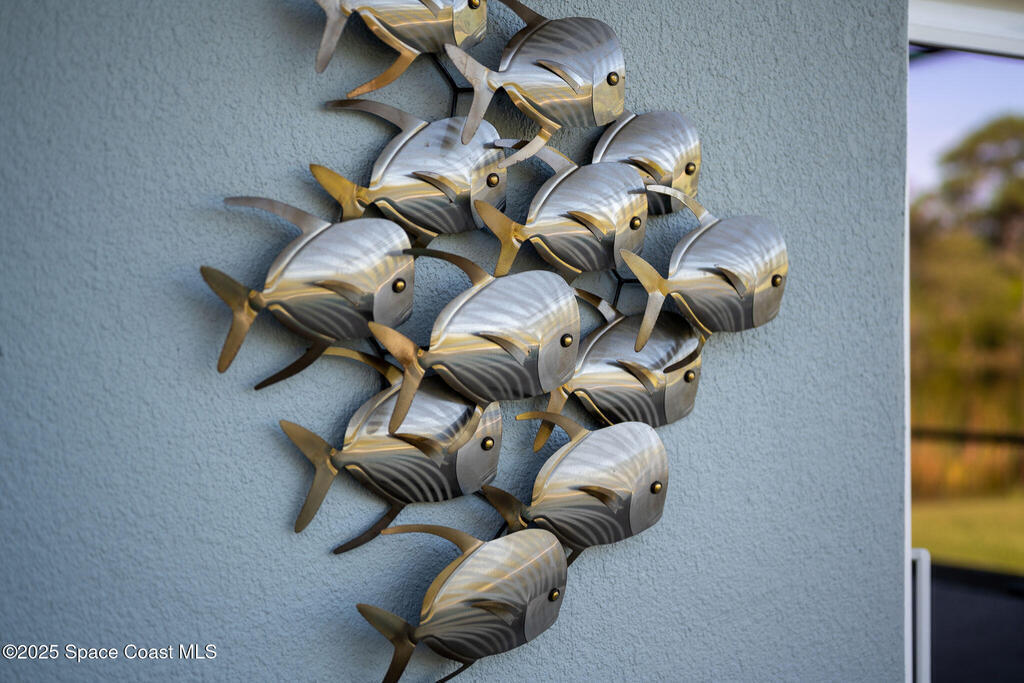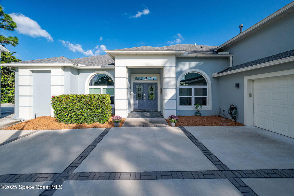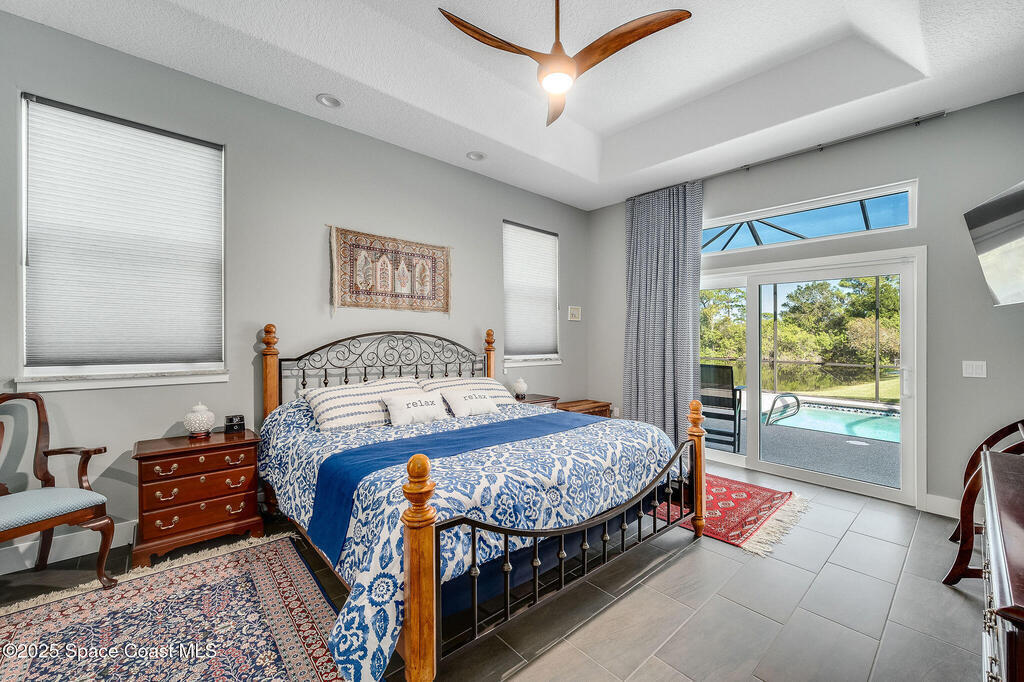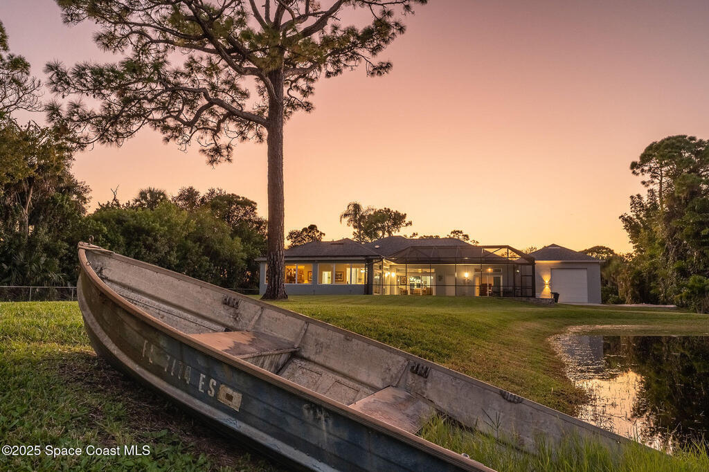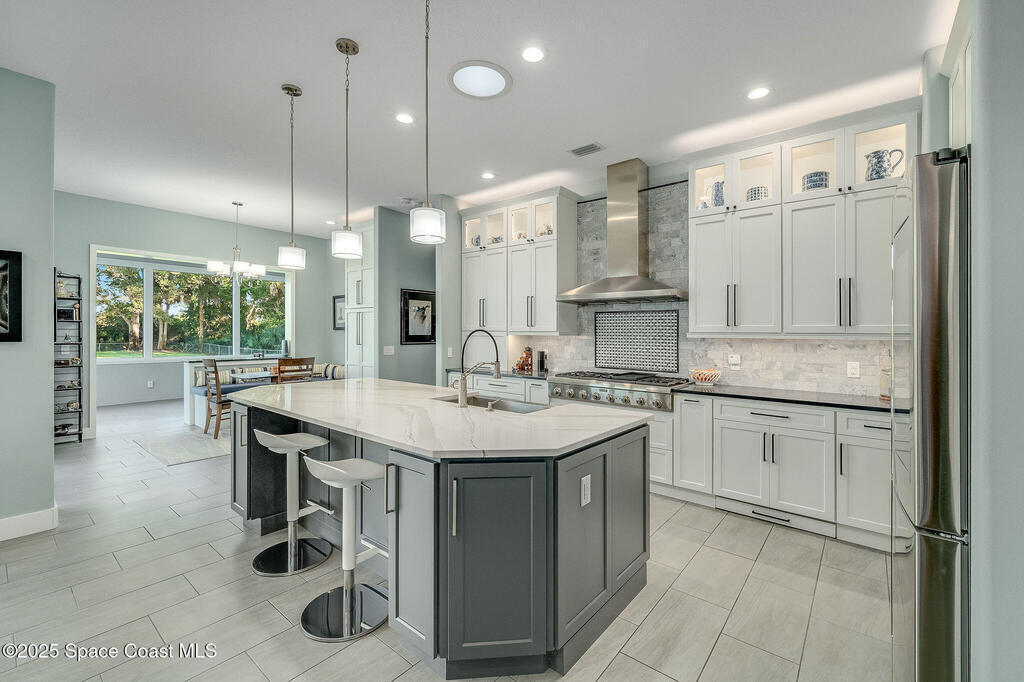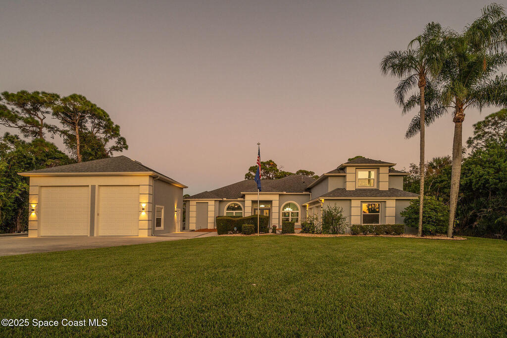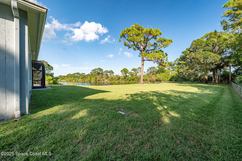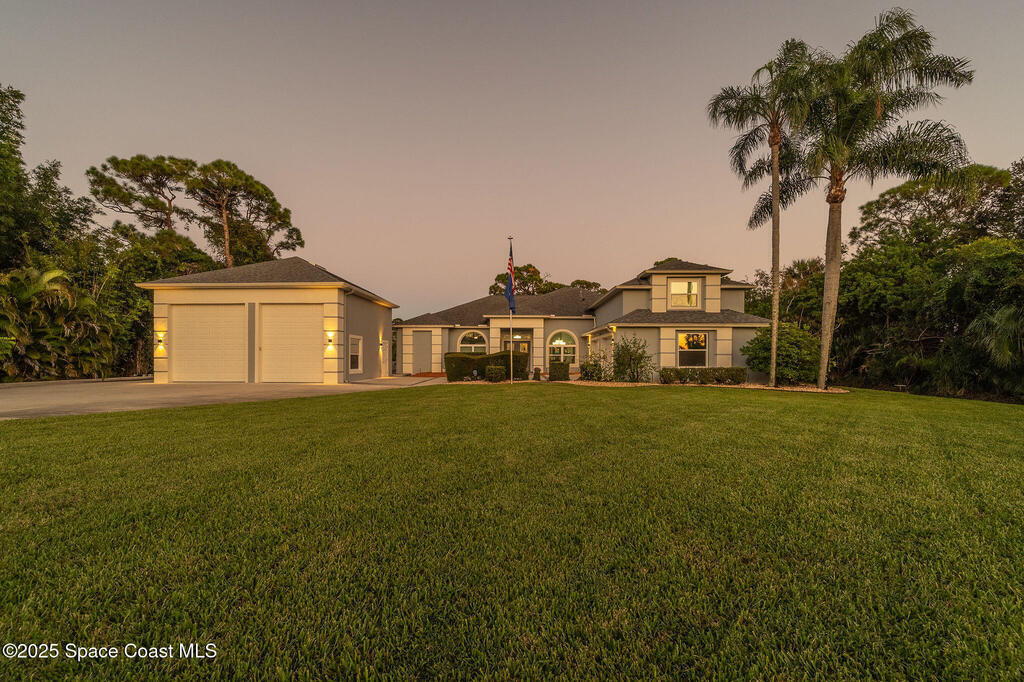 Discover refined lakefront living on 1.28 acres in The Trails, one of North Merritt Island's most sought-after communities. This 5-bedroom, 3.5-bath residence was fully remodeled in 2017 and offers luxury finishes, modern systems, and exceptional craftsmanship throughout. The interior showcases porcelain tile flooring in main areas, hardwood upstairs, and a chef's kitchen with StarMark soft-close cabinetry, glass-front uppers, under-cabinet lighting, and a full suite of Thermador appliances including double wall ovens, six-burner gas range, and dishwasher, plus a stainless French-door refrigerator and Sharp microwave drawer. Spa-inspired bathrooms feature frameless zero-threshold showers and granite or quartz counters. Additional highlights include a custom office with built-ins, an enclosed Florida room with mini-split A/C, Ecobee Smart Thermostat, tankless propane water heater, and newer Trane HVAC. The property features a 2-car attached garage and a 2022 constructed 2-bay RV